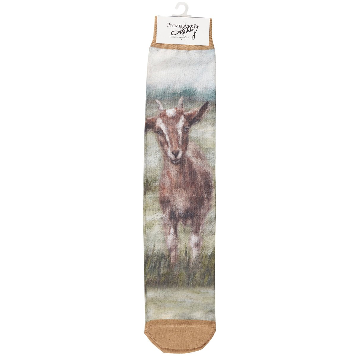 A pair of colorful knee-high socks from our Farmhouse Collection displaying a hand painted design of goats on each sock. Design is digitally printed and replicated from original artwork painted onto burlap canvas, giving the art a unique depth and texture. Socks feature a knee-high length to easily show off the full design. Our knee-high Goat socks come with a header card and a clear plastic hanger for display. A charming farm-themed gift perfect for everyday self-expression.