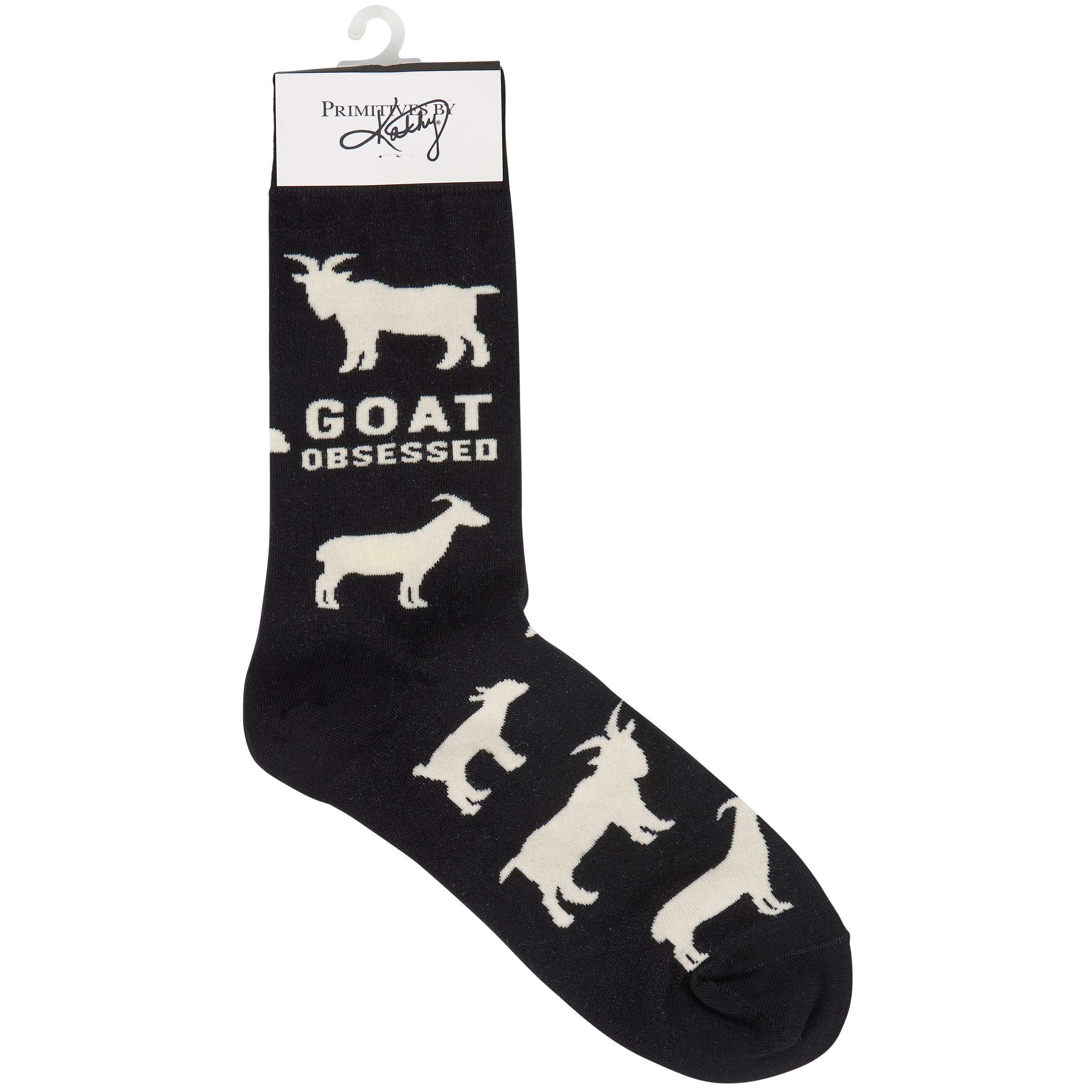 A pair of black and white socks from our Farmhouse Collection displaying various goat designs with a farm inspired sentiment that reads "Goat Obsessed." Socks feature a one size fits most design made with cotton, nylon, and spandex. Our Goat Obsessed socks come with a header card and a clear plastic hanger for display. A fun farm-themed gift perfect for everyday self-expression.