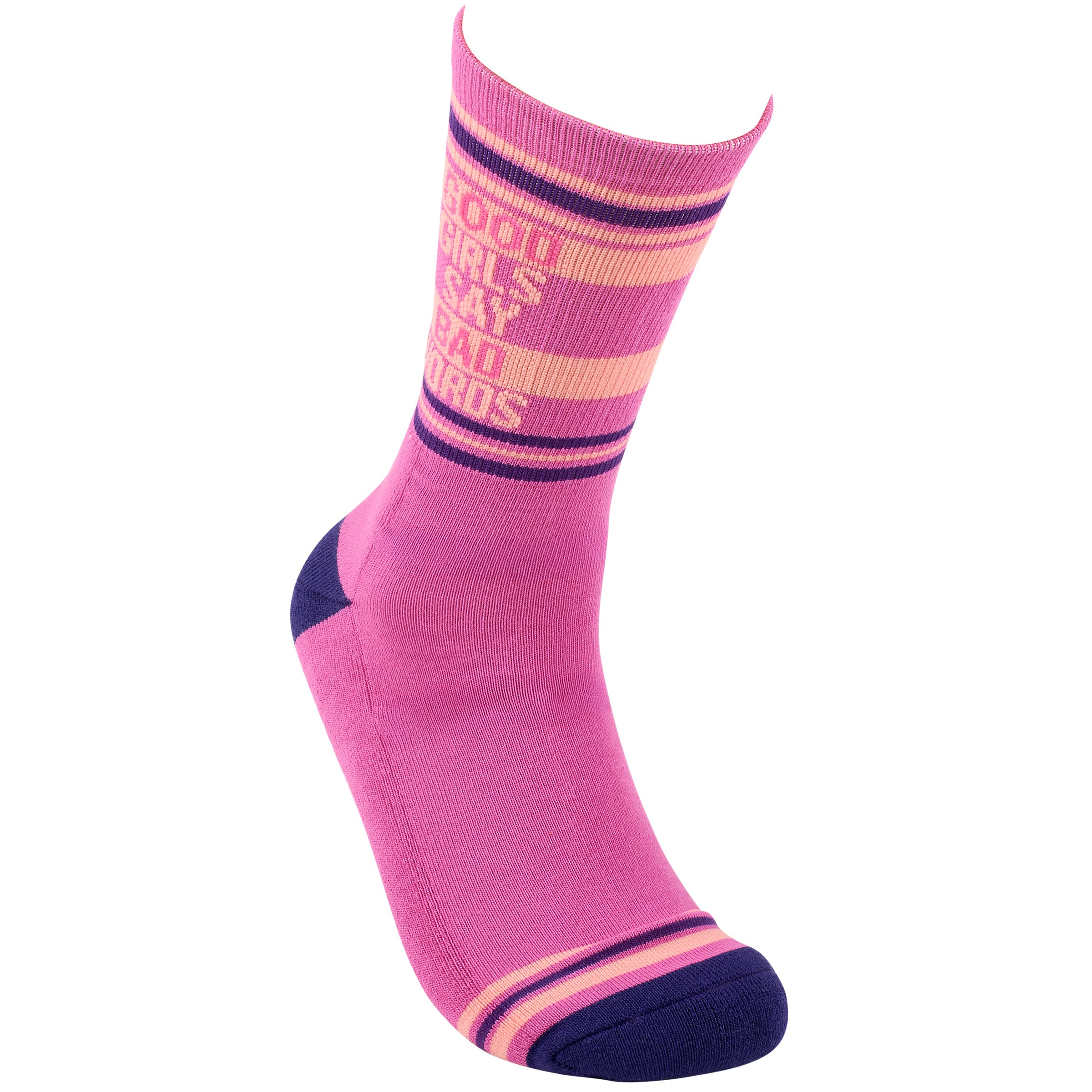 Our mid-calf varsity inspired socks are knitted with ribbed and striped designs for a comfy athleisure style and then finished with a questionable phrase. This fun pair of expressive socks displays a sassy sentiment that reads "Good Girls Say Bad Words" letting others know no matter who you are, some words are just too fun not to use. Questionables socks are made with cotton, nylon, and spandex to create a one-size-fits-most design. Each pair of socks is packaged on a clear plastic hanger with header card for graceful display in store. Our Good Girls Say Bad Words socks call back to a retro style but with modern mentality, perfect for making a statement while getting a giggle out of others. Colorful and cozy socks always make a great gift for everyday self-expression.
