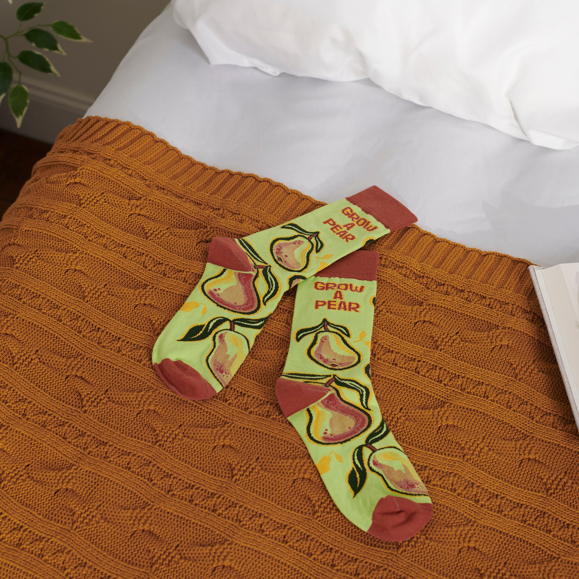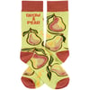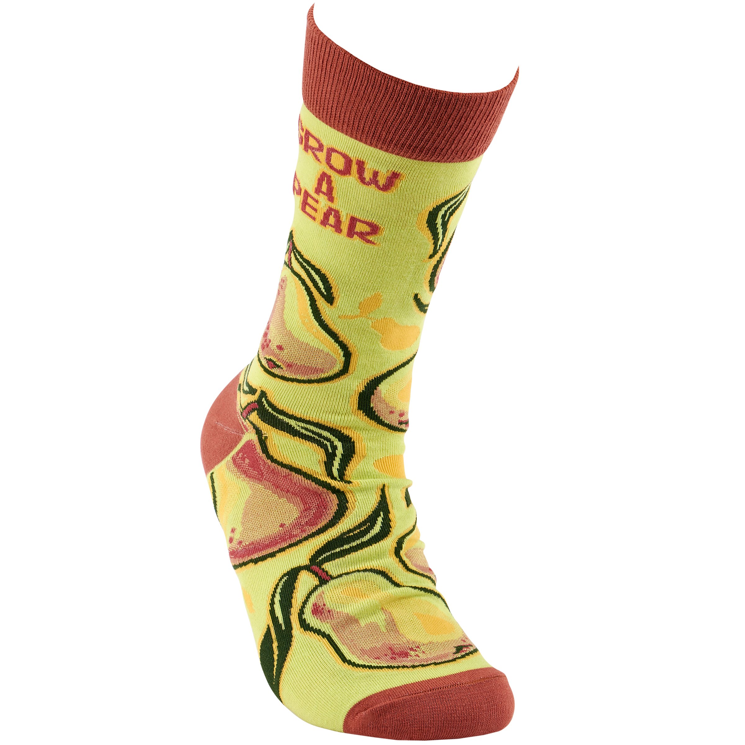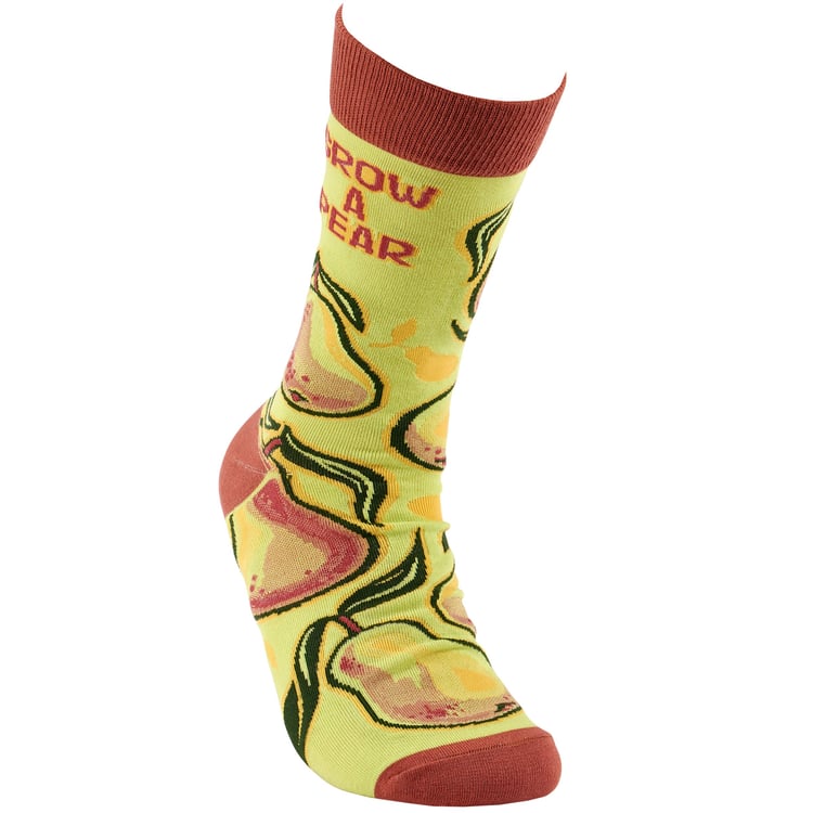 A pair of colorful socks from our LOL-Made You Smile Collection displaying playful hand illustrated designs of pears with a humorous sentiment that reads "Grow A Pear." These giftable socks are made with a cotton, nylon, and spandex blend for a one size fits most design. Our Grow A Pear socks come with a decorative header card and a clear plastic hanger for easy rack display and gifting. A funny gift perfect for everyday self-expression.