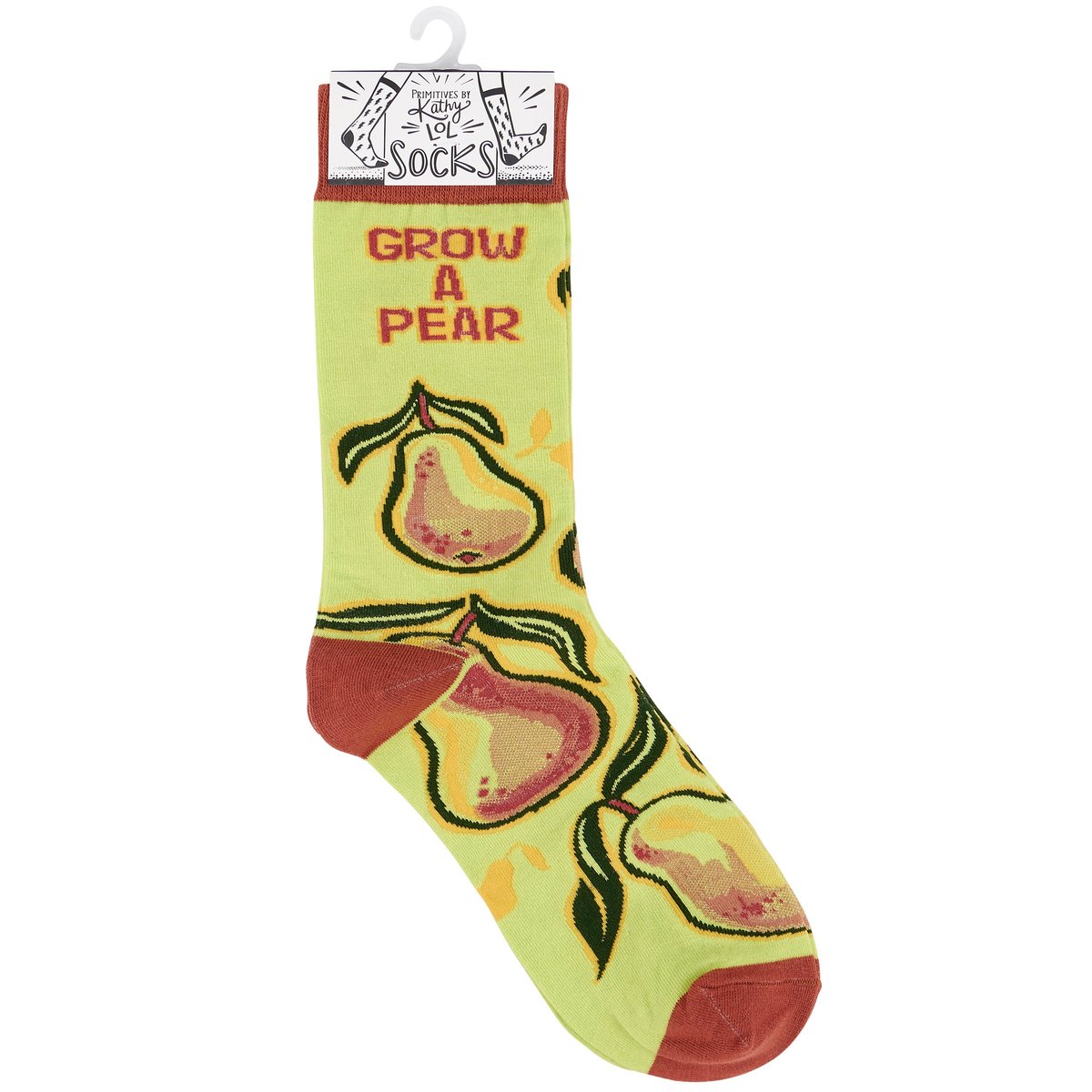 A pair of colorful socks from our LOL-Made You Smile Collection displaying playful hand illustrated designs of pears with a humorous sentiment that reads "Grow A Pear." These giftable socks are made with a cotton, nylon, and spandex blend for a one size fits most design. Our Grow A Pear socks come with a decorative header card and a clear plastic hanger for easy rack display and gifting. A funny gift perfect for everyday self-expression.