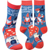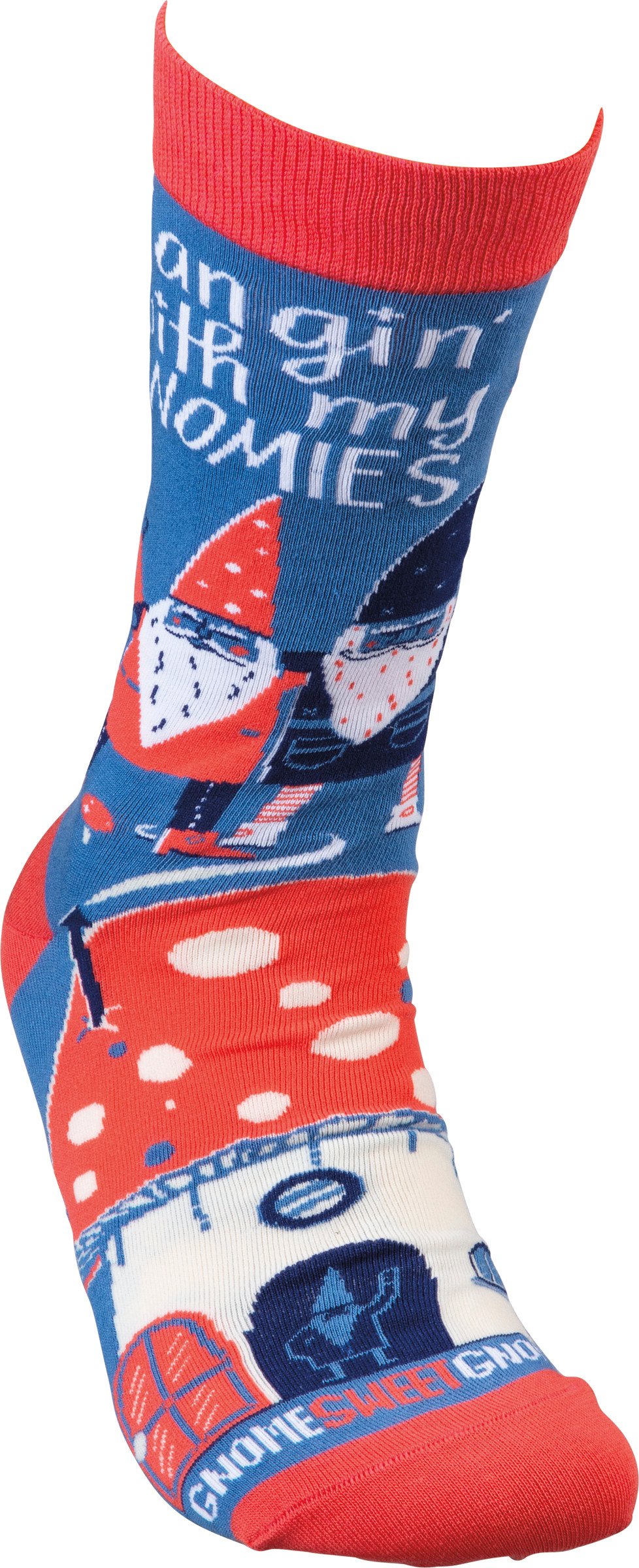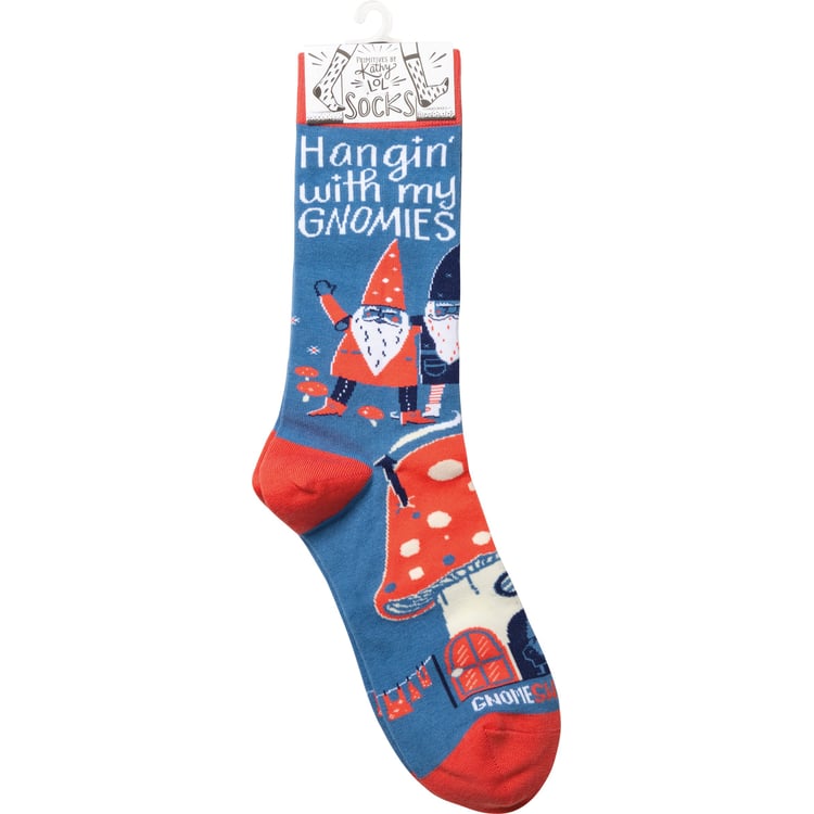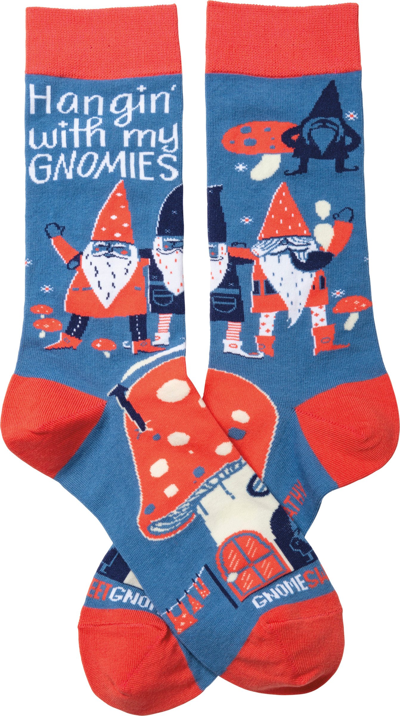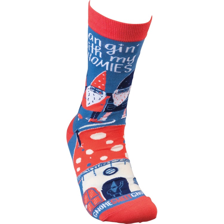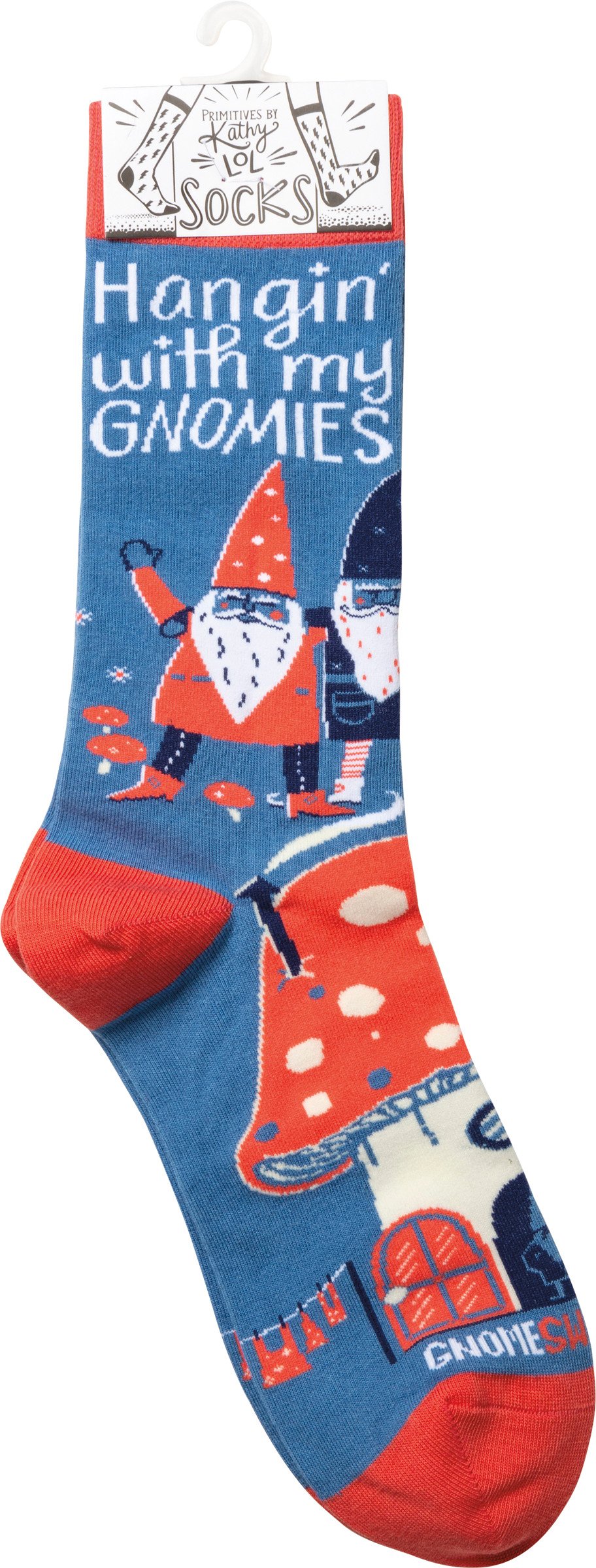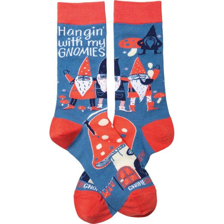 These colorful socks feature woven designs with coordinating "Hangin' With My Gnomies and "Gnome Sweet Gnome"" sentiment. Cotton, nylon, spandex. One size fits most.