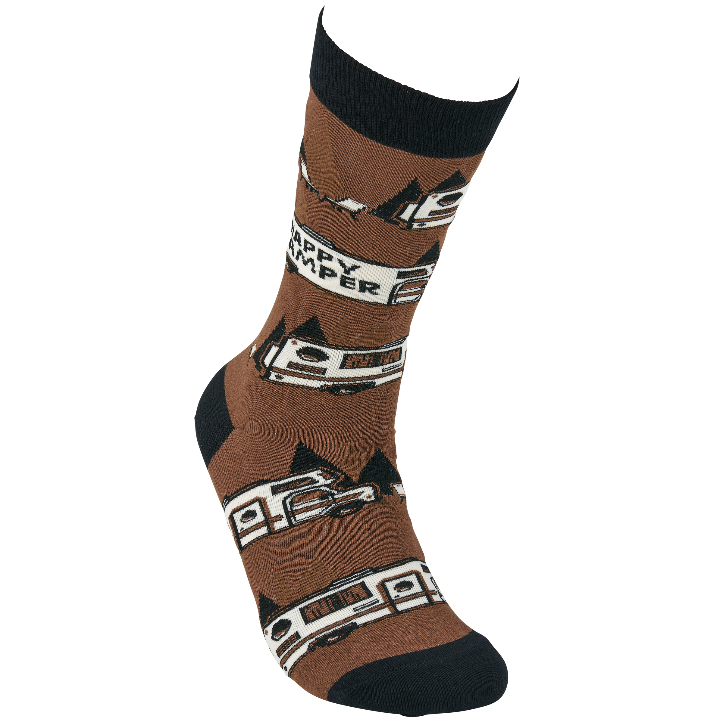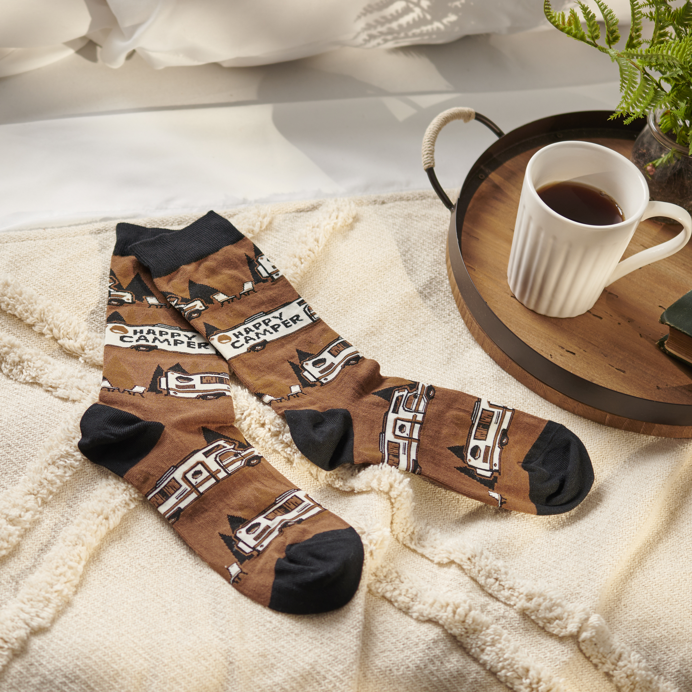 A pair of colorful socks from our Lake & Cabin Collection displaying unique hand illustrated designs of campers with a fun camping-themed sentiment that reads "Happy Camper." Socks feature a one size fits most design made with cotton, nylon, and spandex. Our Happy Camper socks come with a header card and a clear plastic hanger for display. A fun camping-themed gift perfect for everyday self-expression.