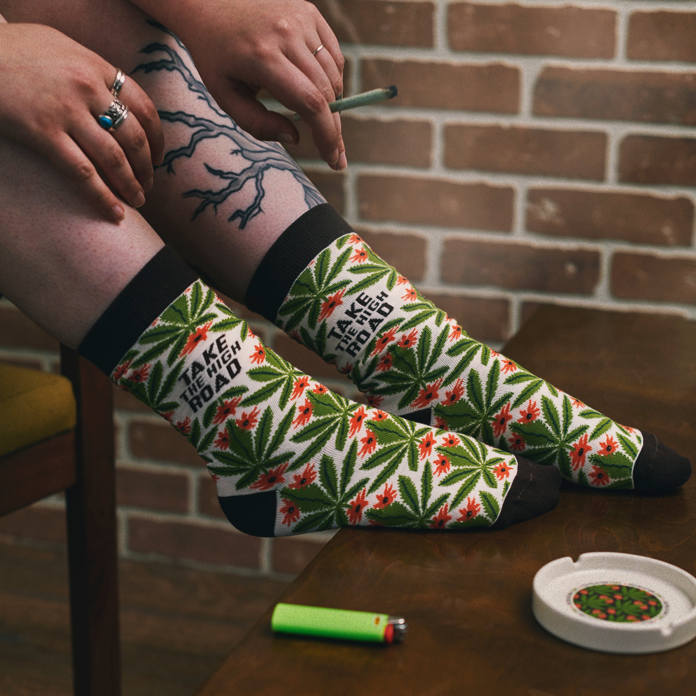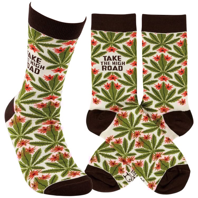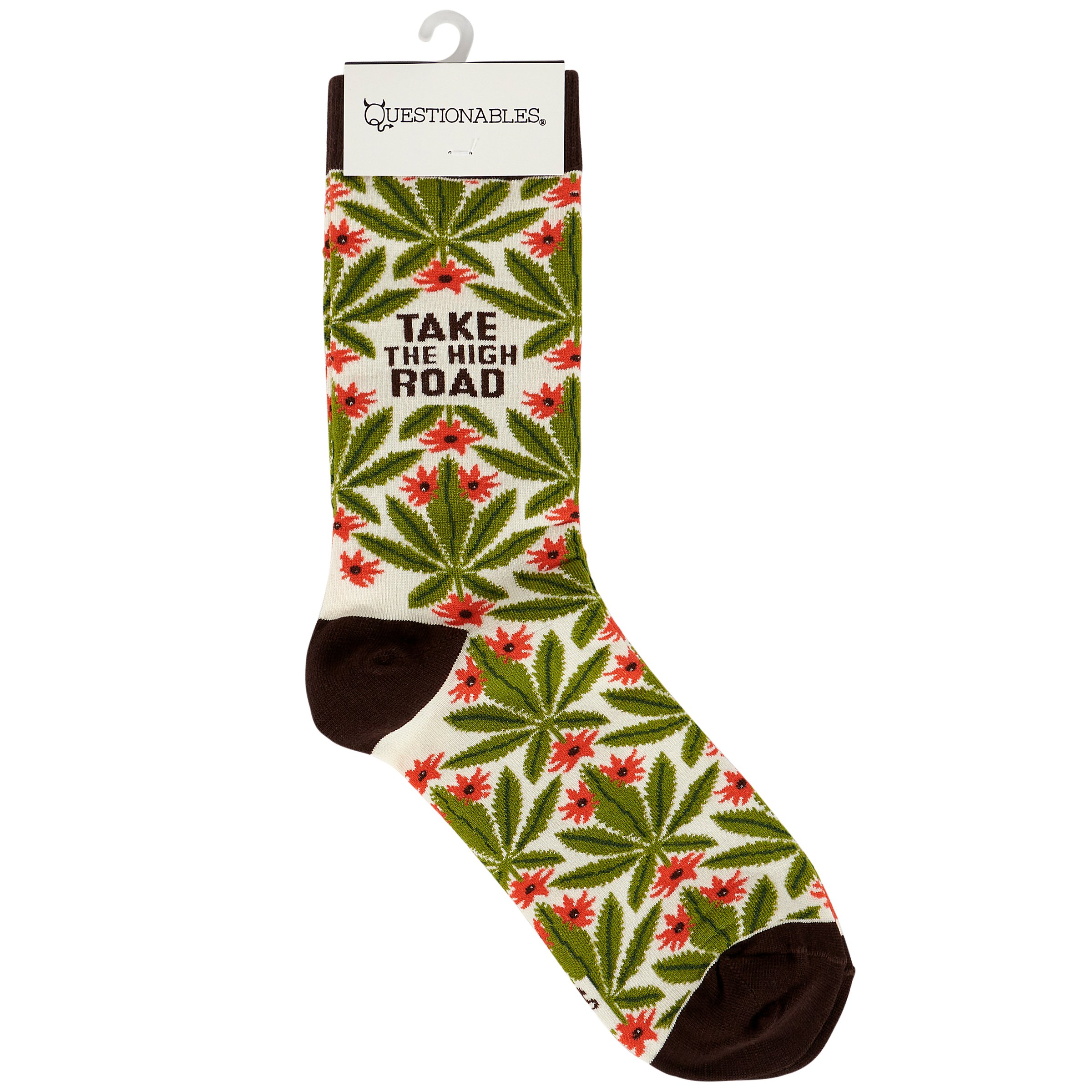 Give anyone that steps into personal space a vibe check with this pair of colorful socks displaying a relaxing pot leaf pattern with a chill sentiment that reads "Take The High Road." Questionables socks are made with cotton, nylon, and spandex to create a one-size-fits-most design. Packaged on a clear plastic hanger with header card for graceful display in store. Our High Road socks are perfect for maximizing chill at home or gifting to pass that feeling to someone who needs it. Colorful and cozy socks always make a great gift that offer many ways to express themselves every day.