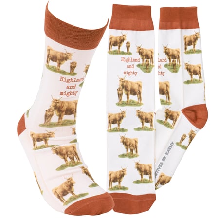 A pair of fun socks from our Farmhouse Collection featuring an all-over design displaying vintage art of highland cows with a funny farm animal pun on the front that reads "Highland And Mighty" as well as brown color accents on the cuff, heel, and toe. These giftable socks are made with a spandex blend for a one size fits most design. Our Highland And Mighty socks come with a decorative header card and a clear plastic hanger for easy rack display and gifting. A fun farm themed gift perfect for everyday self-expression.