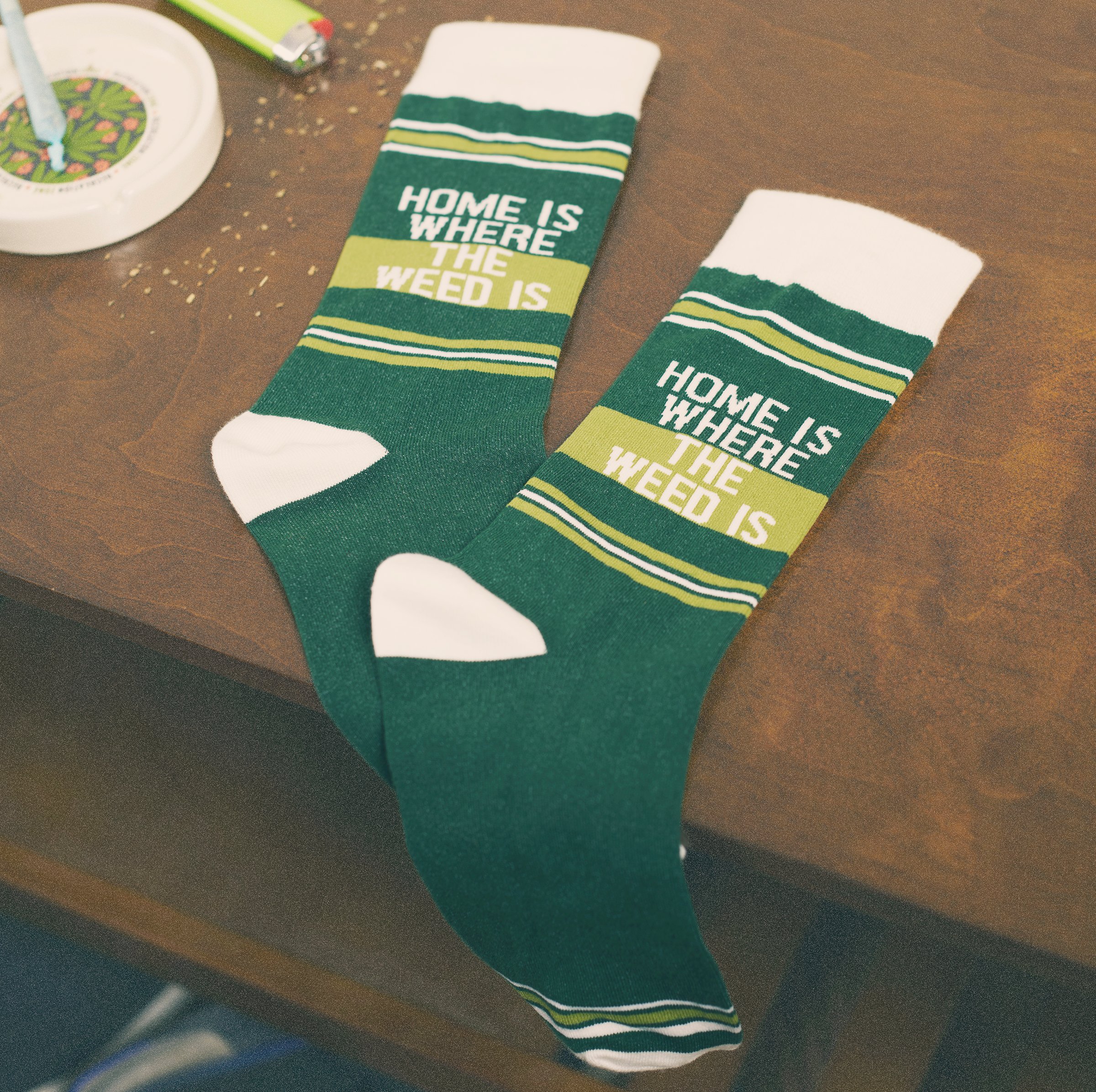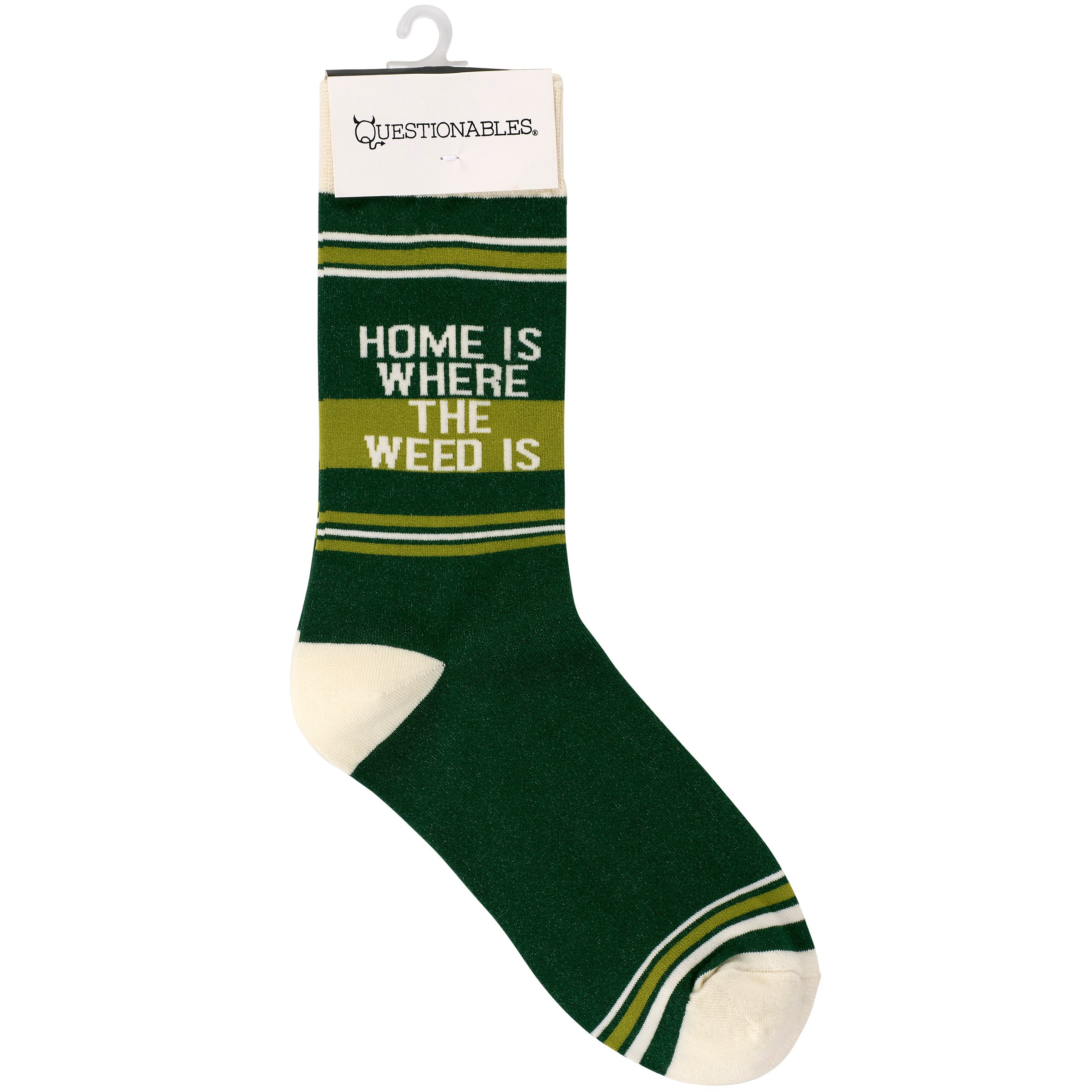 Give anyone that steps into personal space a vibe check with this pair of colorful socks flaunting an earthy inspired pattern with a chill sentiment that reads "Home Is Where The Weed Is." Questionables socks are made with a cotton, nylon, and spandex blend for a one size fits most design and packaged on a clear plastic hanger with header card for graceful display in store. Our Home Is Where socks perfect for maximizing chill at home or gifting to pass that feeling to someone who needs it. Colorful and cozy socks always make a great gift that offer new ways to express themselves every day.