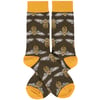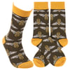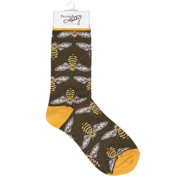 A pair of colorful socks from our Garden Collection displaying hand illustrated designs of honey bees with floral details. Socks feature a one size fits most design made with cotton, nylon, and spandex. Our Honey Bee socks come with a header card and a clear plastic hanger for display. A rustic garden-themed gift perfect for everyday self-expression.