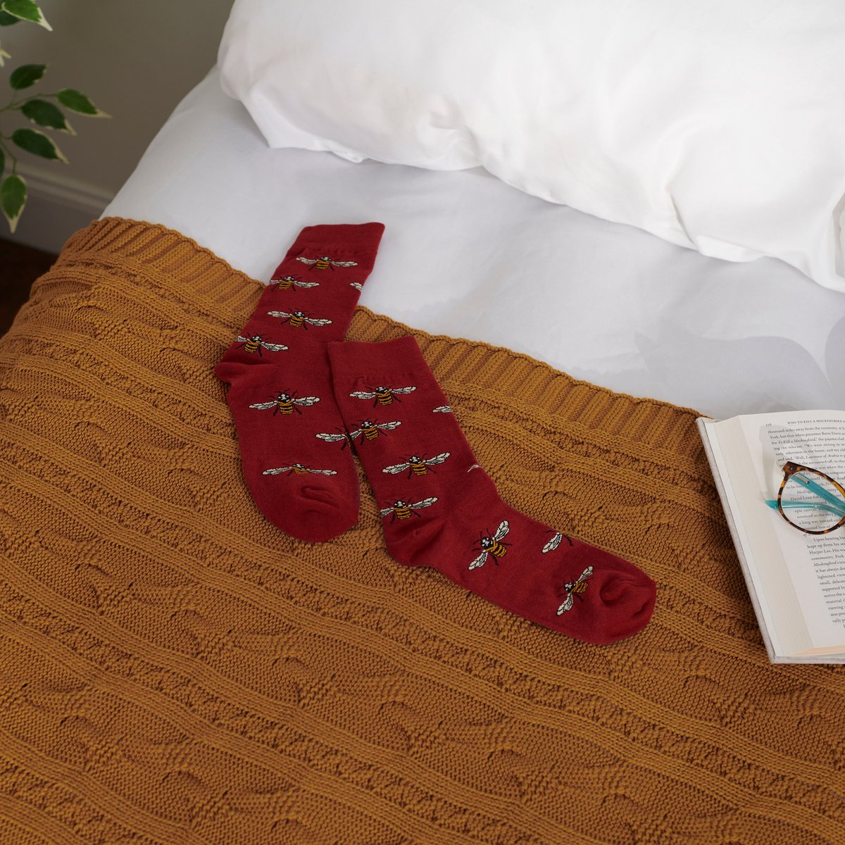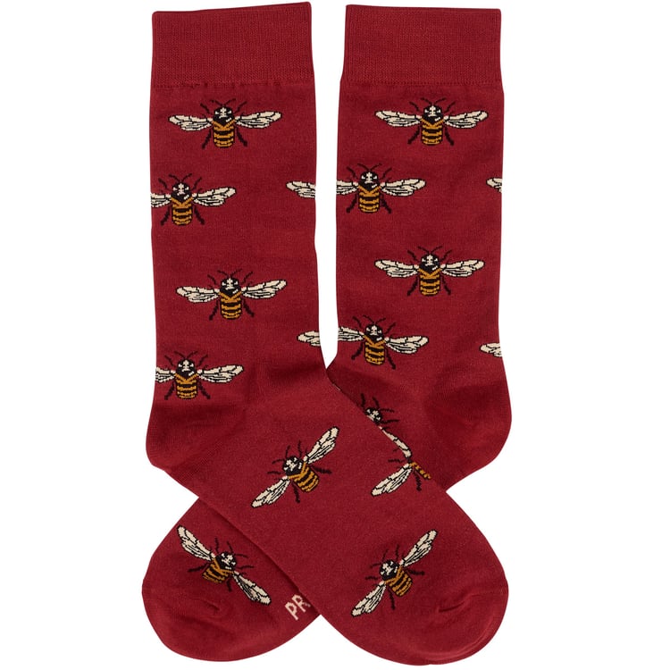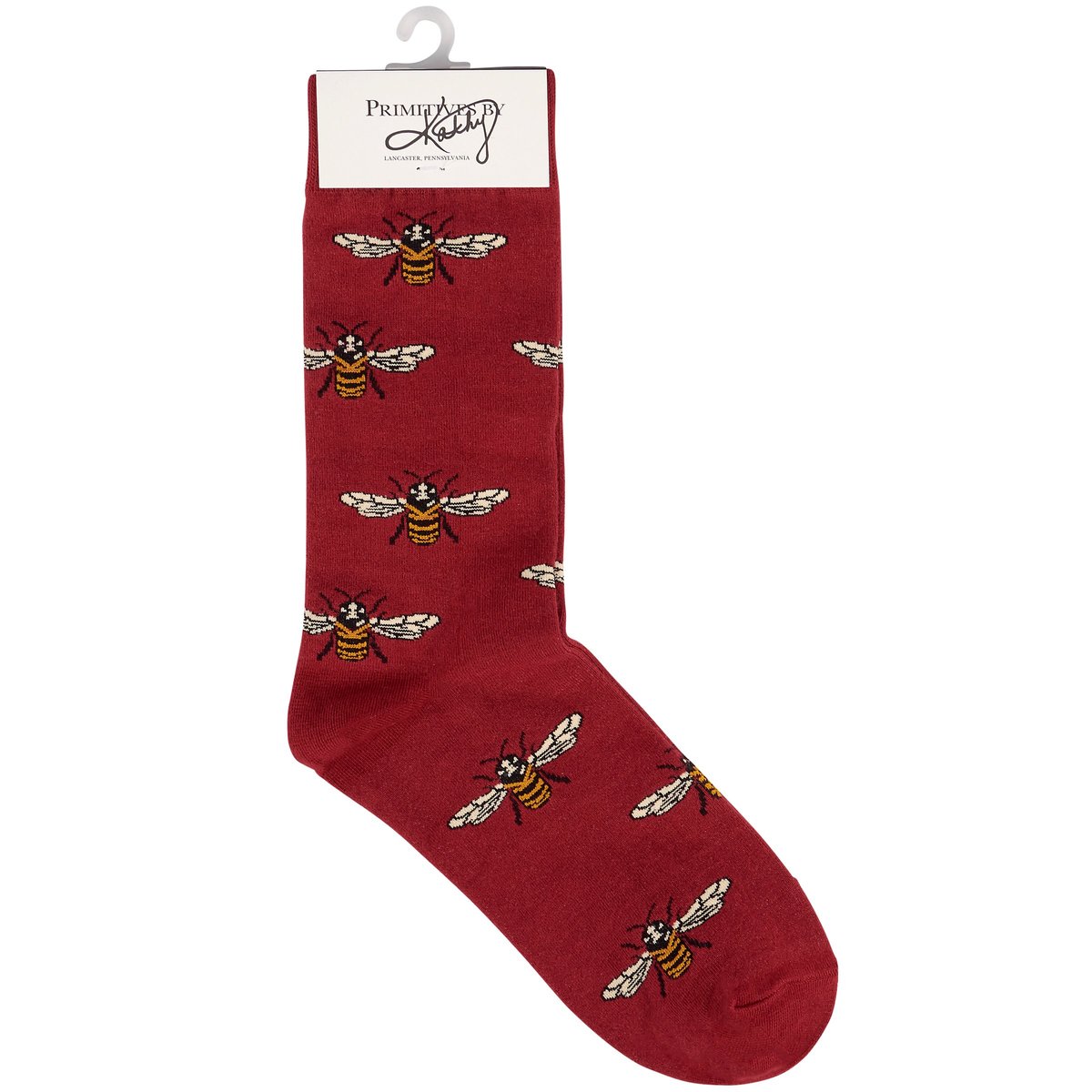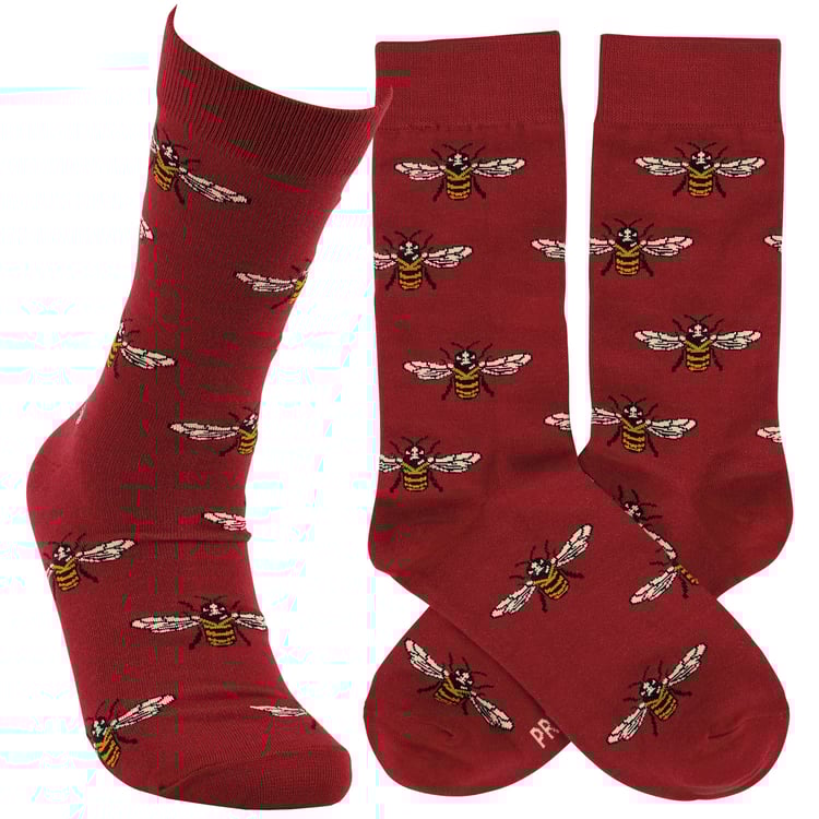 A pair of colorful socks from our Homestead Collection displaying a pattern of honey bees in a rustic style. These giftable socks are made with a cotton, nylon, and spandex blend for a one size fits most design. Our Honey Farm Bees socks come with a decorative header card and a clear plastic hanger for easy rack display and gifting. A fun farm-themed gift perfect for everyday self-expression.