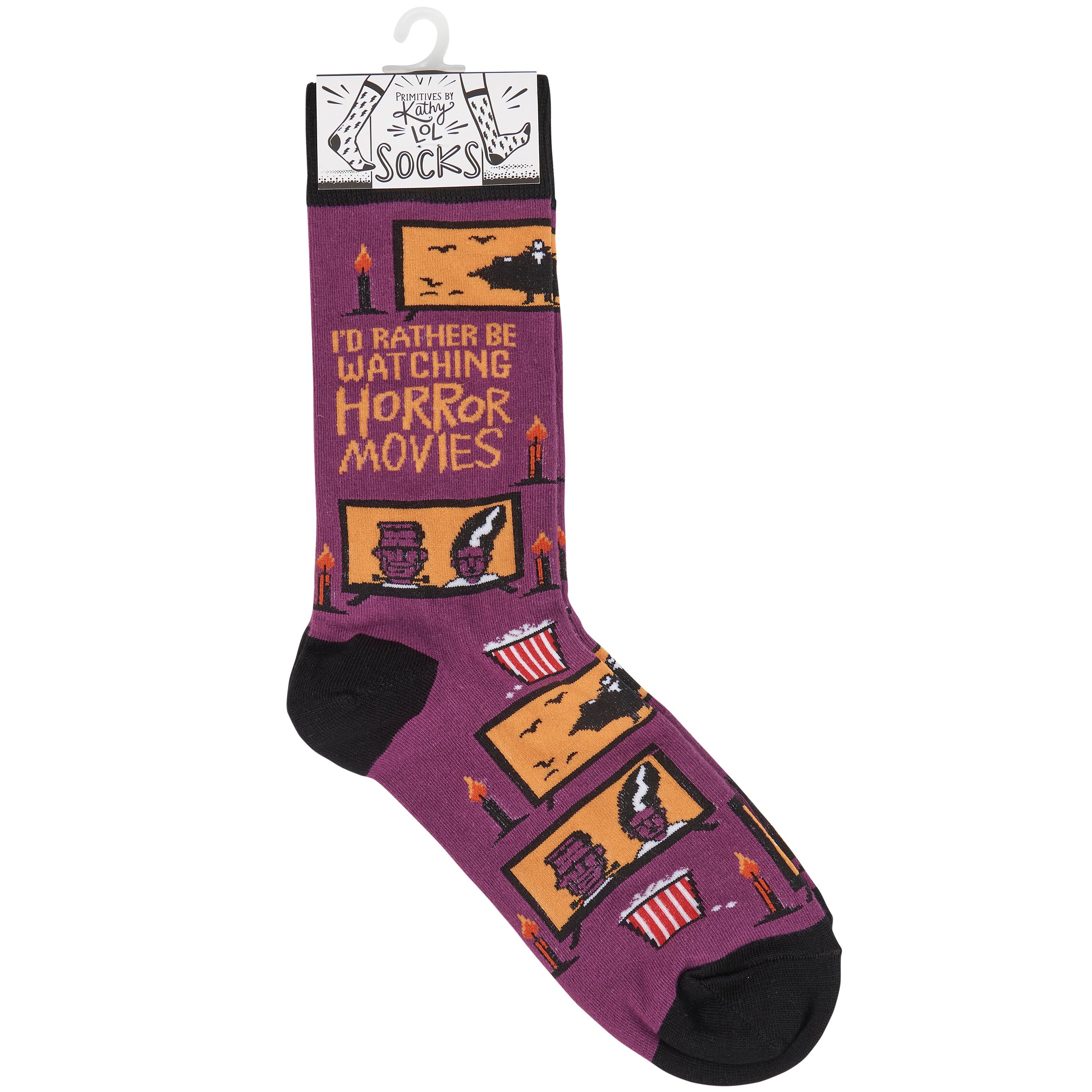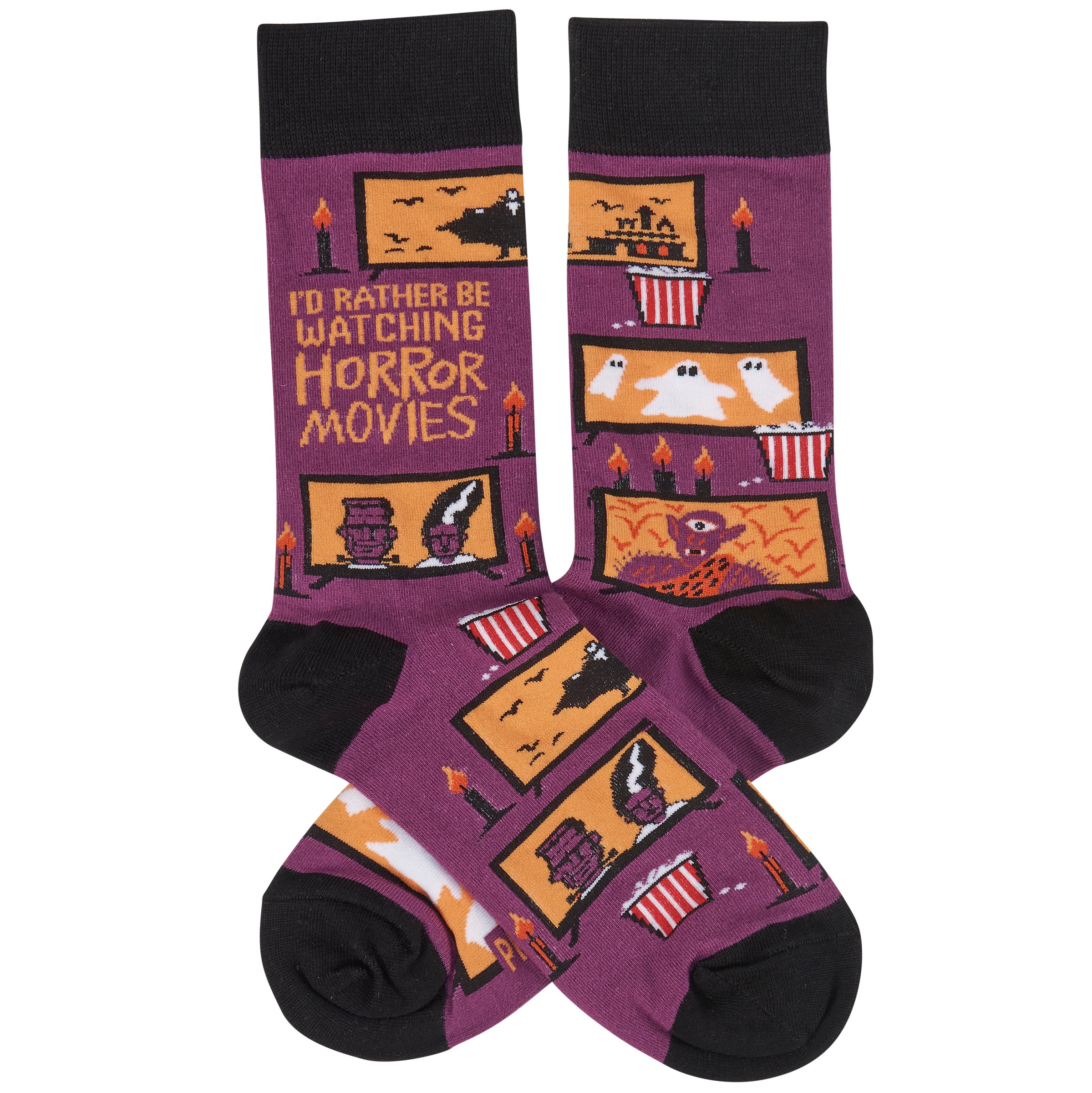 A pair of colorful socks from our Halloween Collection displaying unique hand illustrated designs of TVs playing various horror movies and popcorn with a fun seasonal sentiment that reads "I'd Rather Be Watching Horror Movies." Seasonal socks feature a one size fits most design made with cotton, nylon, and spandex. Our Horror Movies socks come with a header card and a clear plastic hanger for display. A fun Halloween-themed gift perfect for seasonal self-expression.