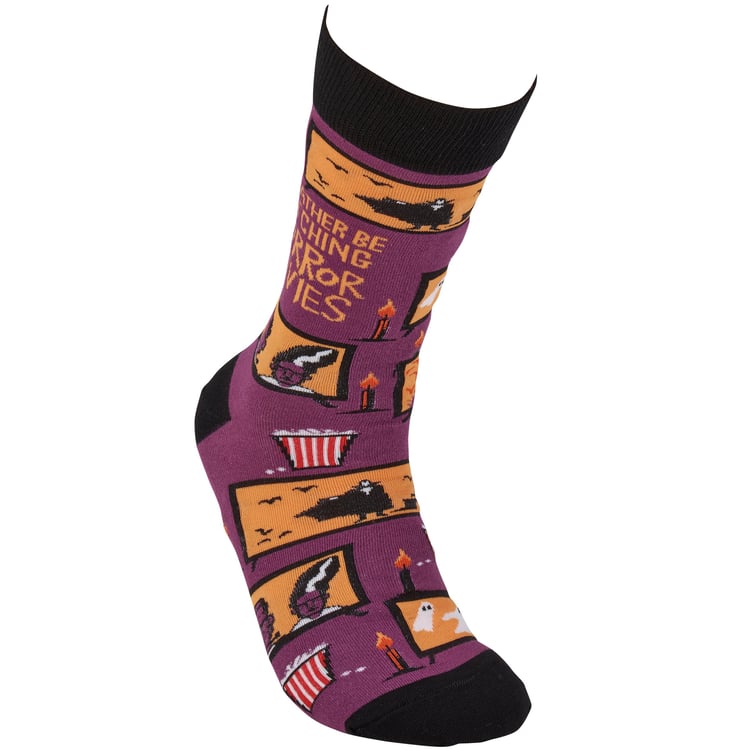 A pair of colorful socks from our Halloween Collection displaying unique hand illustrated designs of TVs playing various horror movies and popcorn with a fun seasonal sentiment that reads "I'd Rather Be Watching Horror Movies." Seasonal socks feature a one size fits most design made with cotton, nylon, and spandex. Our Horror Movies socks come with a header card and a clear plastic hanger for display. A fun Halloween-themed gift perfect for seasonal self-expression.