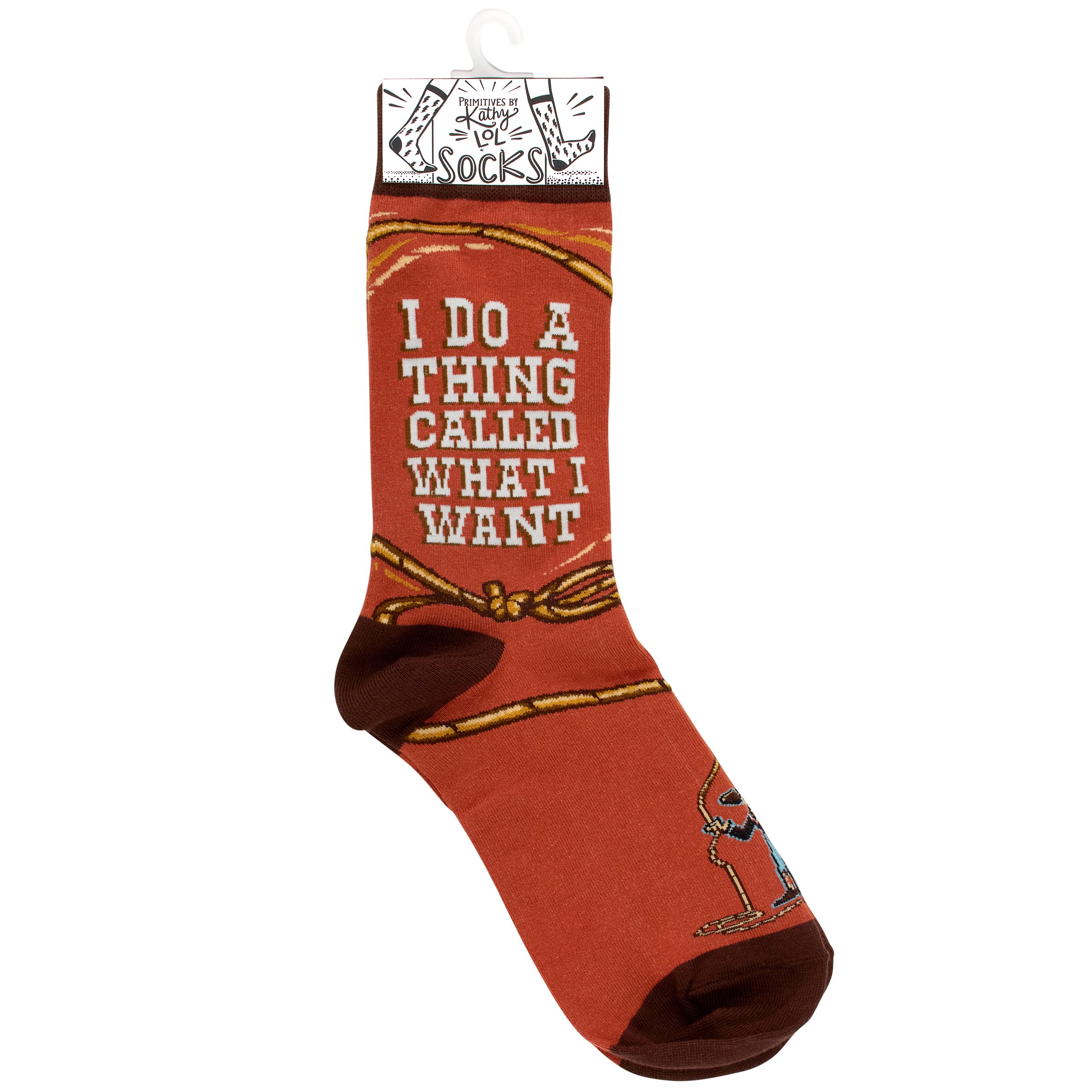 A pair of colorful socks from our Western Collection displaying a playful hand illustrated design of a cowboy swinging a lasso with a fun western inspired sentiment that reads "I Do A Thing Called What I Want." These giftable socks are made with a cotton, nylon, and spandex blend for a one size fits most design. Our I Do A Thing Called What I Want socks come with a decorative header card and a clear plastic hanger for easy rack display and gifting. A fun western themed gift perfect for everyday self-expression.