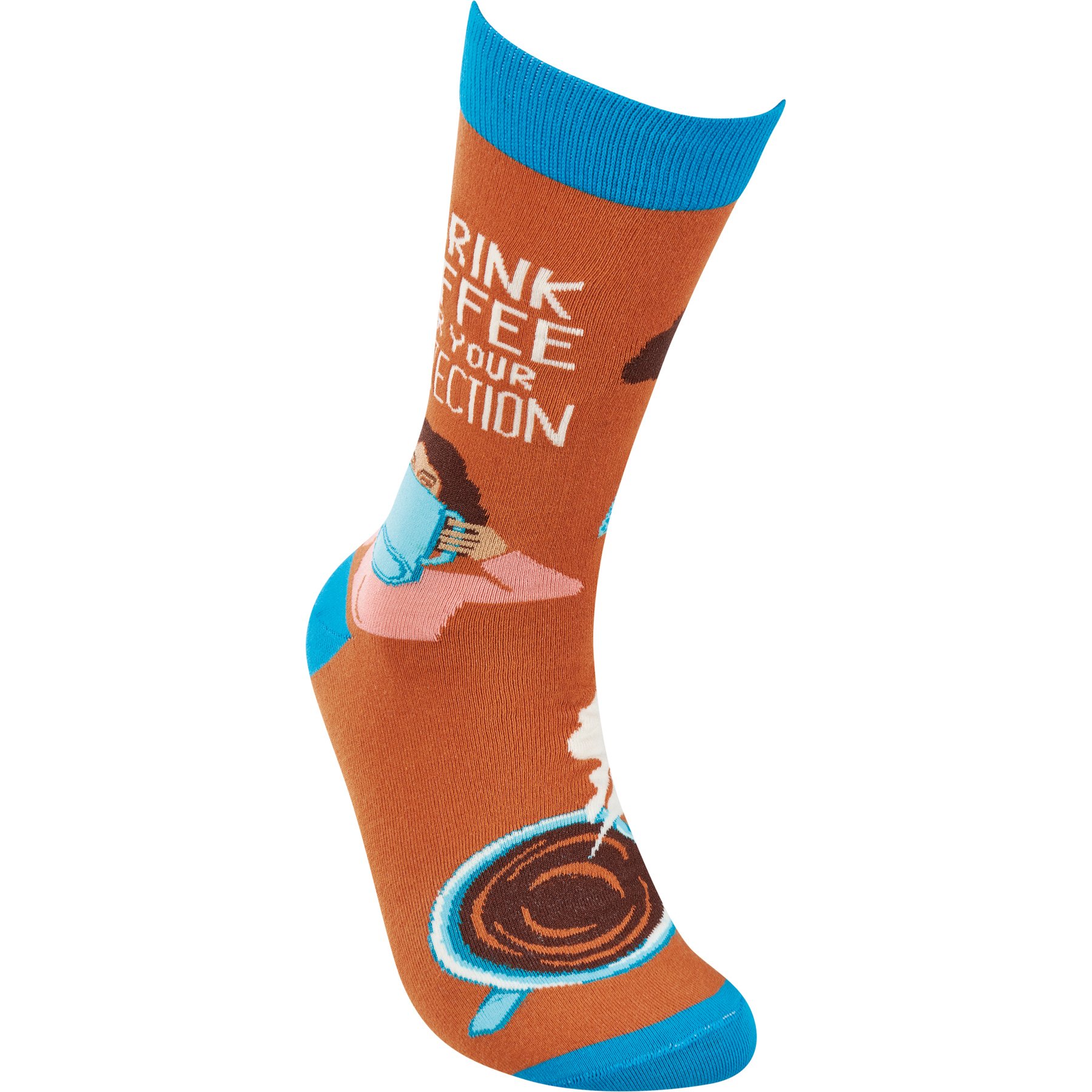 A pair of colorful woven socks from our LOL Made You Smile Collection displaying hand illustrated designs of a person drinking coffee with "I Drink Coffee For Your Protection" sentiment. Socks feature a one size fits most design made with cotton, nylon, and spandex. Our I Drink Coffee For Your Protection socks come with a header card and a clear plastic hanger for display. A fun everyday accessory perfect for self-expression or gifting on any occasion.