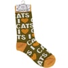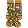 A pair of colorful socks from our Pet Collection displaying a repeating pet-themed sentiment that reads "I Love Cats" Socks feature a one size fits most design made with cotton, nylon, and spandex. Our I Love Cats socks come with a header card and a clear plastic hanger for display. A fun pet-themed gift perfect for everyday self-expression.