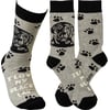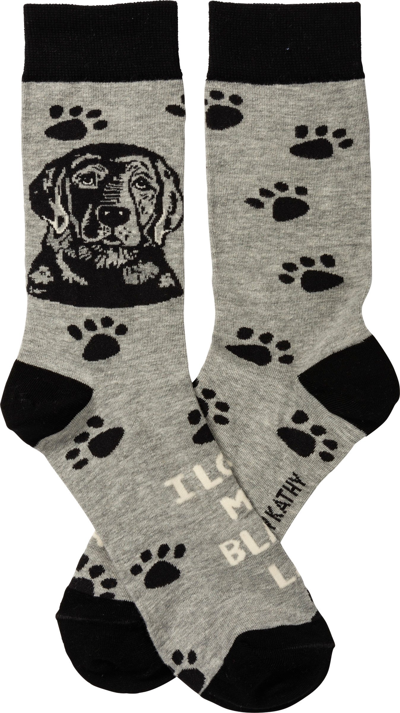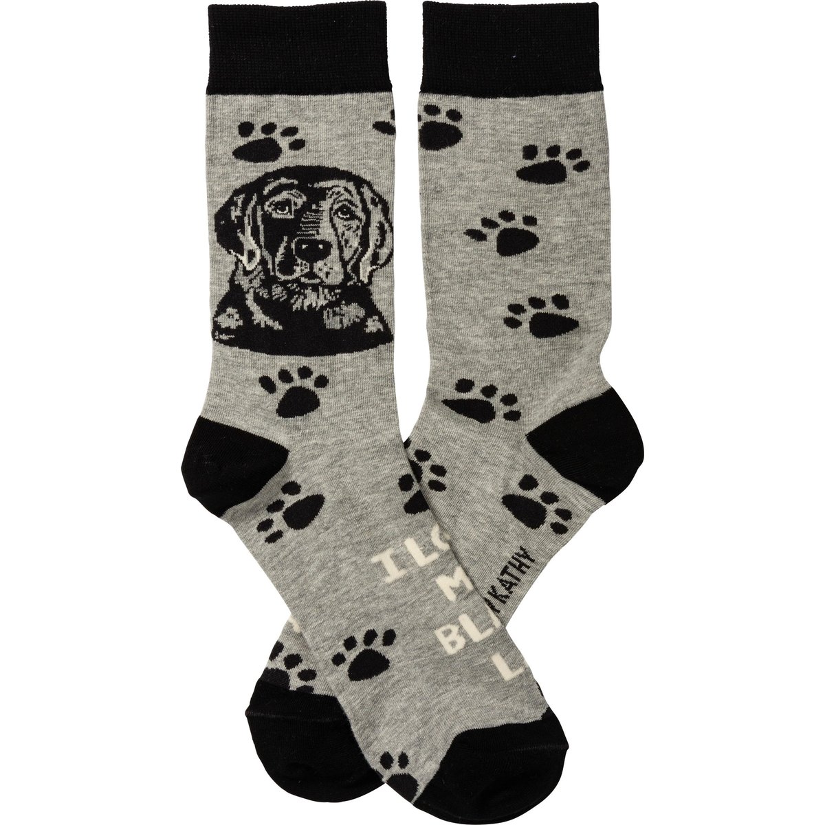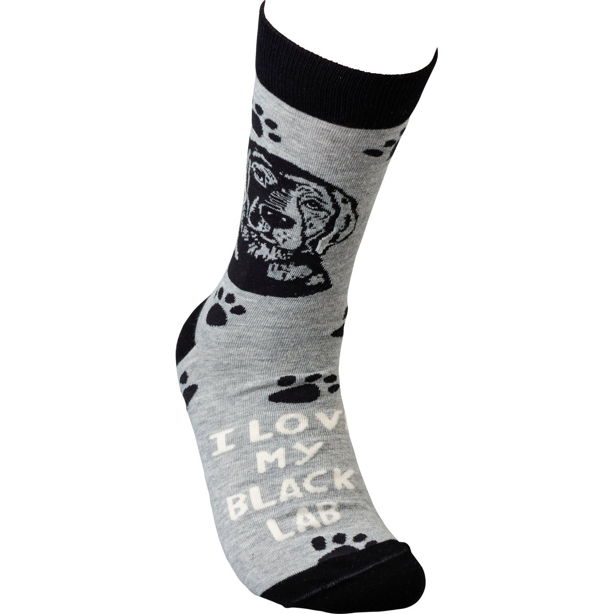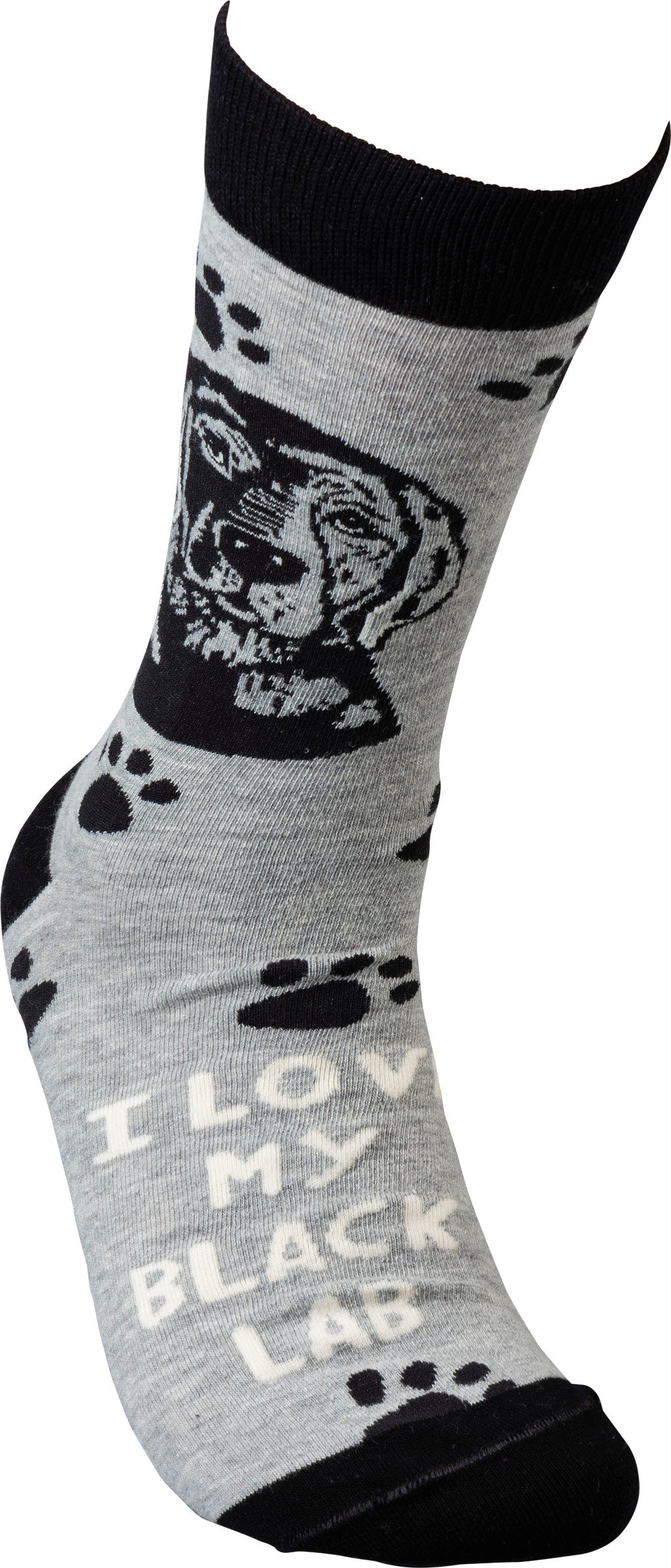 A pair of socks from our Pet Collection featuring "I Love My Black Lab" sentiment with block print black lab portrait and all-over paw print design. One size fits most. Cotton, nylon and spandex. These Black Lab socks come attached to header card with plastic hanger for ease of display.