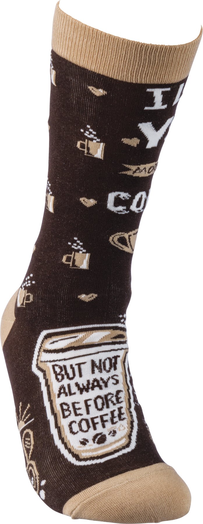 These colorful socks feature woven designs with coordinating "I Love You More Than Coffee But Not Always Before Coffee" sentiment. Cotton, nylon, spandex. One size fits most.