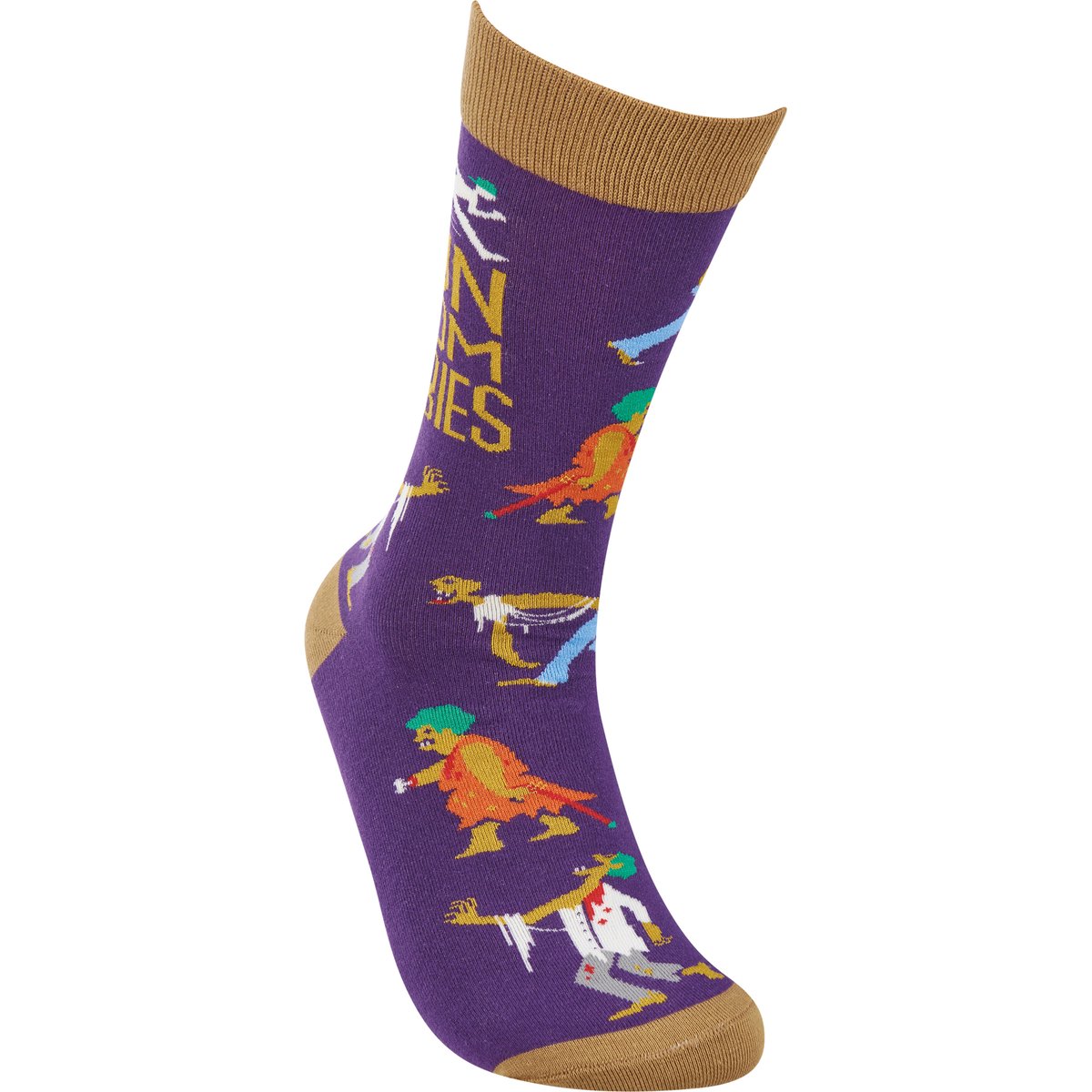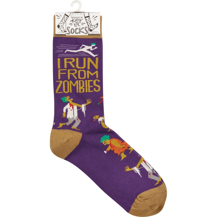A pair of colorful woven socks from our Halloween Collection displaying unique hand illustrated designs of zombies with humorous "I Run From Zombies" sentiment. Socks feature a one size fits most design made with cotton, nylon, and spandex. Our I Run From Zombies socks come with a header card and a clear plastic hanger for display. A fun seasonal accessory perfect for self-expression or for gifting.