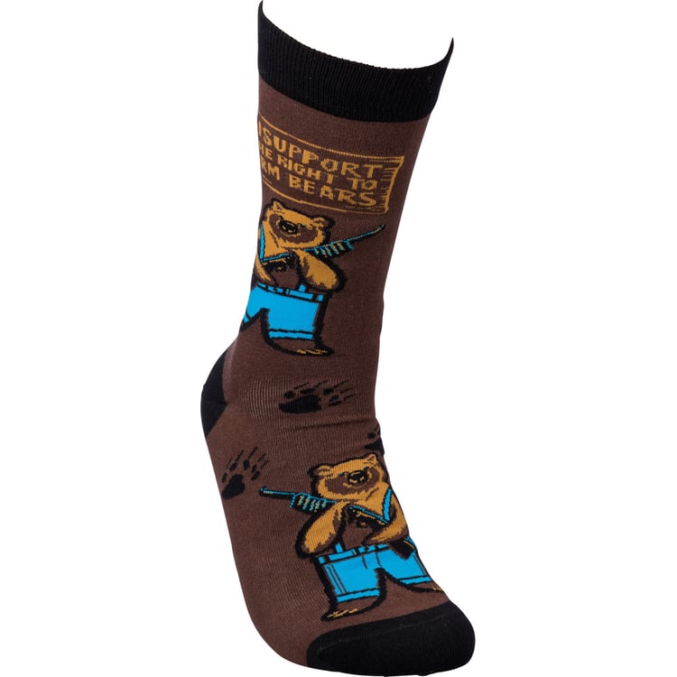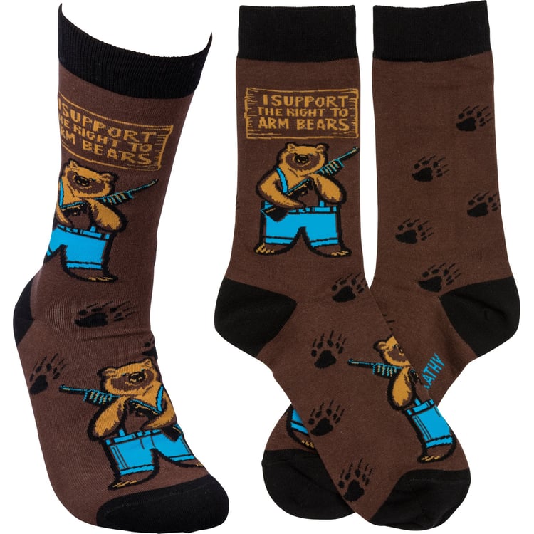 These colorful socks https://www.primitivesbykathy.com/products/collection/lol/ feature woven designs with coordinating "I Support The Right To Arm Bears" sentiment. Cotton, nylon, spandex. These Right To Bear Arms socks are one size fits most.