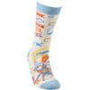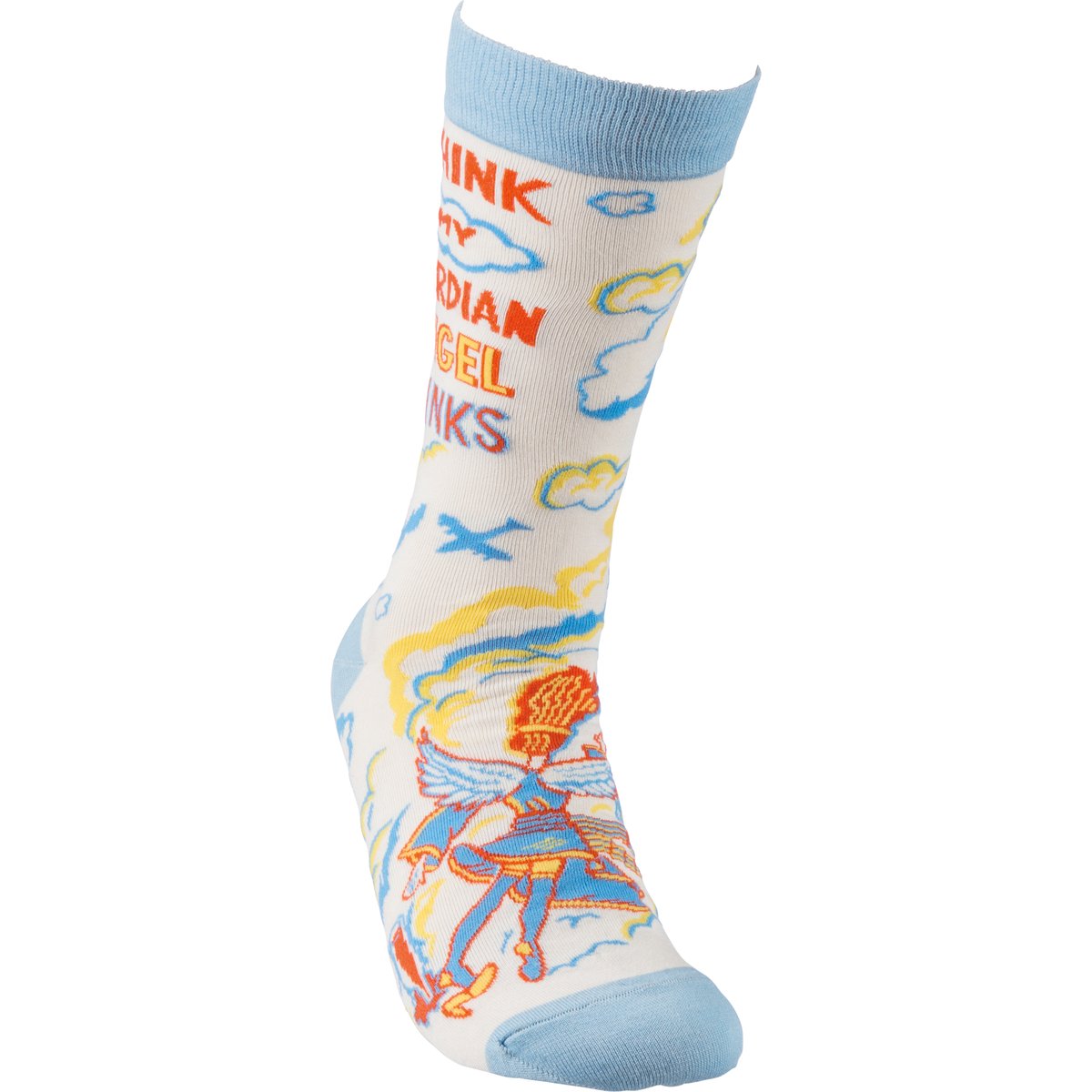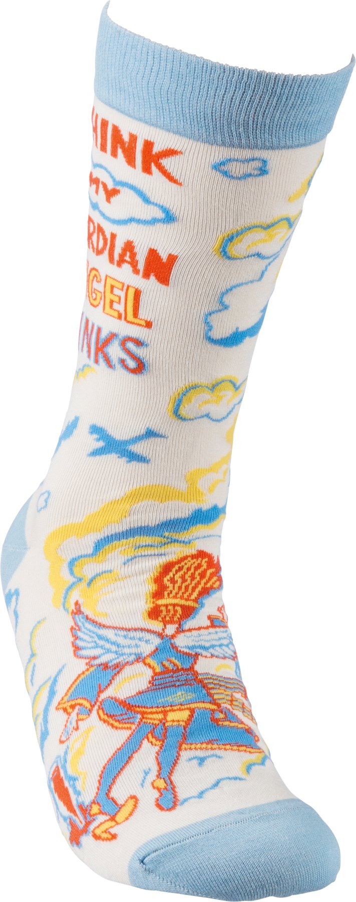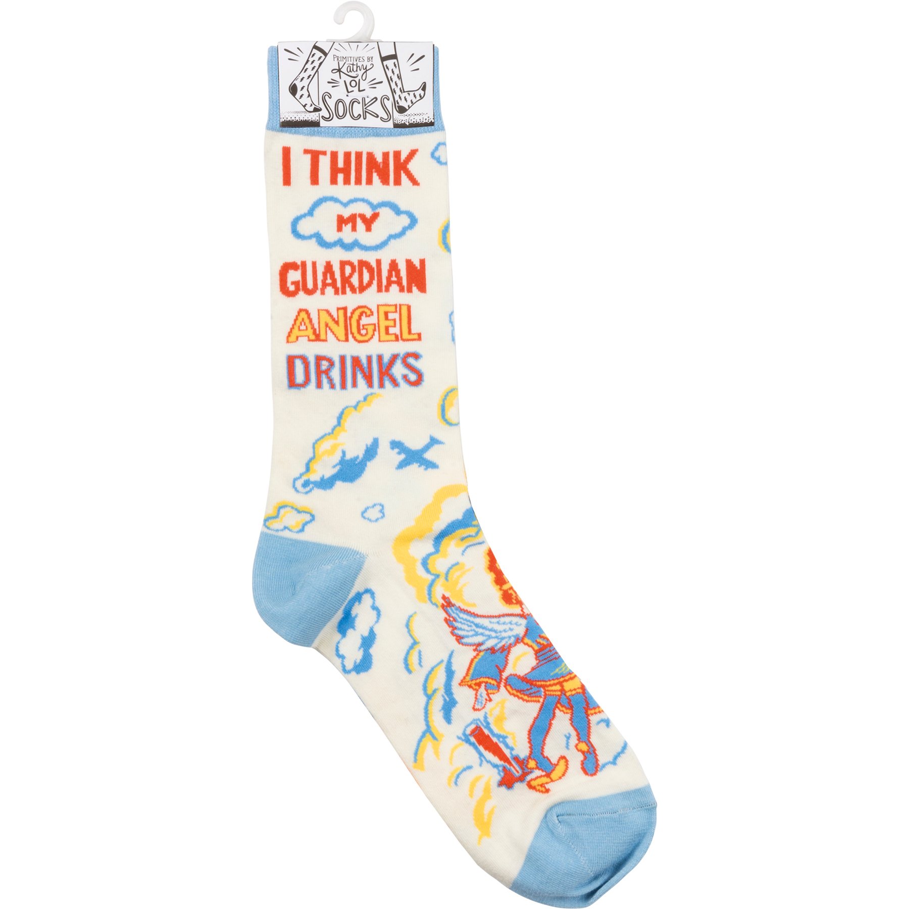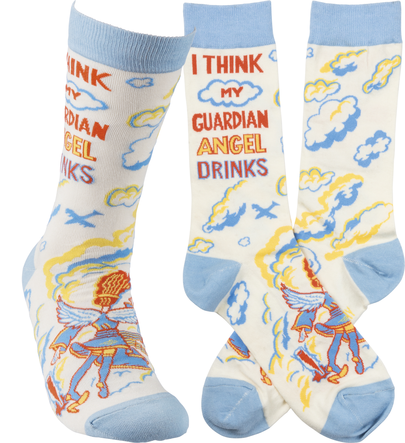 These colorful socks feature woven designs with coordinating "I Think My Guardian Angel Drinks" sentiment. Cotton, nylon, spandex. One size fits most.