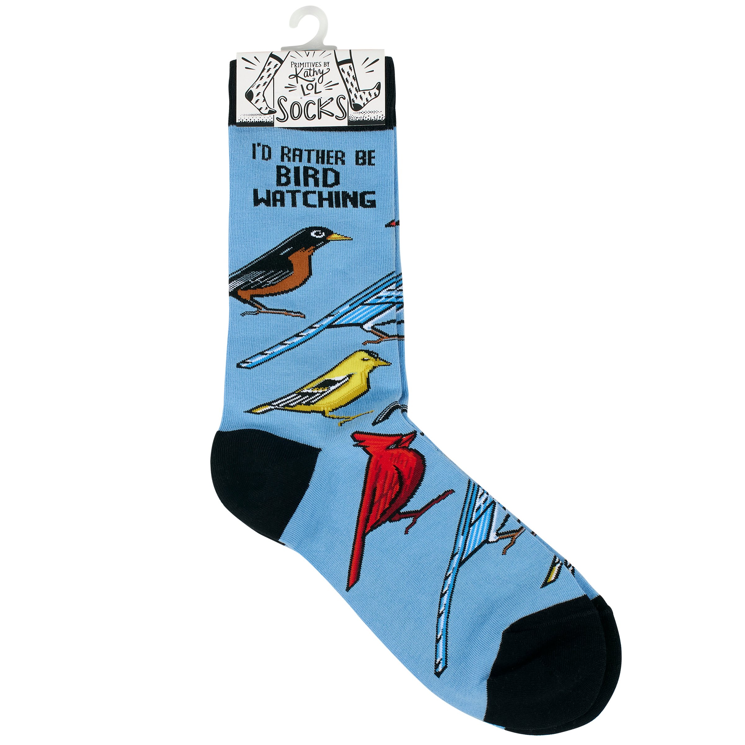 A pair of colorful socks from our LOL-Made You Smile Collection displaying playful hand illustrated designs of various birds with a fun bird inspired sentiment that reads "I'd Rather Be Bird Watching." These giftable socks are made with a cotton, nylon, and spandex blend for a one size fits most design. Our I'd Rather Be Bird Watching socks come with a decorative header card and a clear plastic hanger for easy rack display and gifting. A fun gift for bird watchers perfect for everyday self-expression.