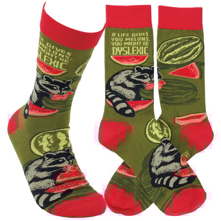 A pair of colorful socks from our LOL-Made You Smile Collection displaying a playful hand illustrated design of raccoons eating watermelons with a funny sentiment that reads "If Life Gives You Melons, You Might Be Dyslexic." These giftable socks are made with a cotton, nylon, and spandex blend for a one size fits most design. Our If Life Gives Melons socks come with a decorative header card and a clear plastic hanger for easy rack display and gifting. A funny gift perfect for everyday self-expression.