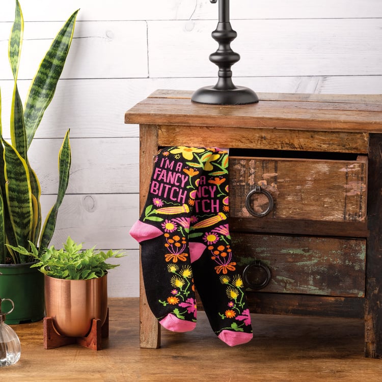 These colorful socks from our LOL Made You Smile Collection feature woven designs with coordinating "I'm A Fancy Bitch" sentiment. Cotton, nylon, spandex. These funny I'm A Fancy Bitch socks are one size fits most.