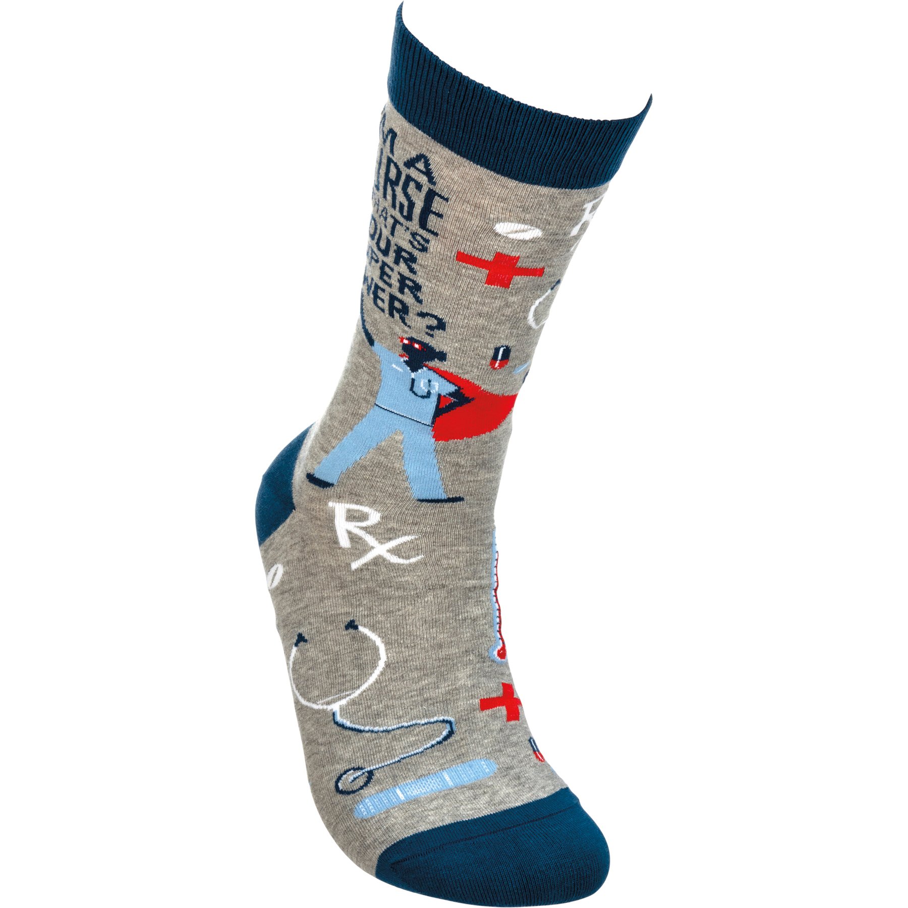 These colorful socks feature woven designs with coordinating "I'm A Nurse What's Your Superpower?" sentiment. Cotton, nylon, spandex. One size fits most.