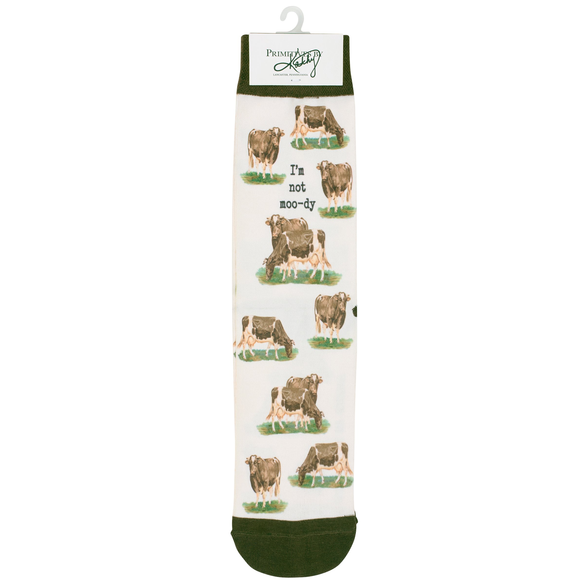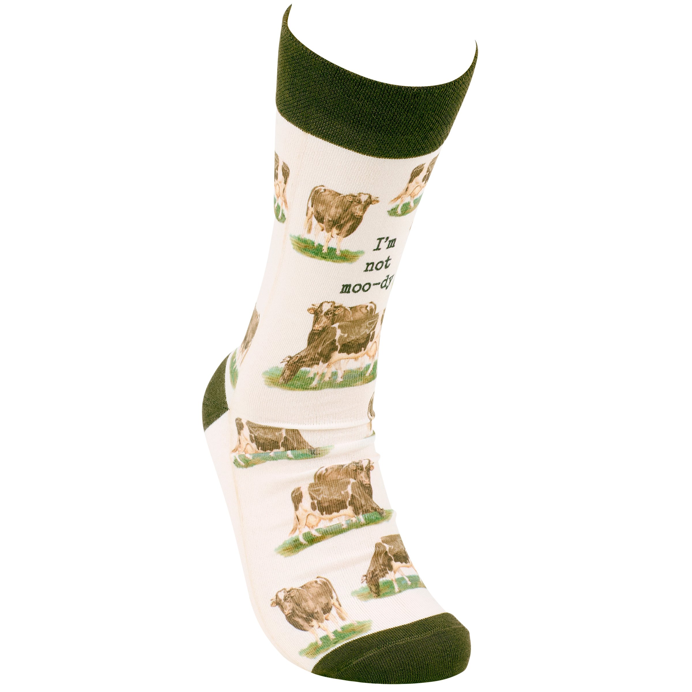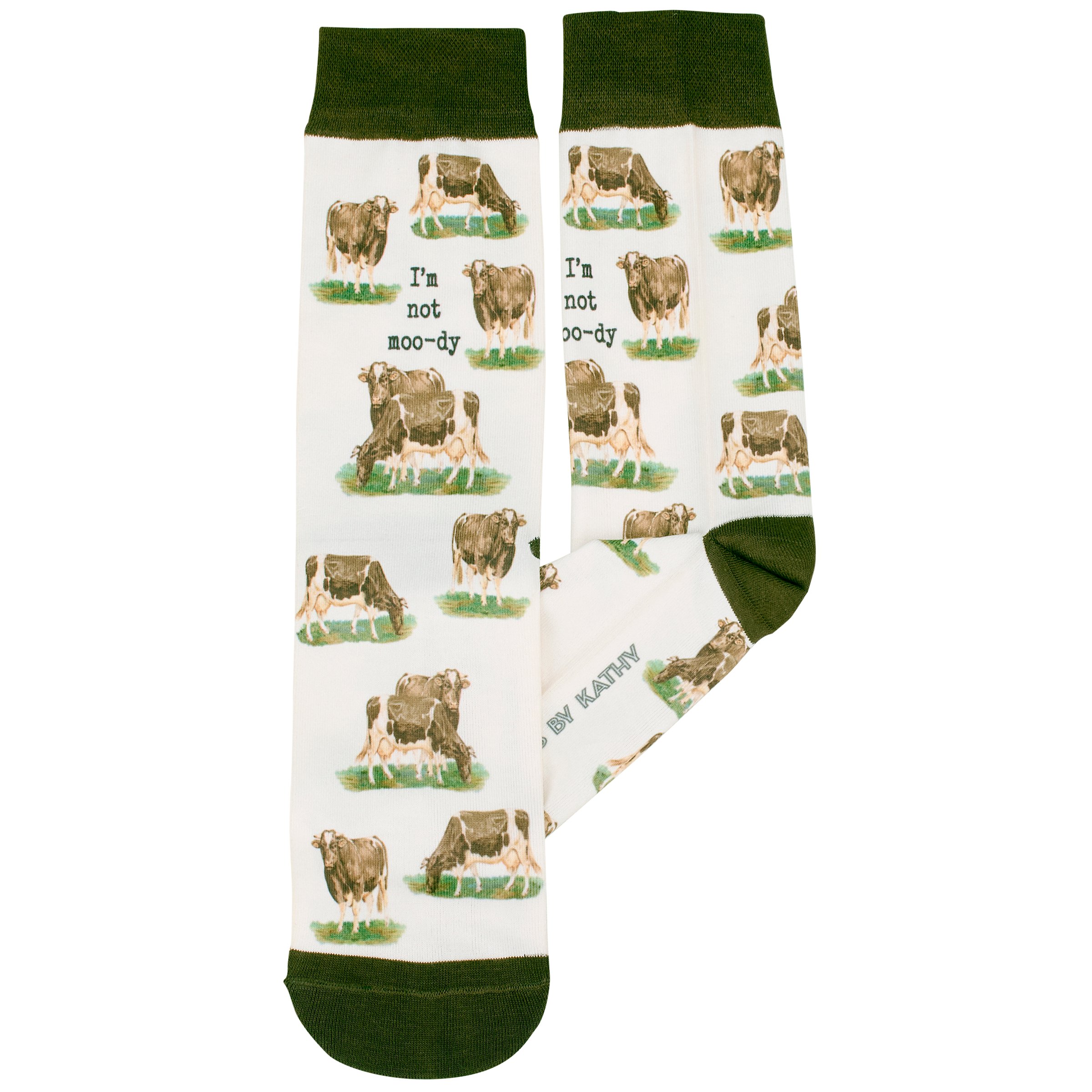 A pair of fun socks from our Farmhouse Collection featuring an all-over design displaying vintage art of dairy cows with a funny farm animal pun on the front that reads "I'm Not Moo-dy" as well as green color accents on the cuff, heel, and toe. These giftable socks are made with a spandex blend for a one size fits most design. Our I'm Not Moo-dy socks come with a decorative header card and a clear plastic hanger for easy rack display and gifting. A fun farm themed gift perfect for everyday self-expression.