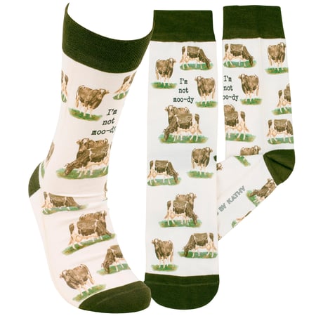 A pair of fun socks from our Farmhouse Collection featuring an all-over design displaying vintage art of dairy cows with a funny farm animal pun on the front that reads "I'm Not Moo-dy" as well as green color accents on the cuff, heel, and toe. These giftable socks are made with a spandex blend for a one size fits most design. Our I'm Not Moo-dy socks come with a decorative header card and a clear plastic hanger for easy rack display and gifting. A fun farm themed gift perfect for everyday self-expression.