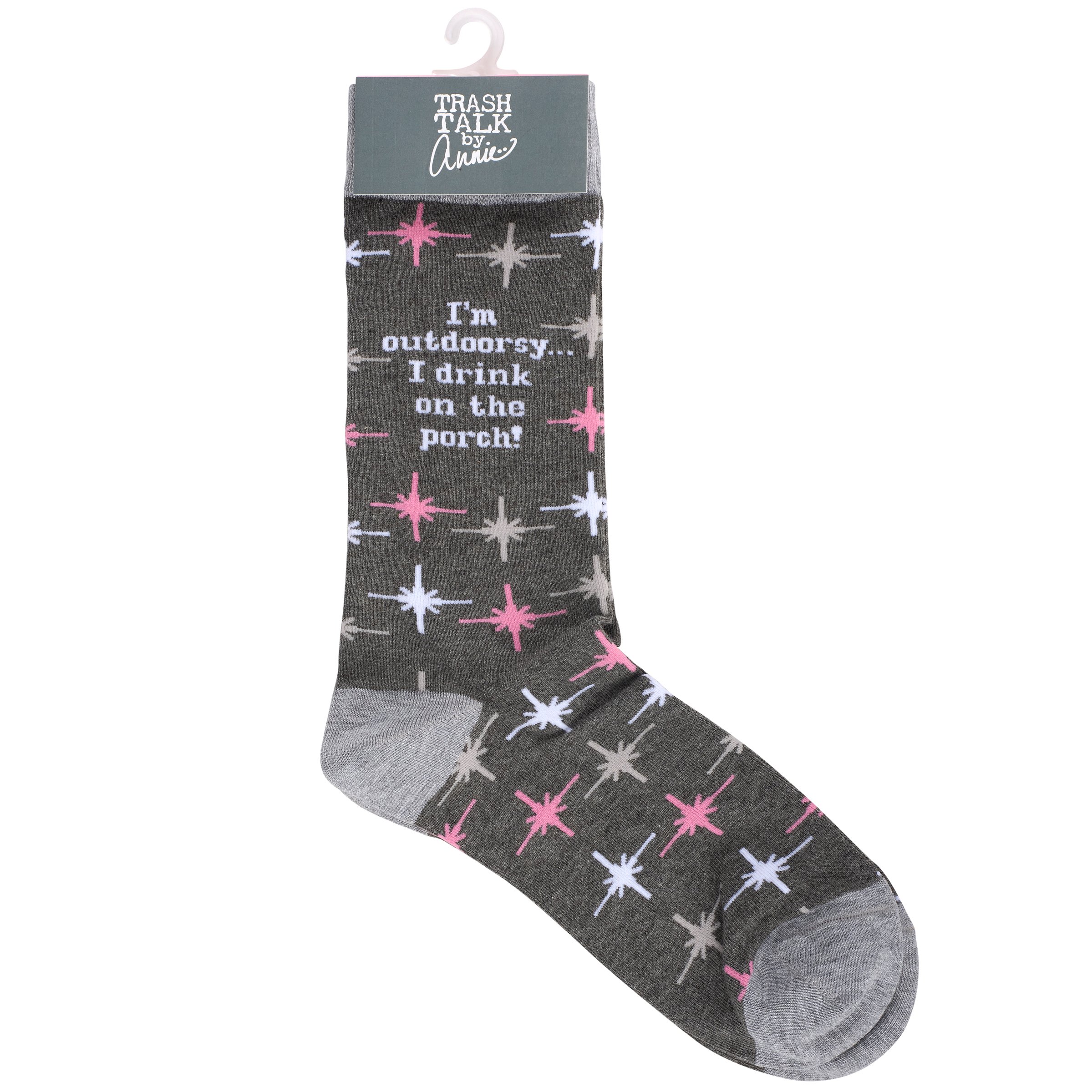 A pair of retro socks from our Trash Talk By Annie Collection flaunting a classy pink and gray pattern with a sassy sentiment that reads "I'm Outdoorsy... I Drink On The Porch!" These cozy socks are made with cotton, nylon, and spandex to create a one-size-fits-most design. Each pair of socks is packaged on a clear plastic hanger with header card for graceful display in store. Our I'm Outdoorsy socks call back to a vintage style with modern sassy sentiments, perfect for making a statement while getting a giggle out of others. Colorful and cozy socks always make a great gift for everyday self-expression.