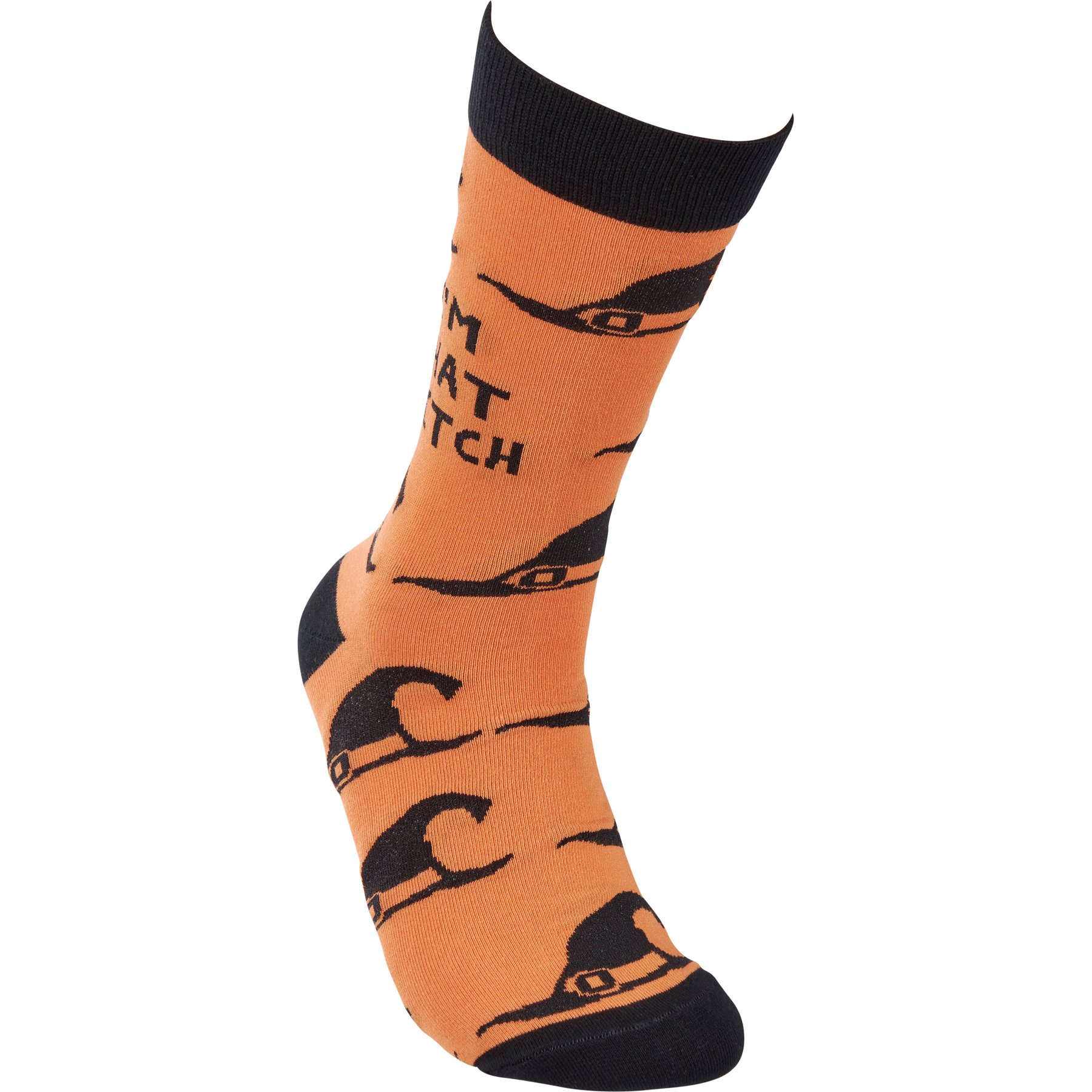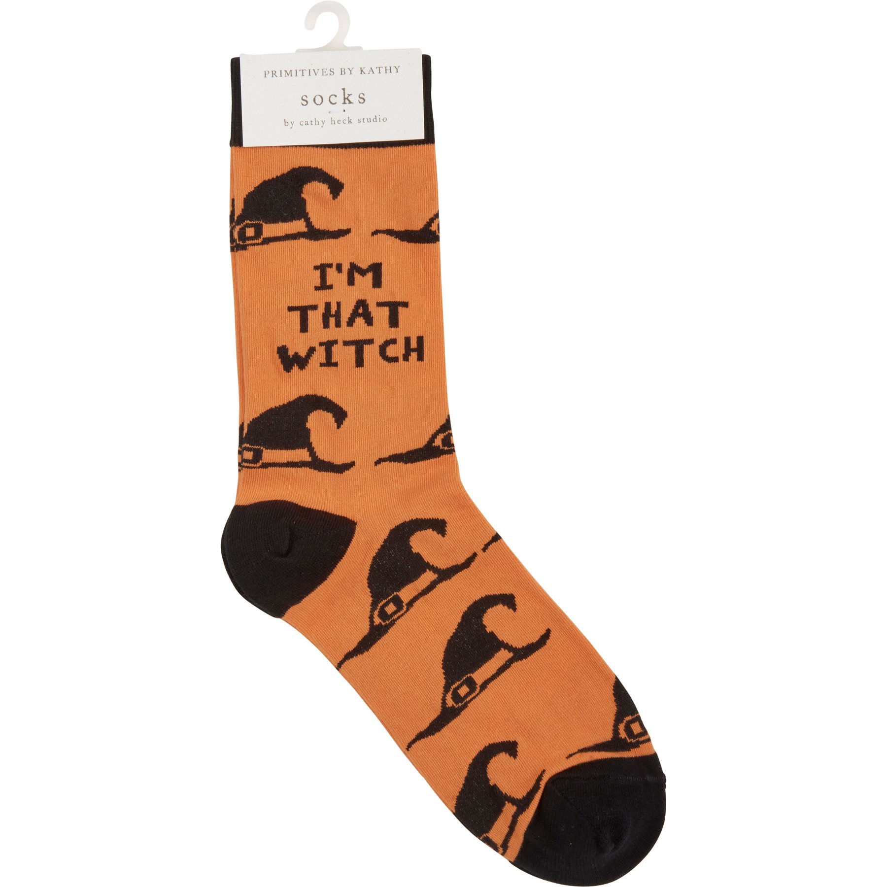 A pair of colorful woven socks from our Halloween Collection displaying a pattern of witch hats in a classic black and orange color palette with humorous "I'm That Witch" sentiment. Socks feature a one size fits most design made with cotton, nylon, and spandex. Our I'm That Witch socks come with a header card and a clear plastic hanger for display. A fun seasonal accessory perfect for self-expression or for gifting.