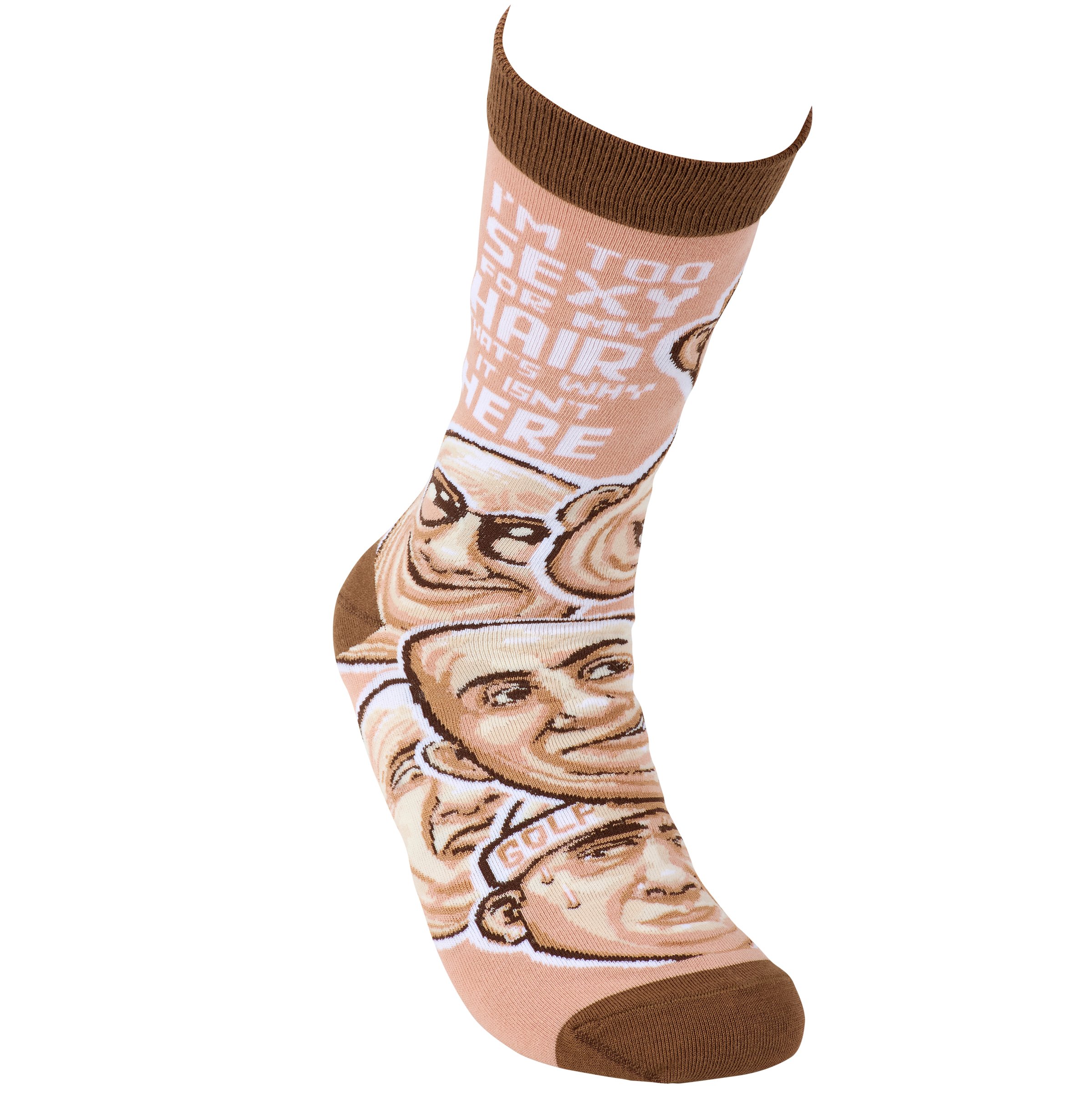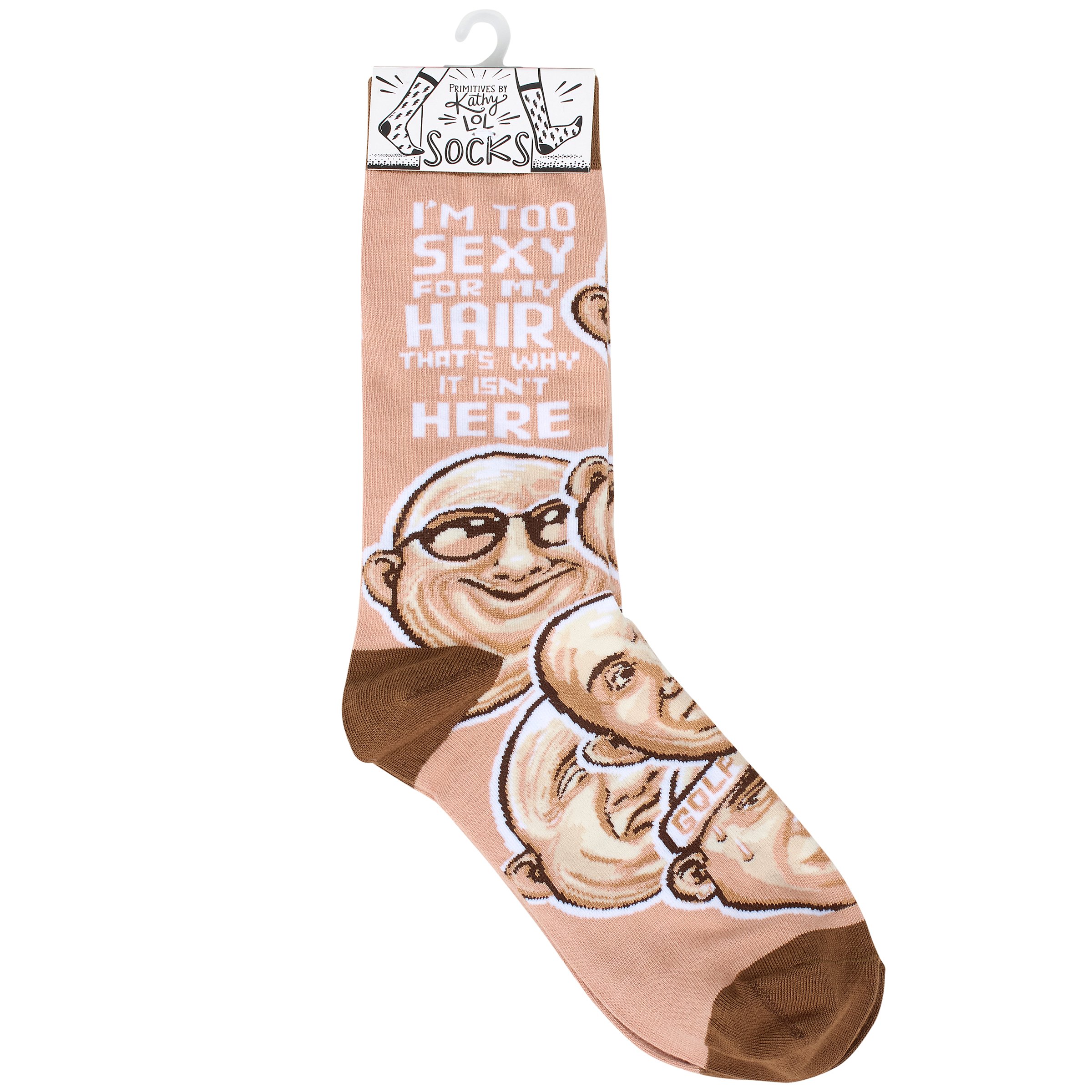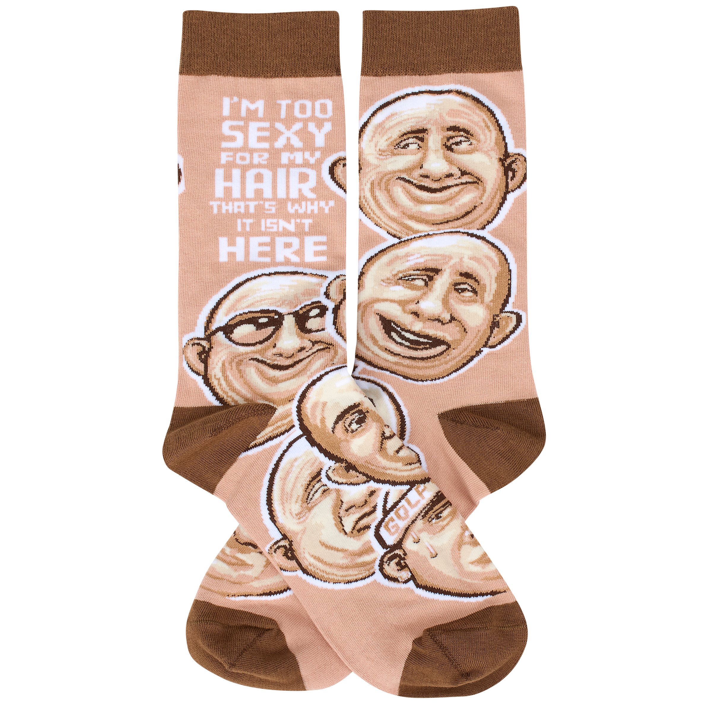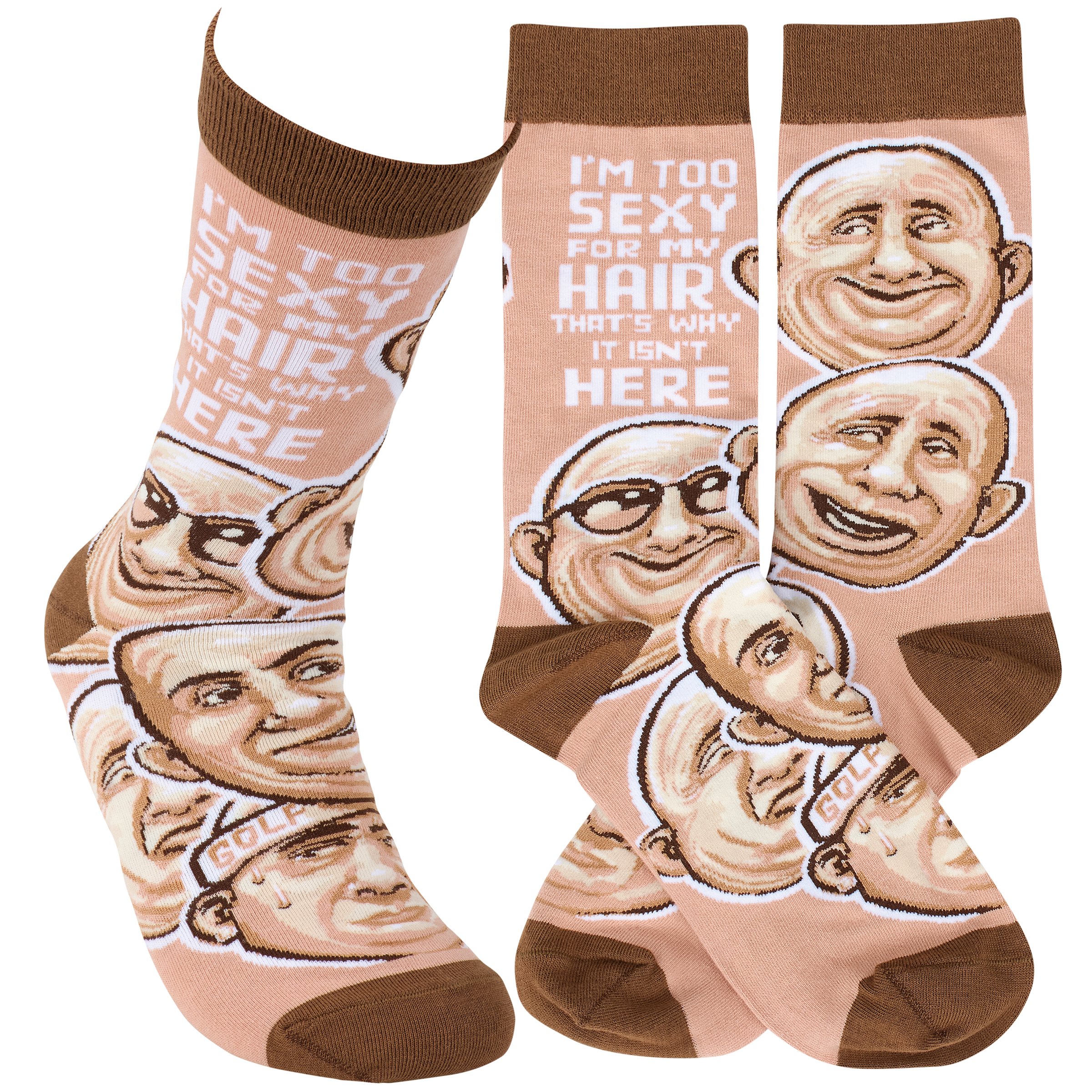 A pair of colorful socks from our LOL-Made You Smile Collection displaying playful hand illustrated designs of various bald heads with a funny sentiment that reads "I'm Too Sexy For My Hair That's Why It Isn't Here." These giftable socks are made with a cotton, nylon, and spandex blend for a one size fits most design. Our I'm Too Sexy For My Hair socks come with a decorative header card and a clear plastic hanger for easy rack display and gifting. A funny gift perfect for everyday self-expression.