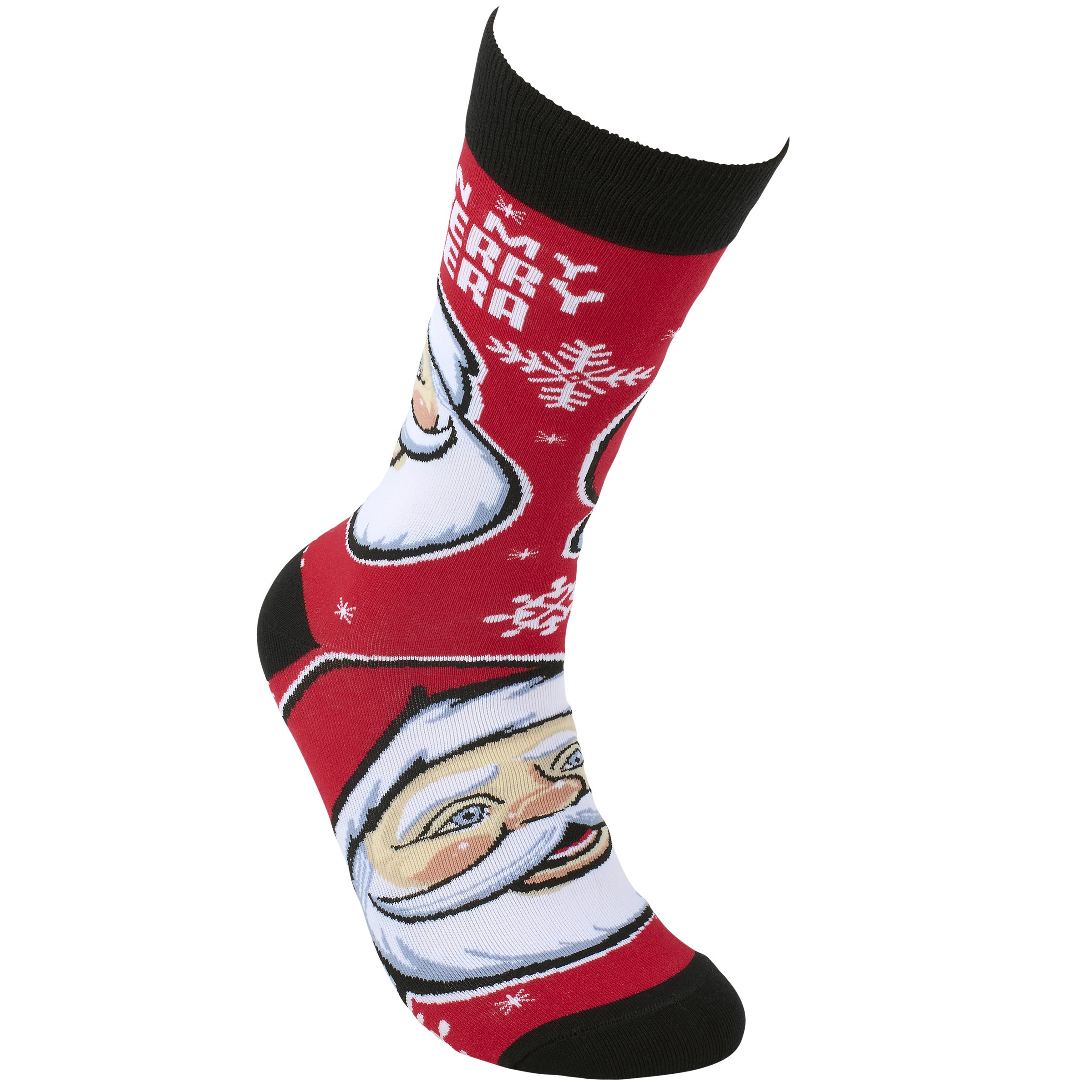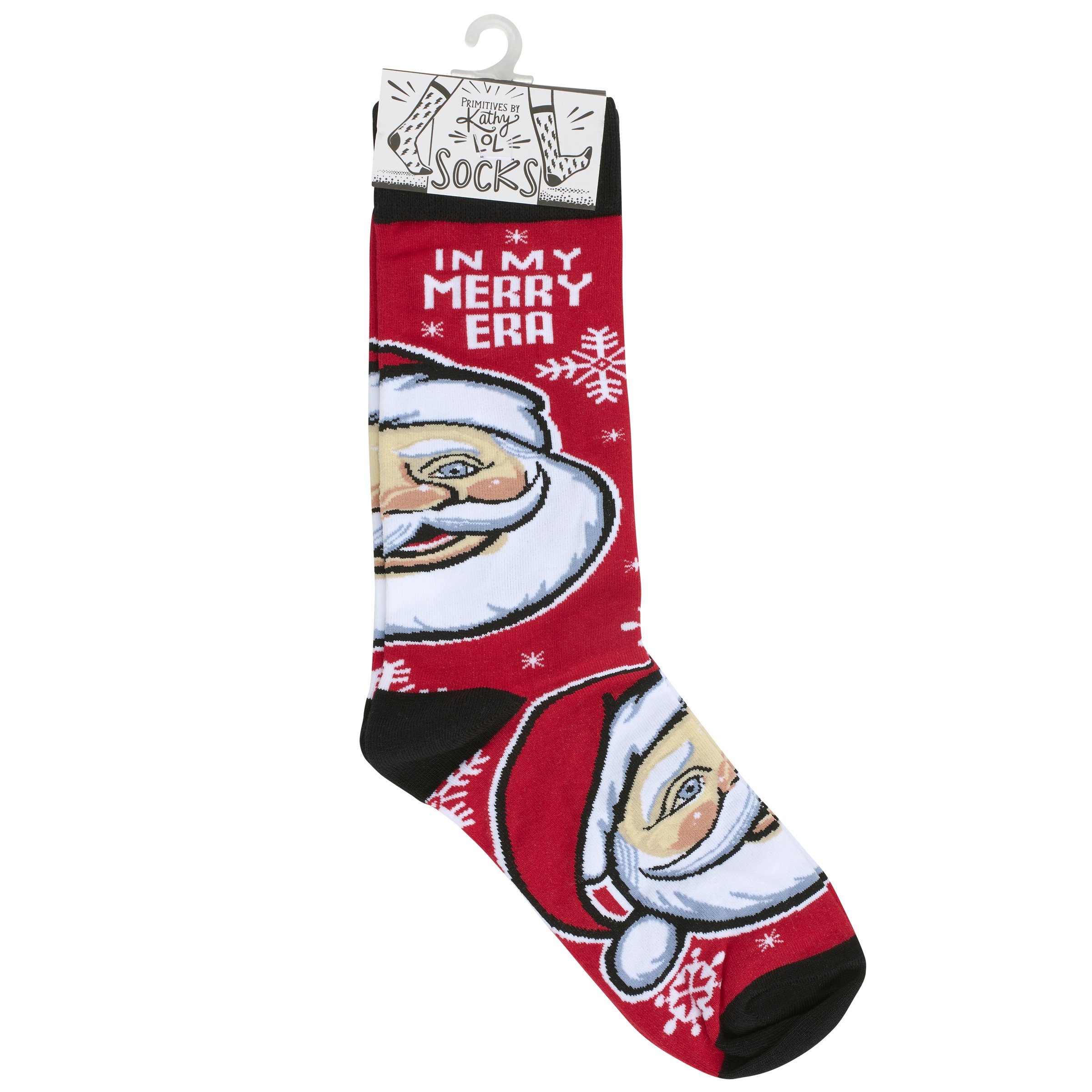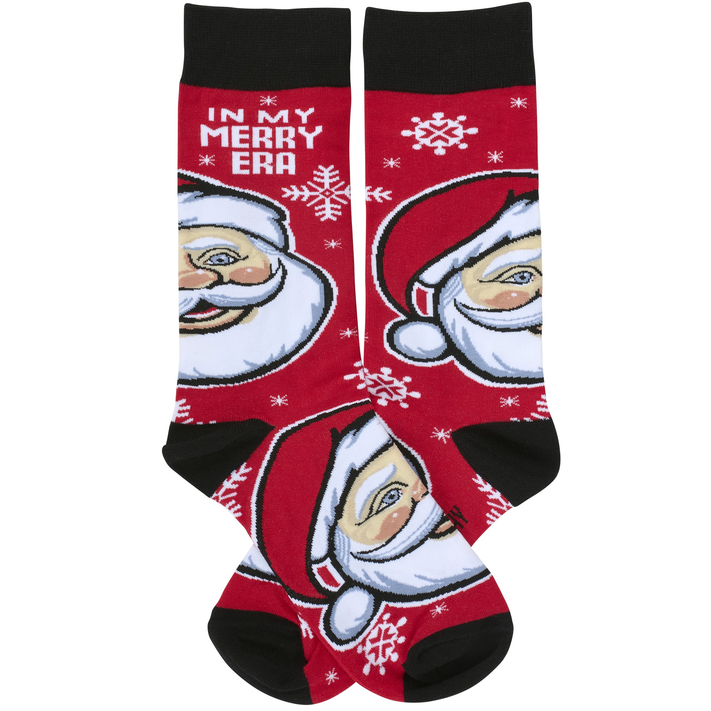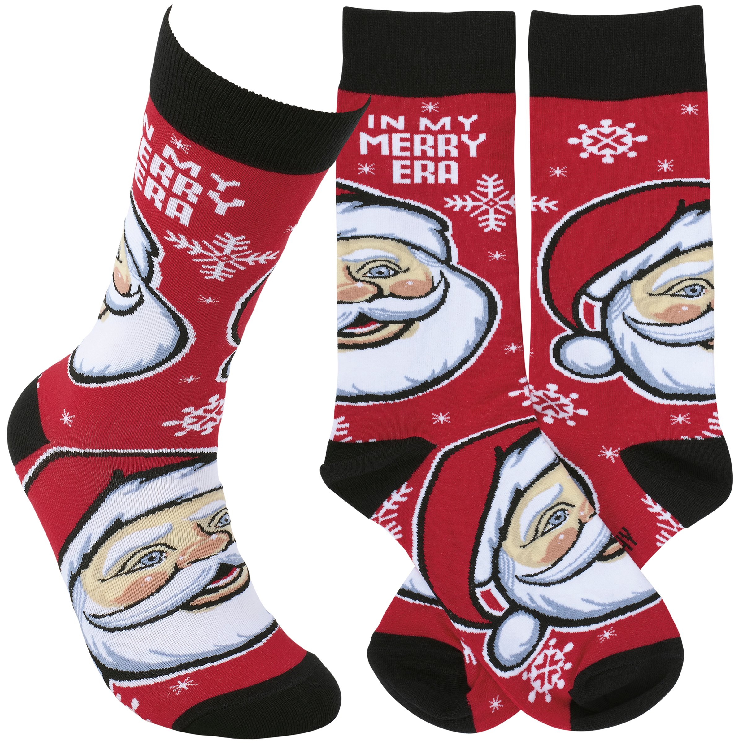 A pair of colorful socks from our Christmas Collection displaying playful hand illustrated designs of Santa heads and snowflakes with a funny seasonal sentiment that reads "In My Merry Era." These giftable socks are made with a cotton, nylon, and spandex blend for a one size fits most design. Our In My Merry Era socks come with a decorative header card and a clear plastic hanger for easy rack display and gifting. A funny Christmas gift perfect for fun seasonal style.