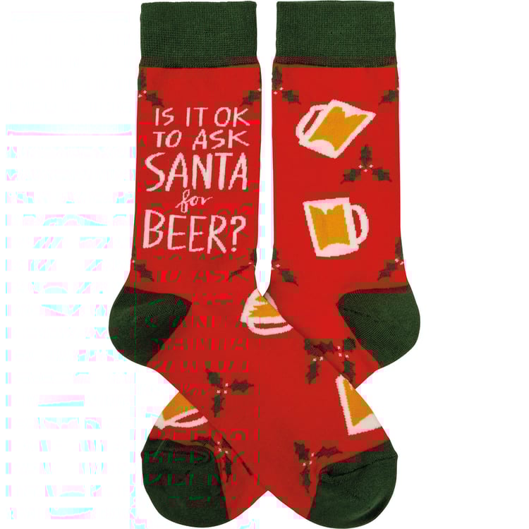 These colorful socks feature woven designs with coordinating "Is It Ok To Ask Santa For Beer?" sentiment. Cotton, nylon, spandex. One size fits most.