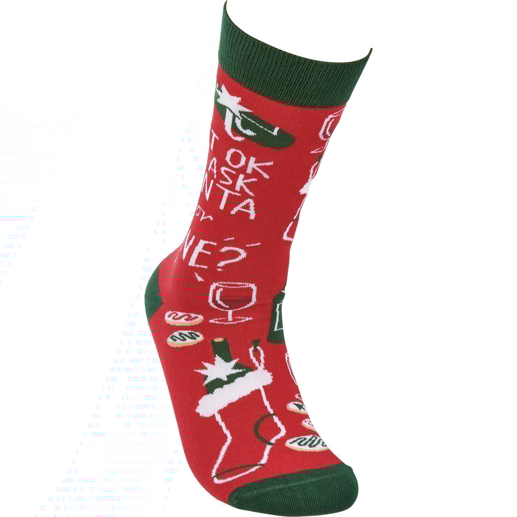 A pair of colorful woven socks from our Christmas Collection displaying unique hand illustrated designs of wine bottles and Christmas cookies with humorous sentiment that reads "Is It Ok To Ask Santa For Wine?" Socks feature a one size fits most design made with cotton, nylon, and spandex. Our Is It Okay To Ask Santa For Wine socks come with a header card and a clear plastic hanger for display. A fun seasonal accessory perfect for self-expression or for gifting.