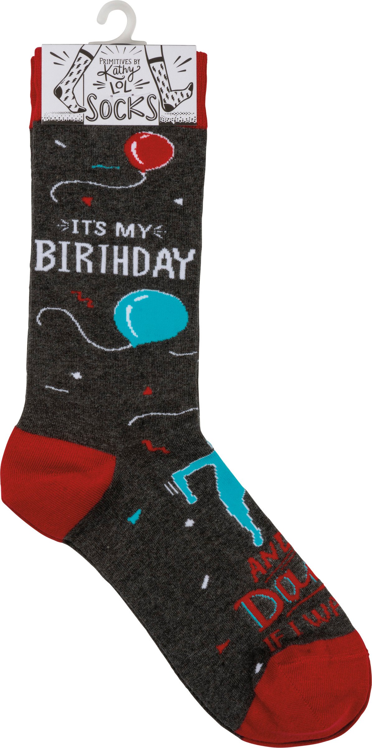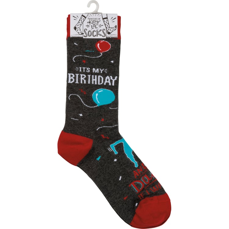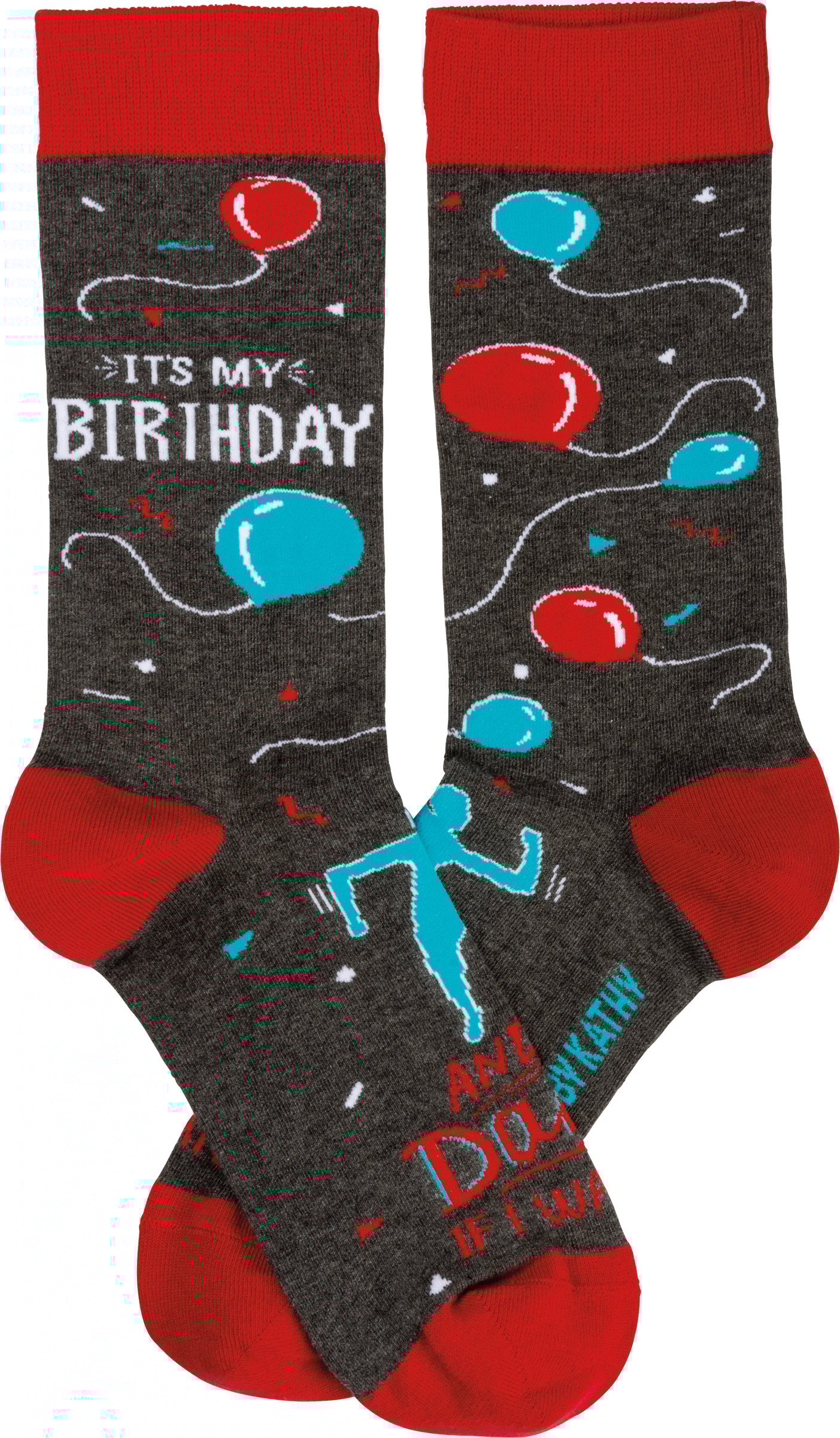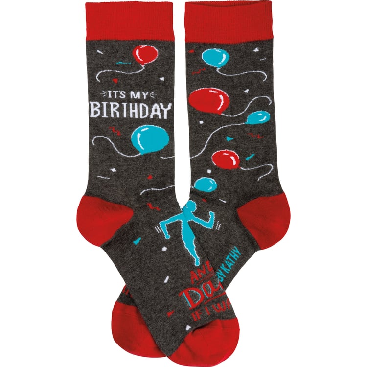 These colorful socks feature woven designs with coordinating "It's My Birthday And I'll Dance If I Want To" sentiment. Cotton, nylon, spandex. One size fits most.