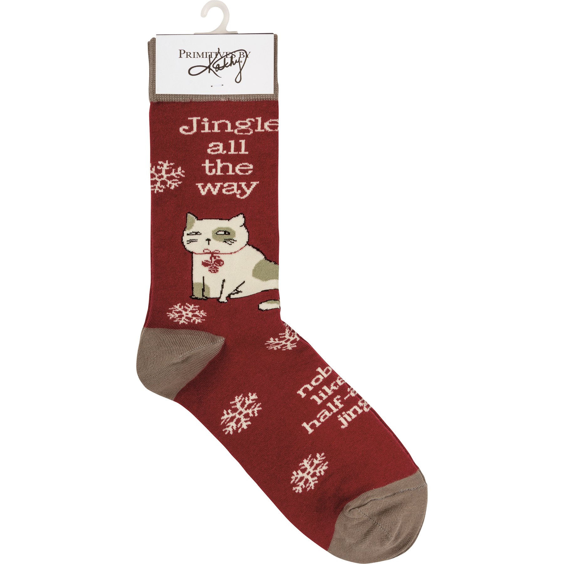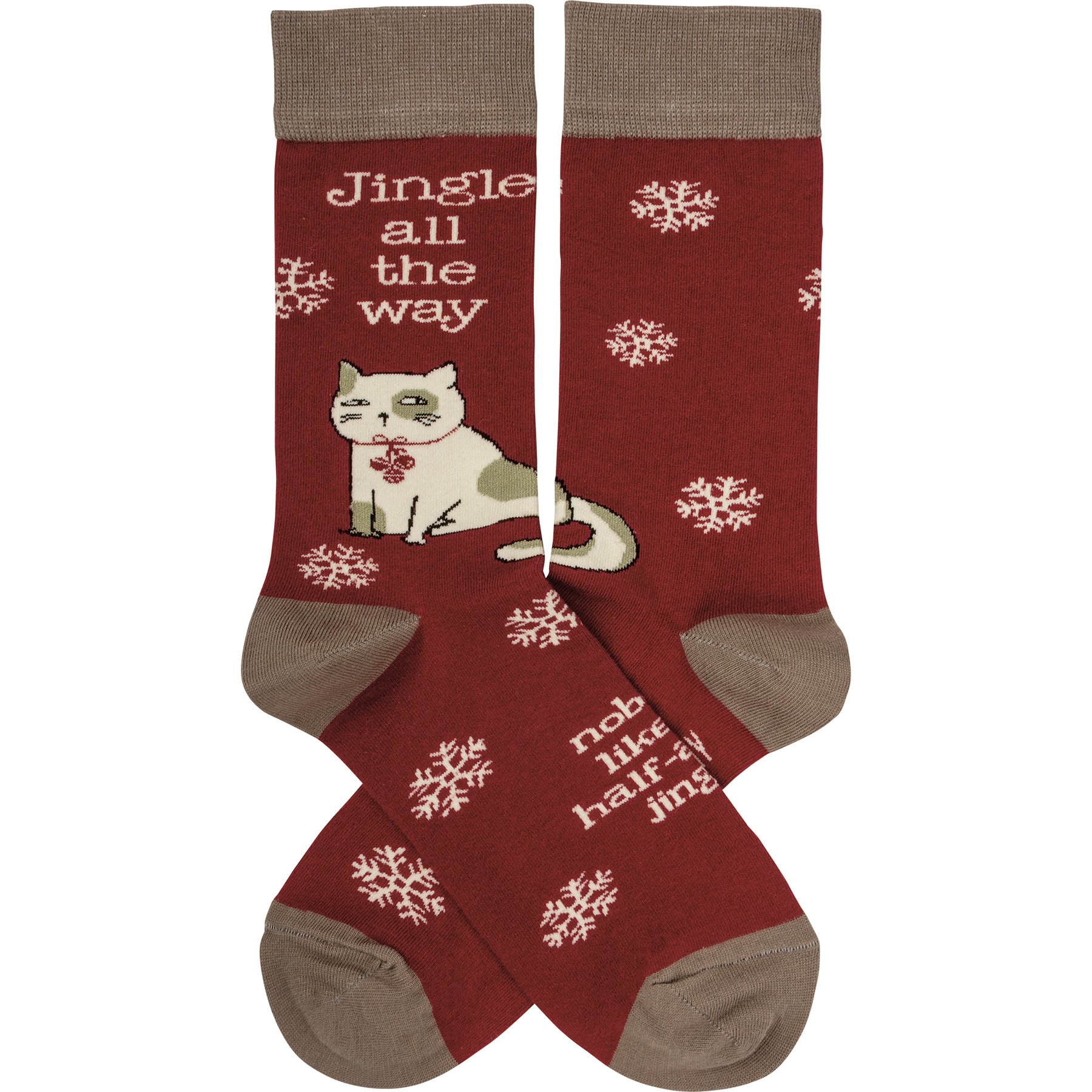 These colorful socks feature woven designs with coordinating "Jingle All The Way Nobody Likes A Half-Assed Jingler" sassy sentiment. Cotton, nylon, spandex. One size fits most.