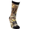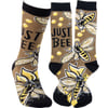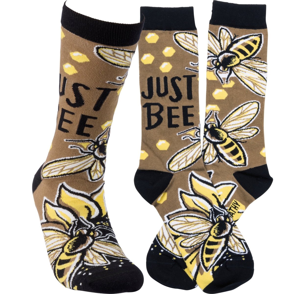 These colorful socks feature woven designs with coordinating "Just Bee" sentiment. Cotton, nylon, spandex. One size fits most.