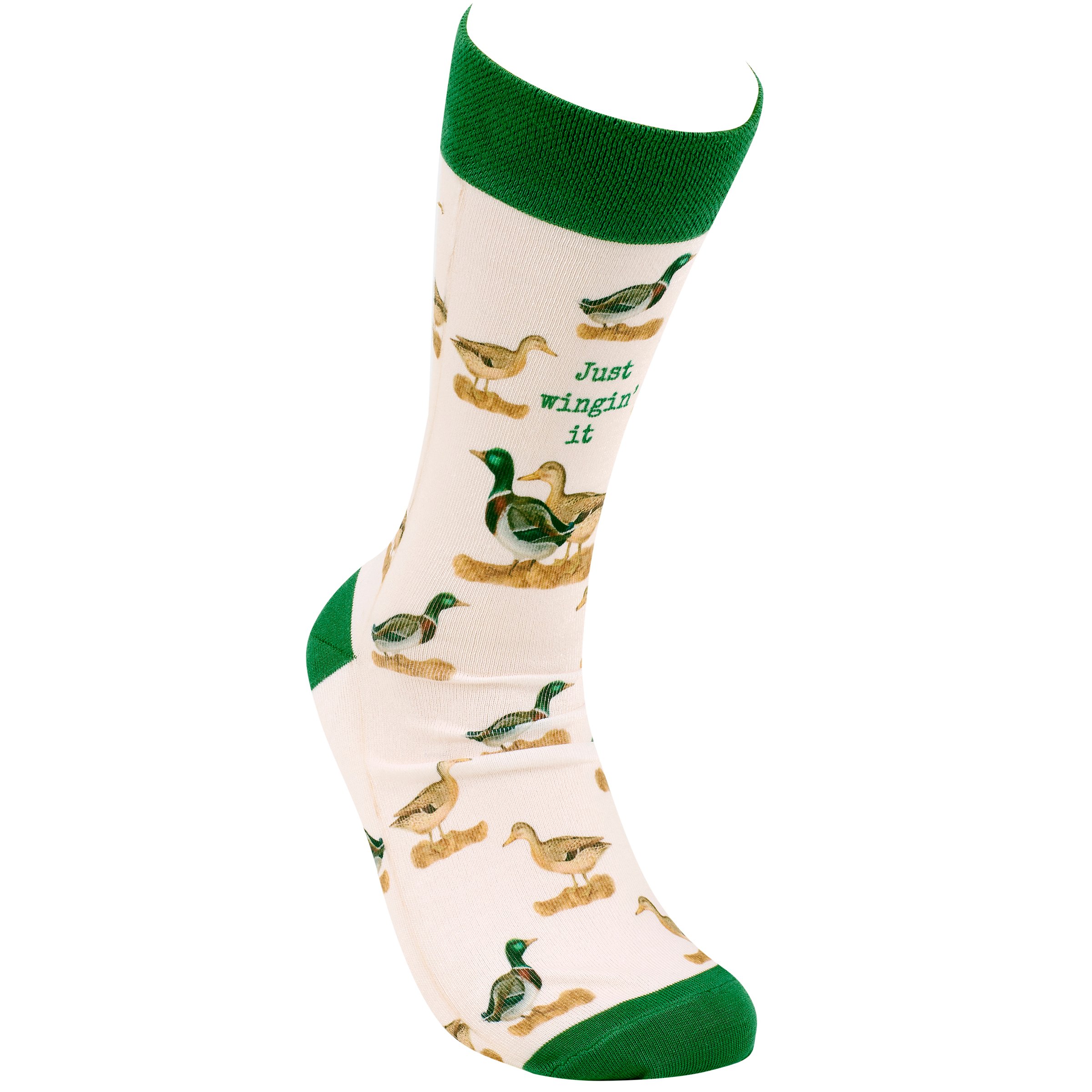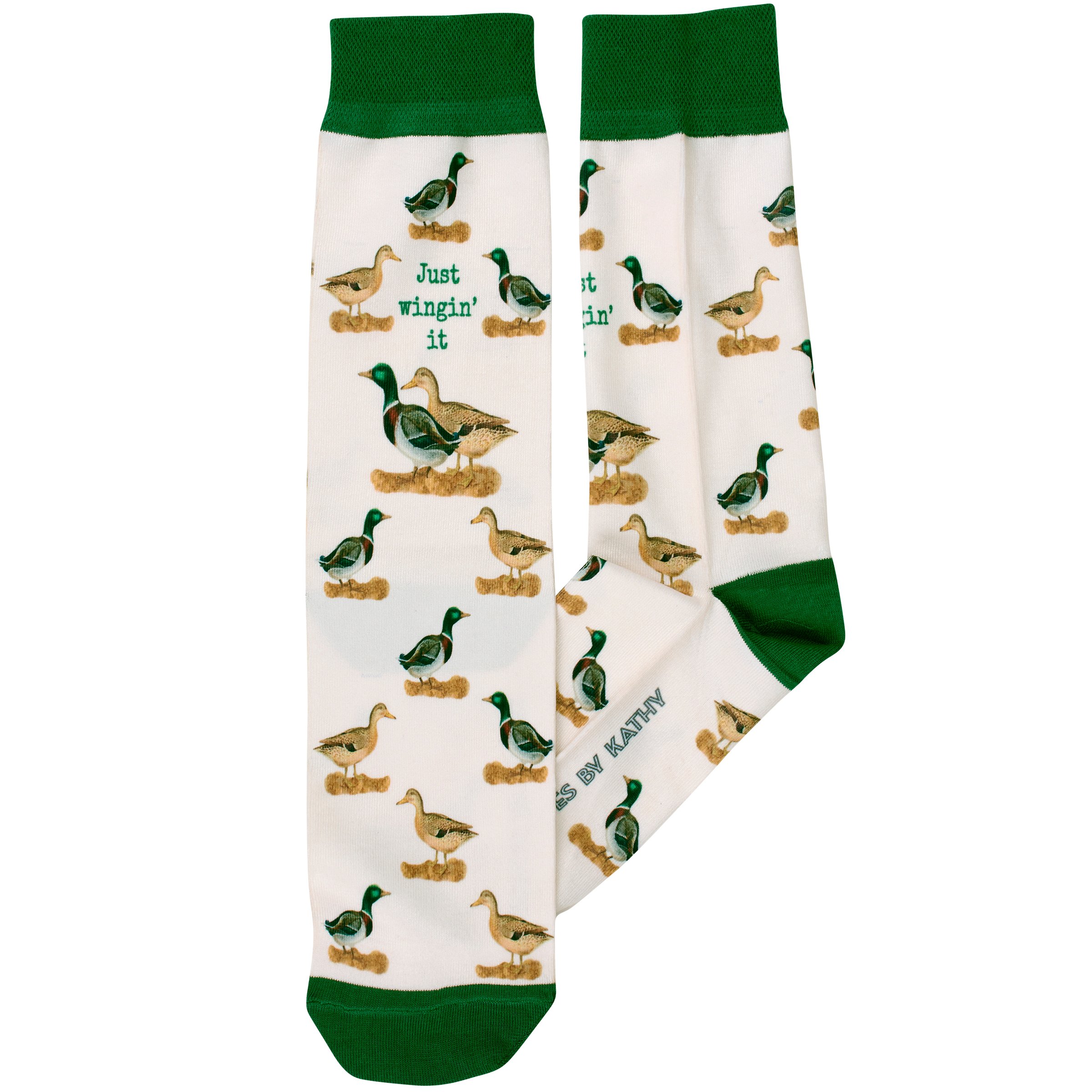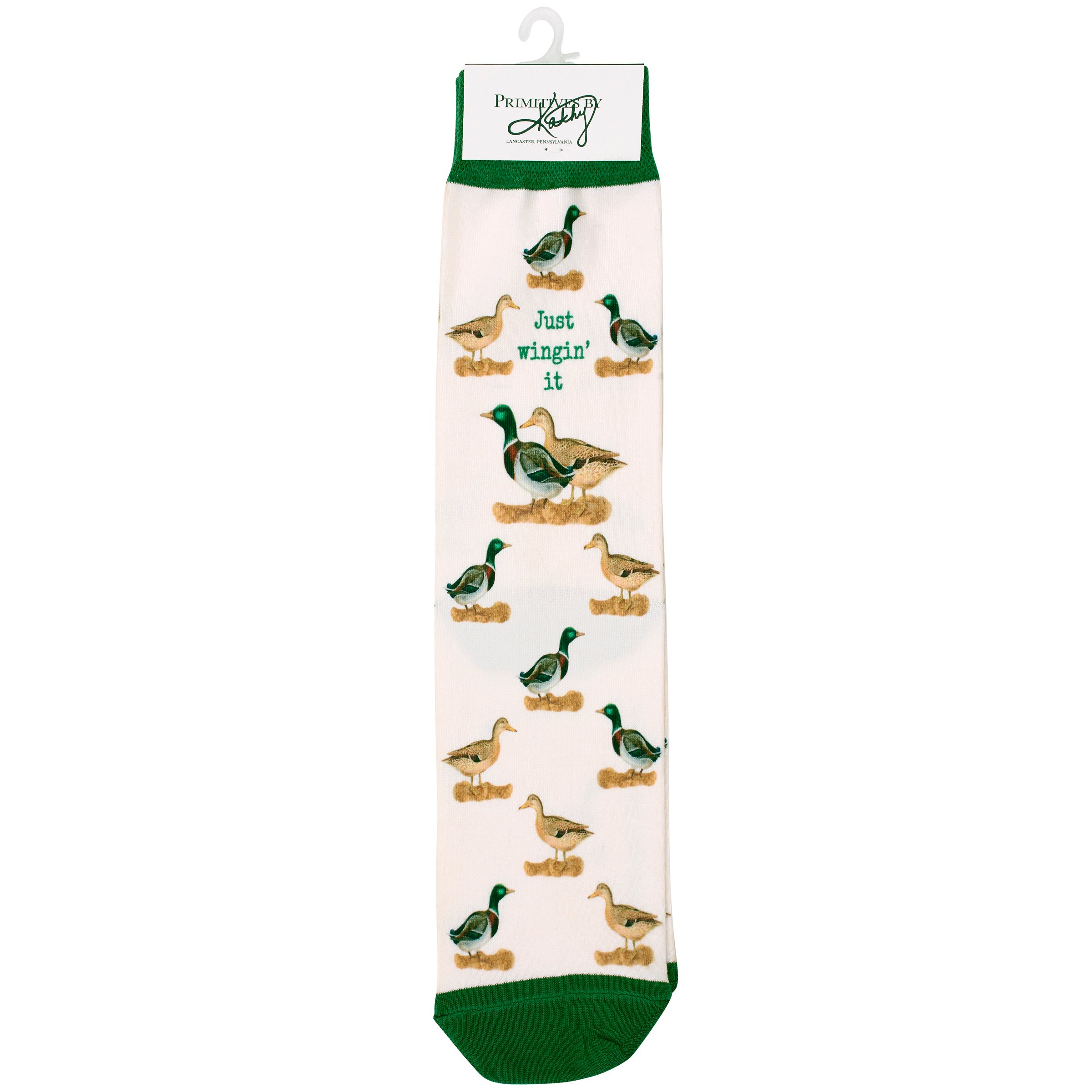 A pair of fun socks from our Farmhouse Collection featuring an all-over design displaying vintage art of ducks with a funny animal pun on the front that reads "Just Wingin' It" as well as green color accents on the cuff, heel, and toe. These giftable socks are made with a spandex blend for a one size fits most design. Our Just Wingin' It socks come with a decorative header card and a clear plastic hanger for easy rack display and gifting. A fun farm themed gift perfect for everyday self-expression.
