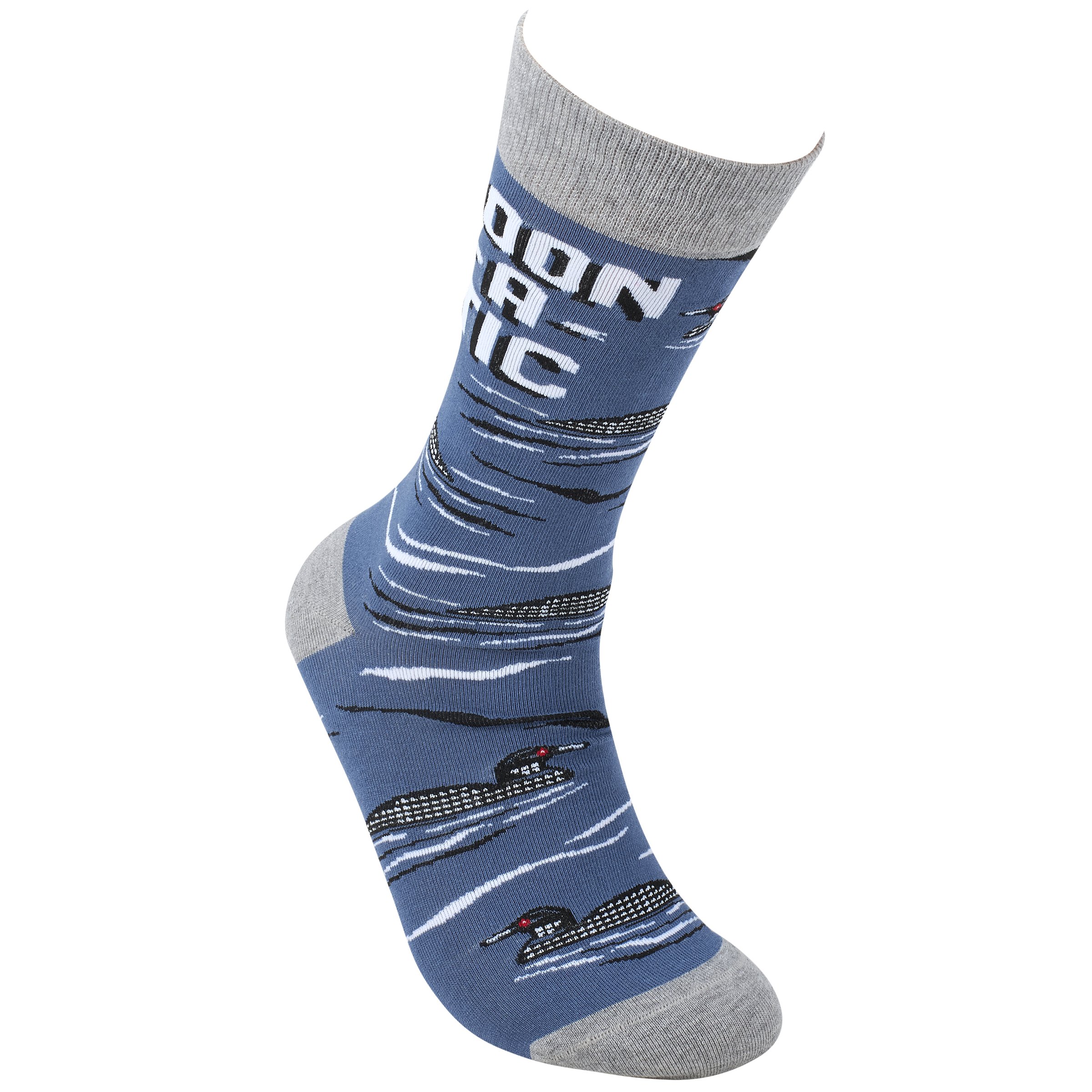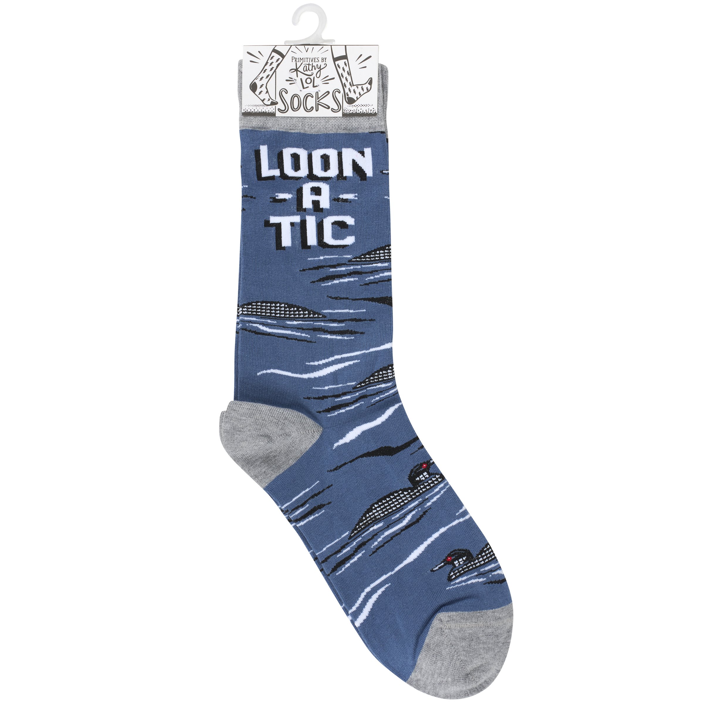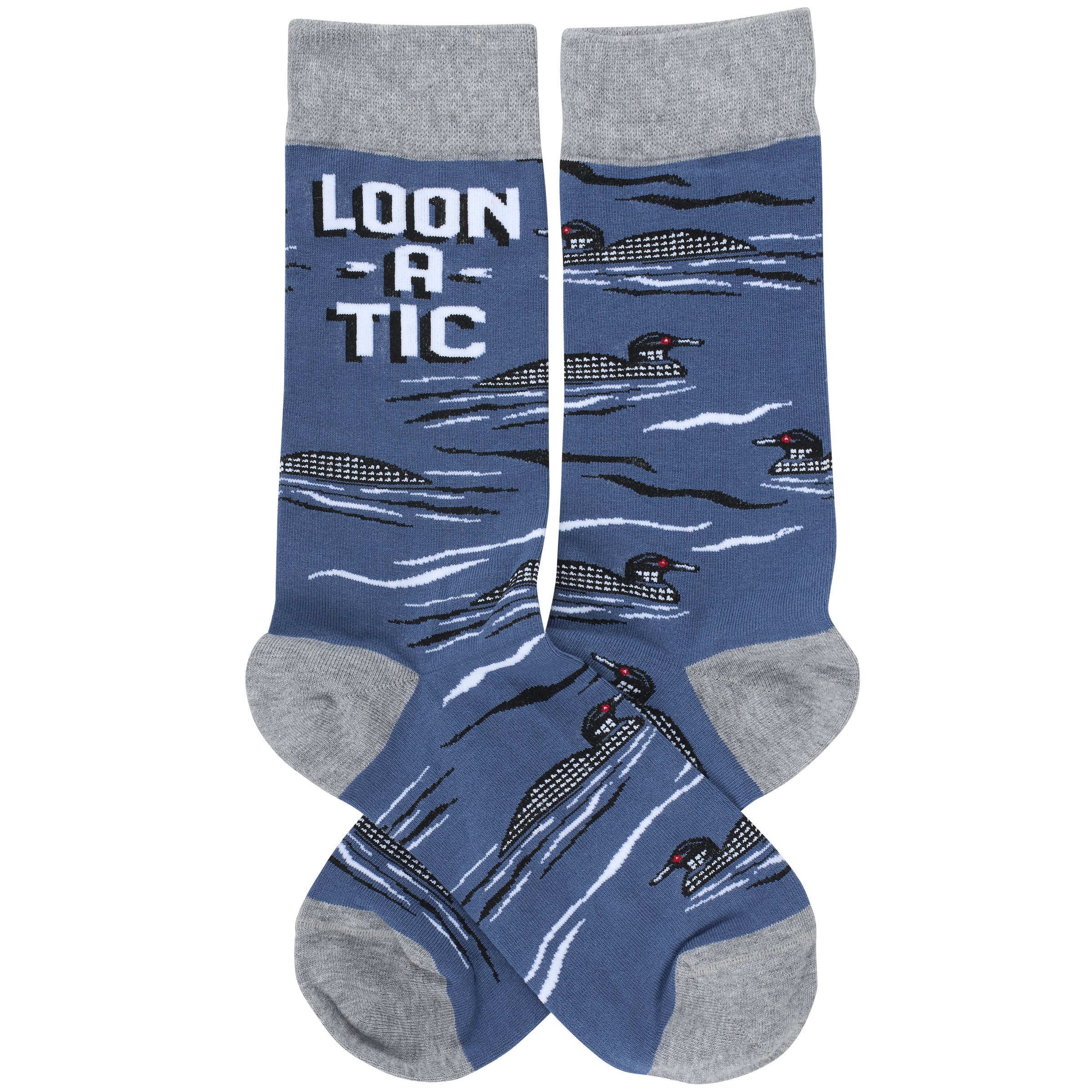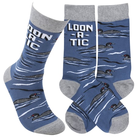 A pair of colorful socks from our Lake & Cabin Collection displaying playful hand illustrated designs of loons floating in a lake with a fun lake inspired sentiment that reads "Loon-A-Tic." These giftable socks are made with a cotton, nylon, and spandex blend for a one size fits most design. Our Loon-A-Tic socks come with a decorative header card and a clear plastic hanger for easy rack display and gifting. A fun lake themed gift perfect for an outdoor accessory or everyday self-expression.