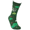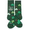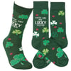 A pair of colorful socks from our St. Patrick's Day Collection displaying unique hand illustrated designs of shamrocks and ladybugs with a luck-themed sentiment that reads "These Are My Lucky Socks." Socks feature a one size fits most design made with cotton, nylon, and spandex. Our Lucky Socks socks come with a header card and a clear plastic hanger for display. A fun St. Patrick's Day accessory perfect for holidays and seasonal events.