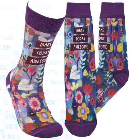 A pair of colorful socks from our Inspiration & Blooms Collection displaying a full-color design of abstract florals with an inspirational sentiment that reads "Make Today Awesome." Floral design is digitally printed replicating original hand illustrated artwork with purple color accents on the cuff, heel, and toe. These giftable socks are made with a spandex blend for a one size fits most design. Our Make Today Awesome socks come with a decorative header card and a clear plastic hanger for easy rack display and gifting. An inspirational gift perfect for everyday self-expression.
