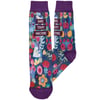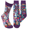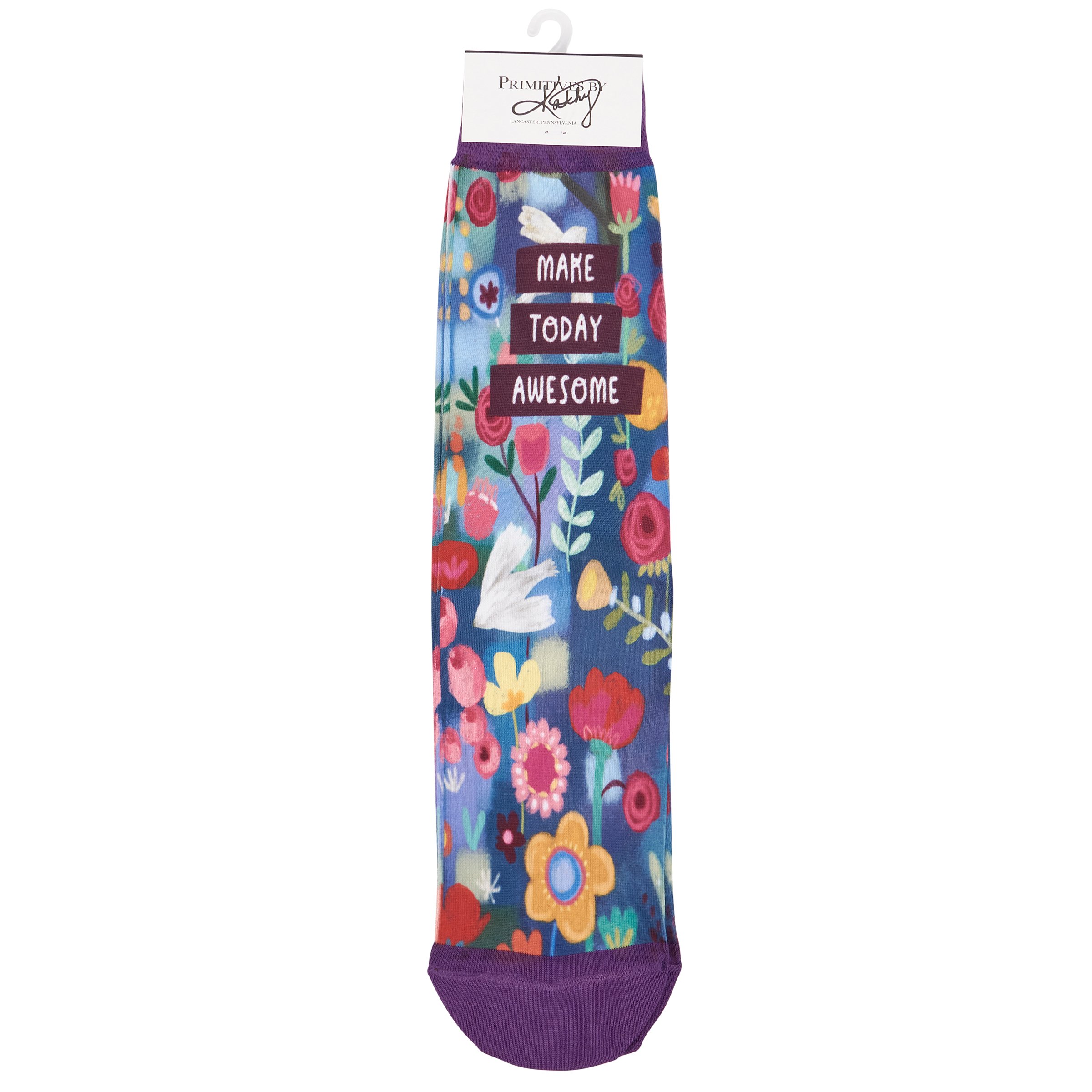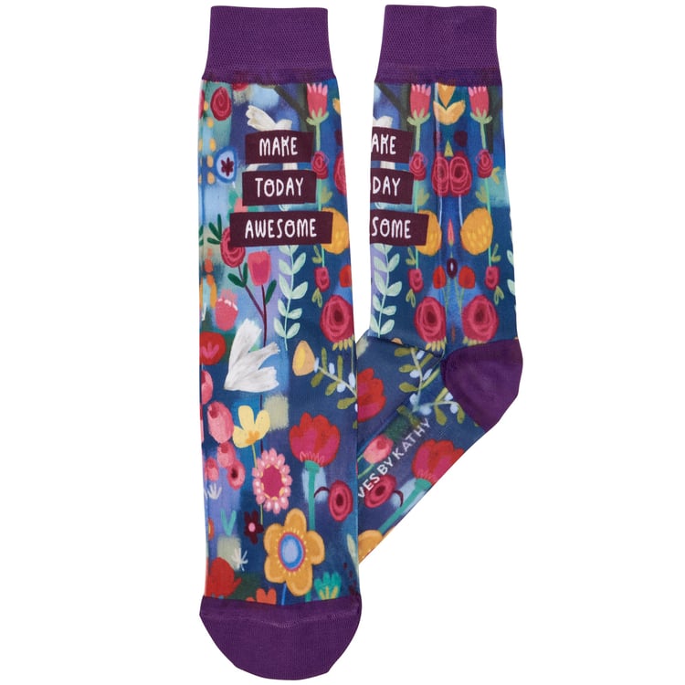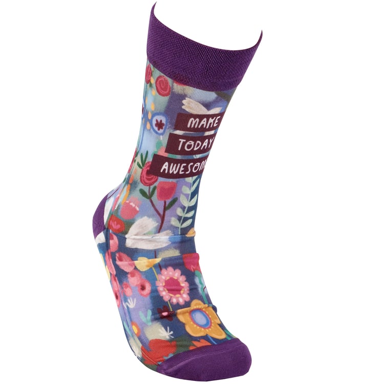 A pair of colorful socks from our Inspiration & Blooms Collection displaying a full-color design of abstract florals with an inspirational sentiment that reads "Make Today Awesome." Floral design is digitally printed replicating original hand illustrated artwork with purple color accents on the cuff, heel, and toe. These giftable socks are made with a spandex blend for a one size fits most design. Our Make Today Awesome socks come with a decorative header card and a clear plastic hanger for easy rack display and gifting. An inspirational gift perfect for everyday self-expression.