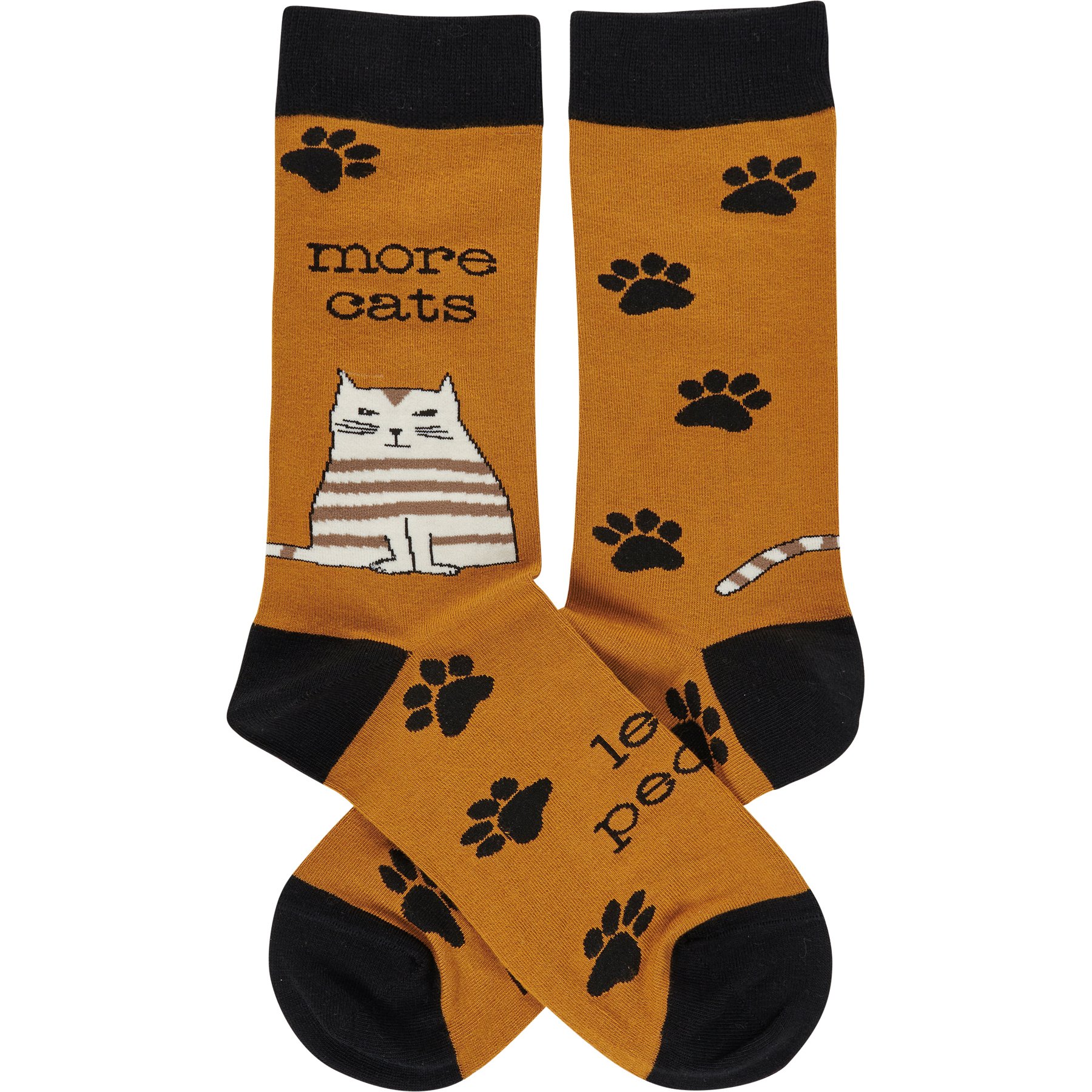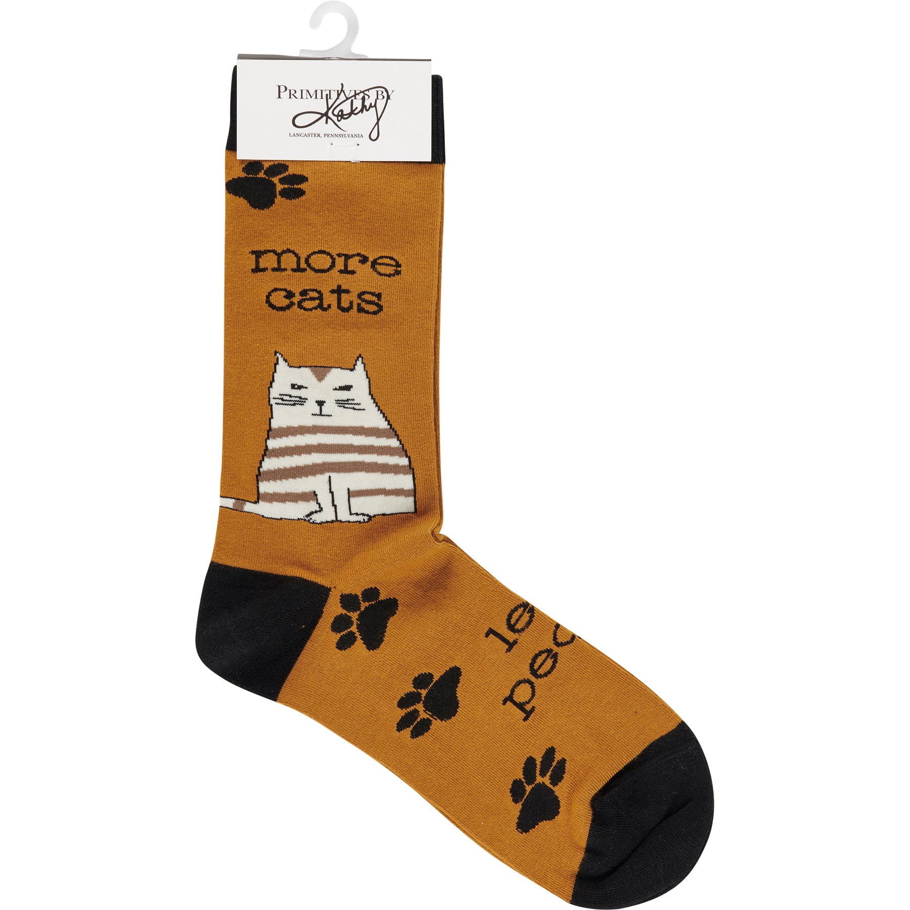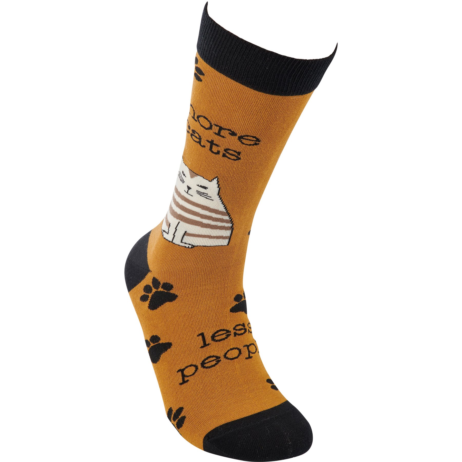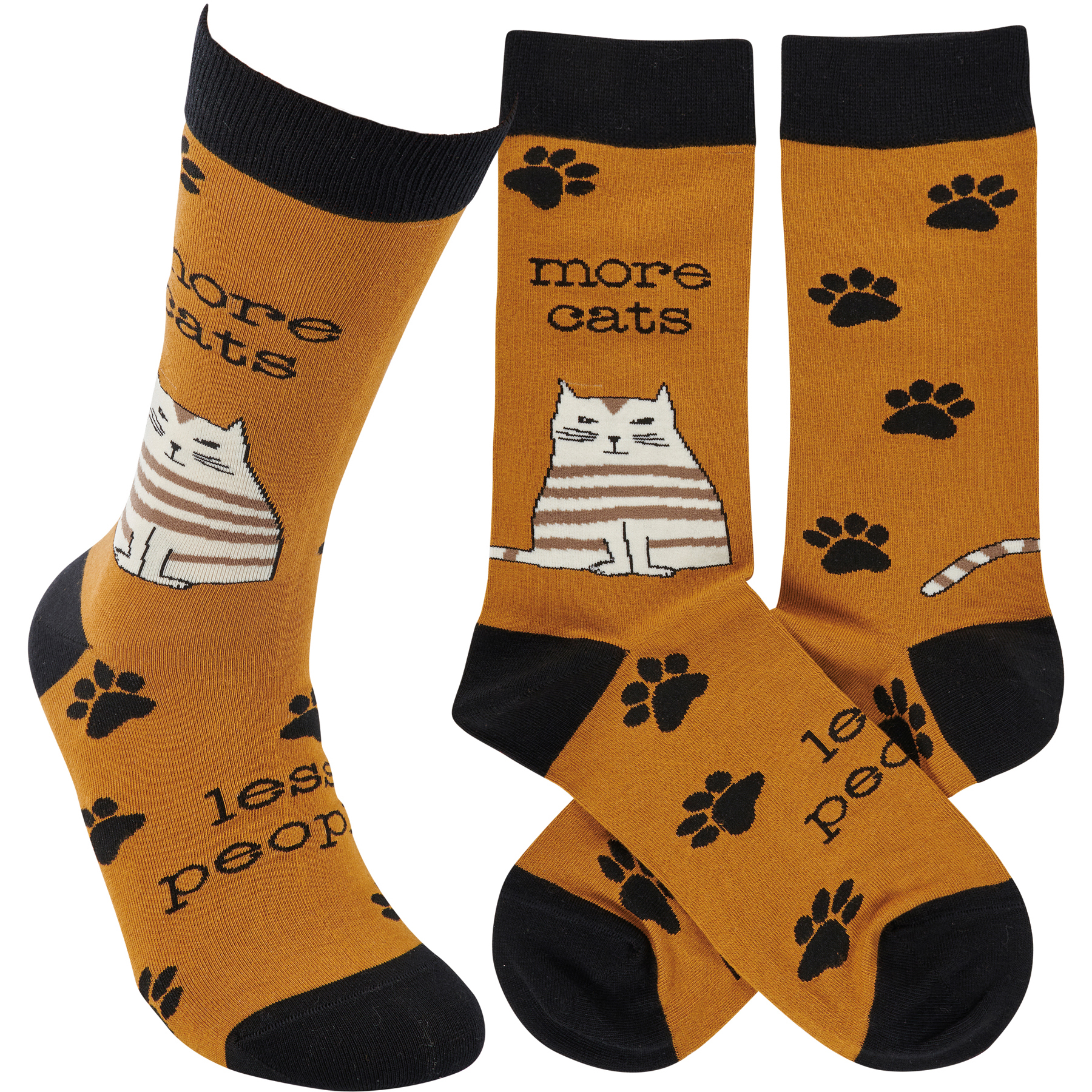 A pair of colorful woven socks from our Pet Collection displaying a rustic design of a sassy cat and pawprints with "More Cats Less People" sentiment. Socks feature a one size fits most design made with cotton, nylon, and spandex. Our More Cats Less People socks come with a header card and a clear plastic hanger for display. A fun everyday accessory perfect for self-expression or gifting on any occasion.