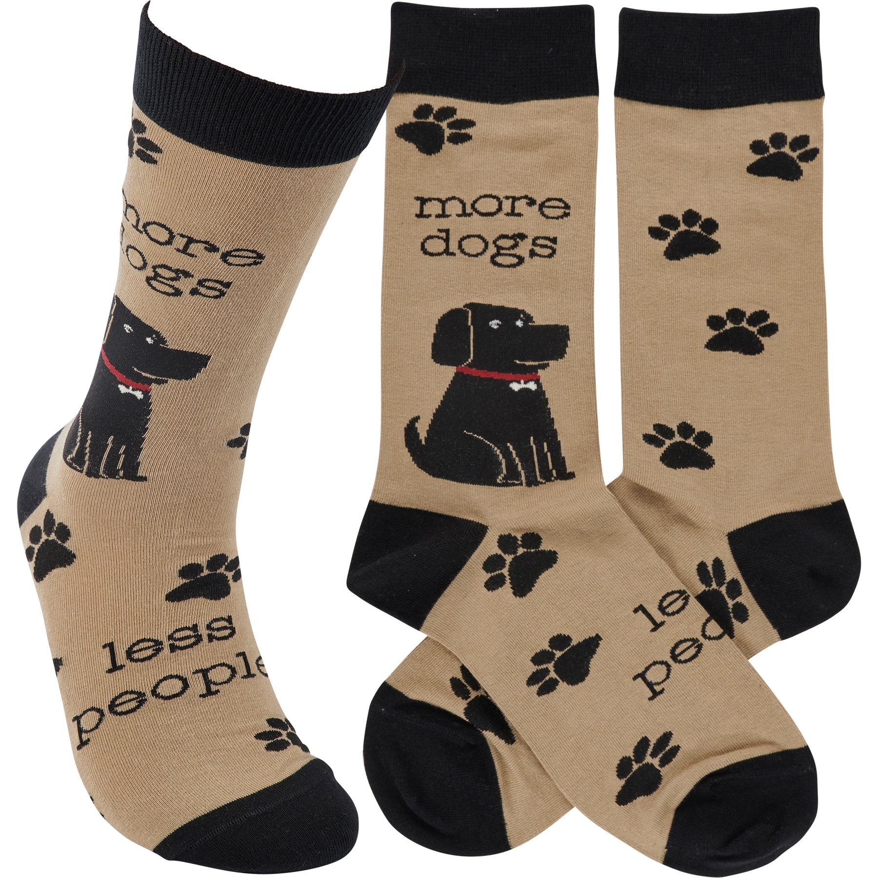 A pair of colorful woven socks from our Pet Collection displaying a rustic design of a happy dog and pawprints with "More Dogs Less People" sentiment. Socks feature a one size fits most design made with cotton, nylon, and spandex. Our More Dogs Less People socks come with a header card and a clear plastic hanger for display. A fun everyday accessory perfect for self-expression or gifting on any occasion.