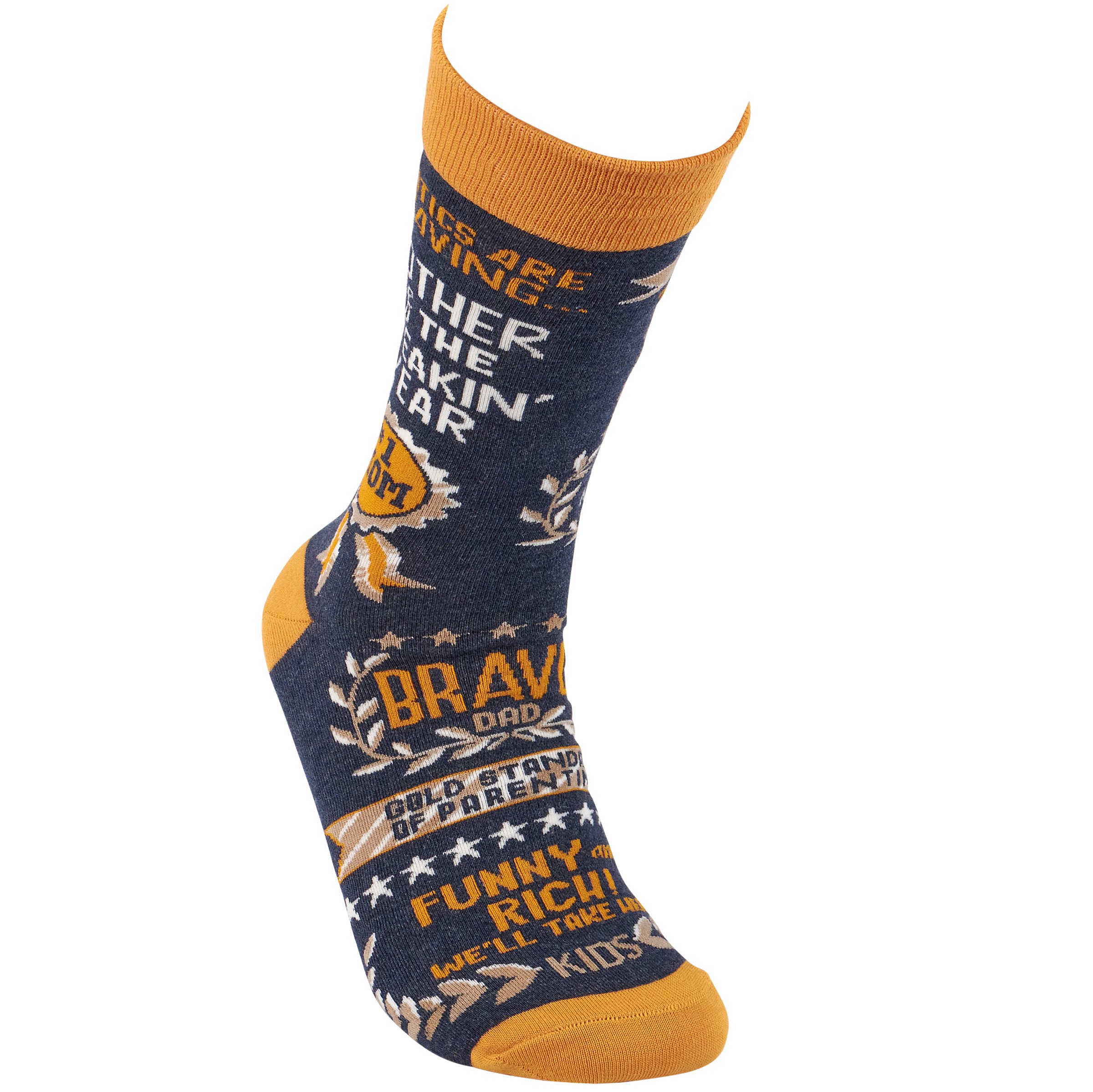 A pair of colorful socks from our Mother's Day Collection displaying playful hand illustrated designs of fun mom themed reviews and awards. These giftable socks are made with a cotton, nylon, and spandex blend for a one size fits most design. Our Mother Of The Year socks come with a decorative header card and a clear plastic hanger for easy rack display and gifting. A fun mother's day gift perfect for everyday self-expression.