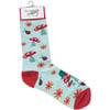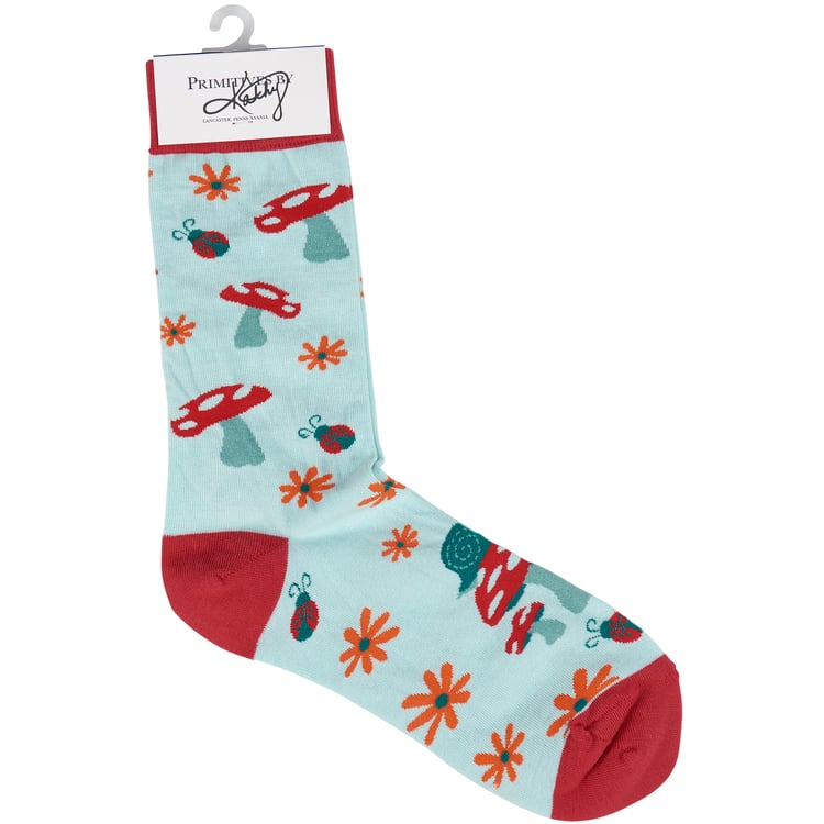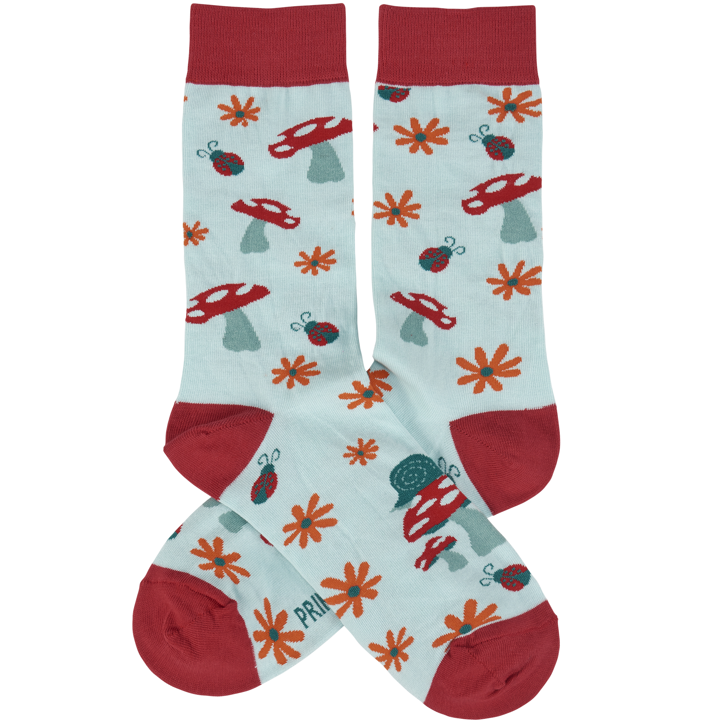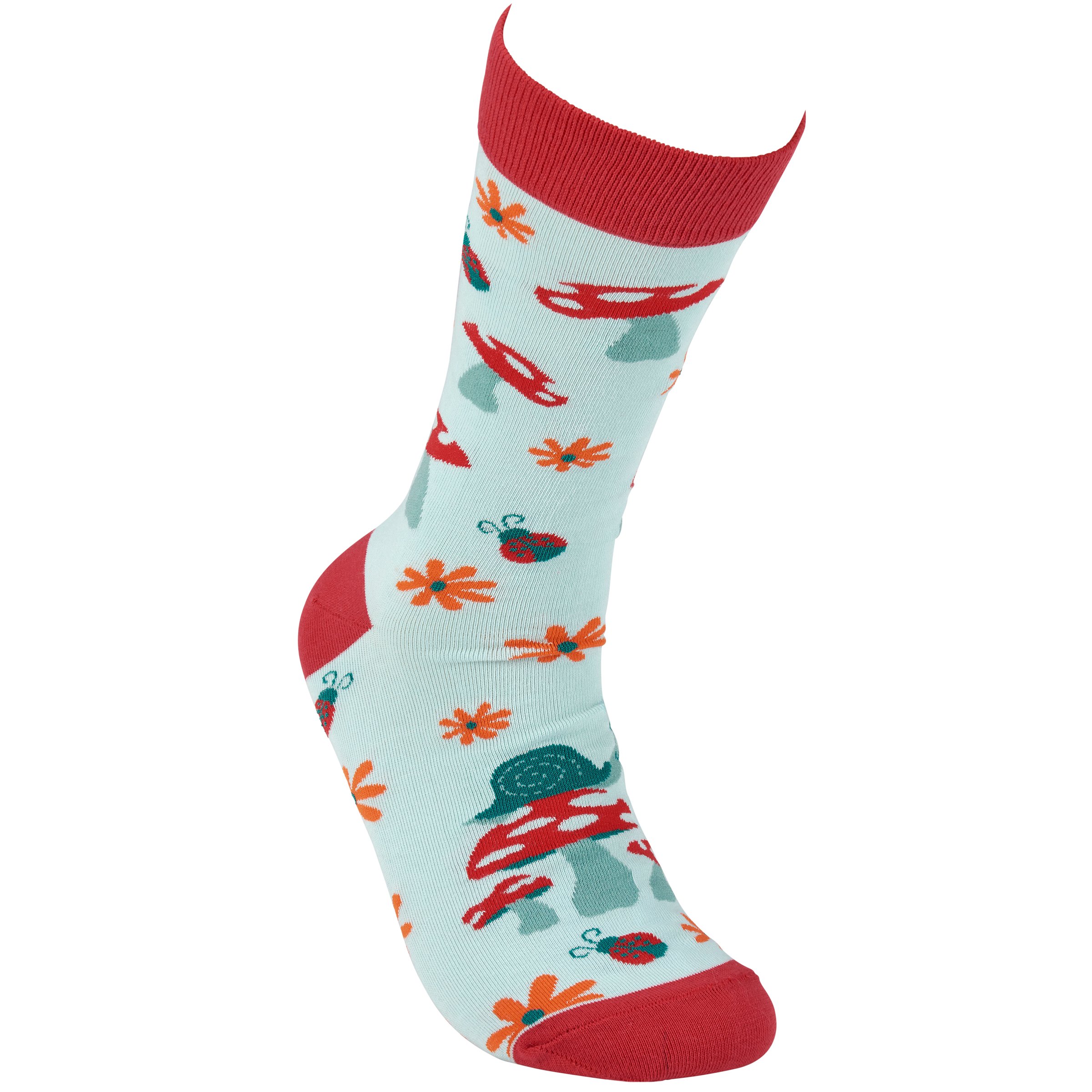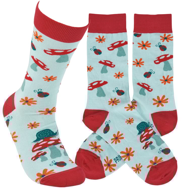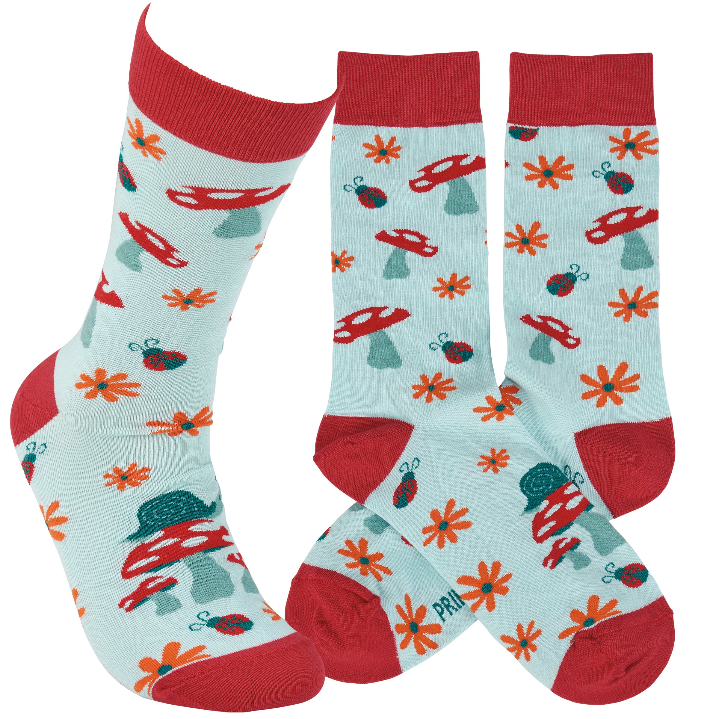 A pair of colorful socks from our Inspiration & Blooms Collection displaying hand illustrated designs of colorful mushrooms and flowers on green background. Socks feature a one size fits most design made with cotton, nylon, and spandex. Our Mushrooms socks come with a header card and a clear plastic hanger for display. An inspirational gift perfect for everyday self-expression.