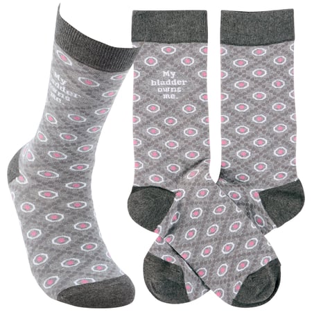 A pair of retro socks from our Trash Talk By Annie Collection flaunting a classy pink and gray pattern with a humorous sentiment that reads "My Bladder Owns Me." These cozy socks are made with cotton, nylon, and spandex to create a one-size-fits-most design. Each pair of socks are packaged on a clear plastic hanger with header card for graceful display in store. Our My Bladder socks call back to a vintage style with modern sassy sentiments, perfect for making a statement while getting a giggle out of others. Colorful and cozy socks always make a great gift for everyday self-expression.