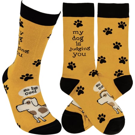 These colorful socks feature woven designs with coordinating "My Dog Is Judging You So Be Cool" sentiment. Cotton, nylon, spandex. One size fits most.