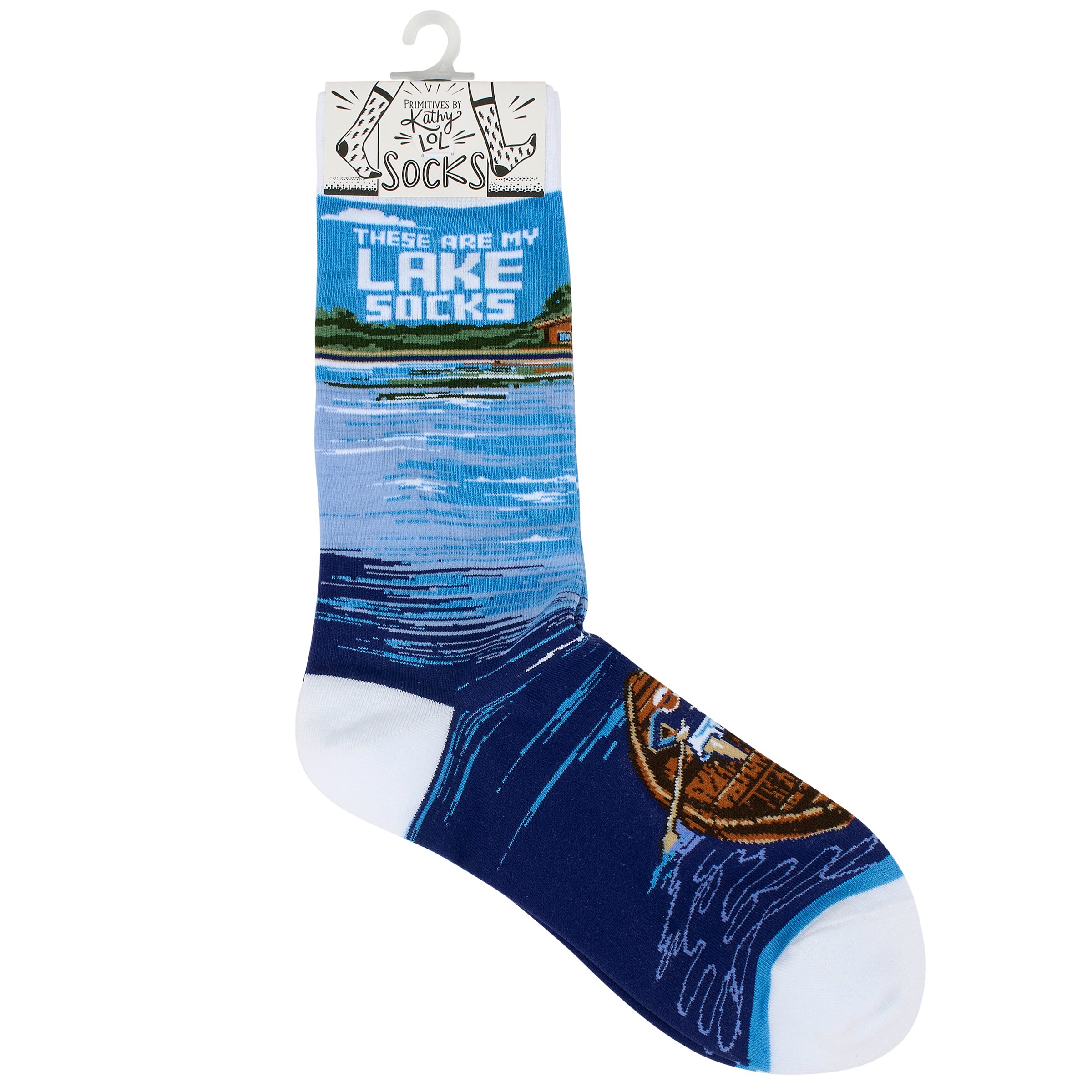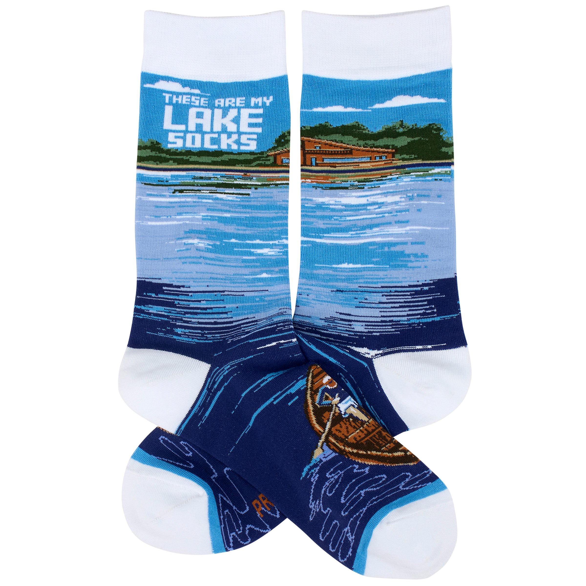 A pair of colorful socks from our Lake & Cabin Collection displaying a playful hand illustrated scene of a row boat and lake house with a fun lake inspired sentiment that reads "These Are My Lake Socks." These giftable socks are made with a cotton, nylon, and spandex blend for a one size fits most design. Our My Lake socks come with a decorative header card and a clear plastic hanger for easy rack display and gifting. A fun lake themed gift perfect for an outdoor accessory or everyday self-expression.