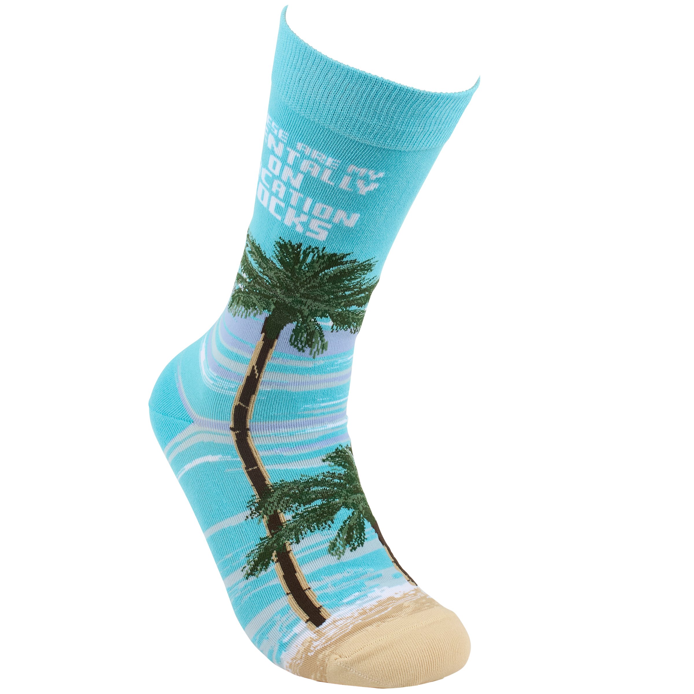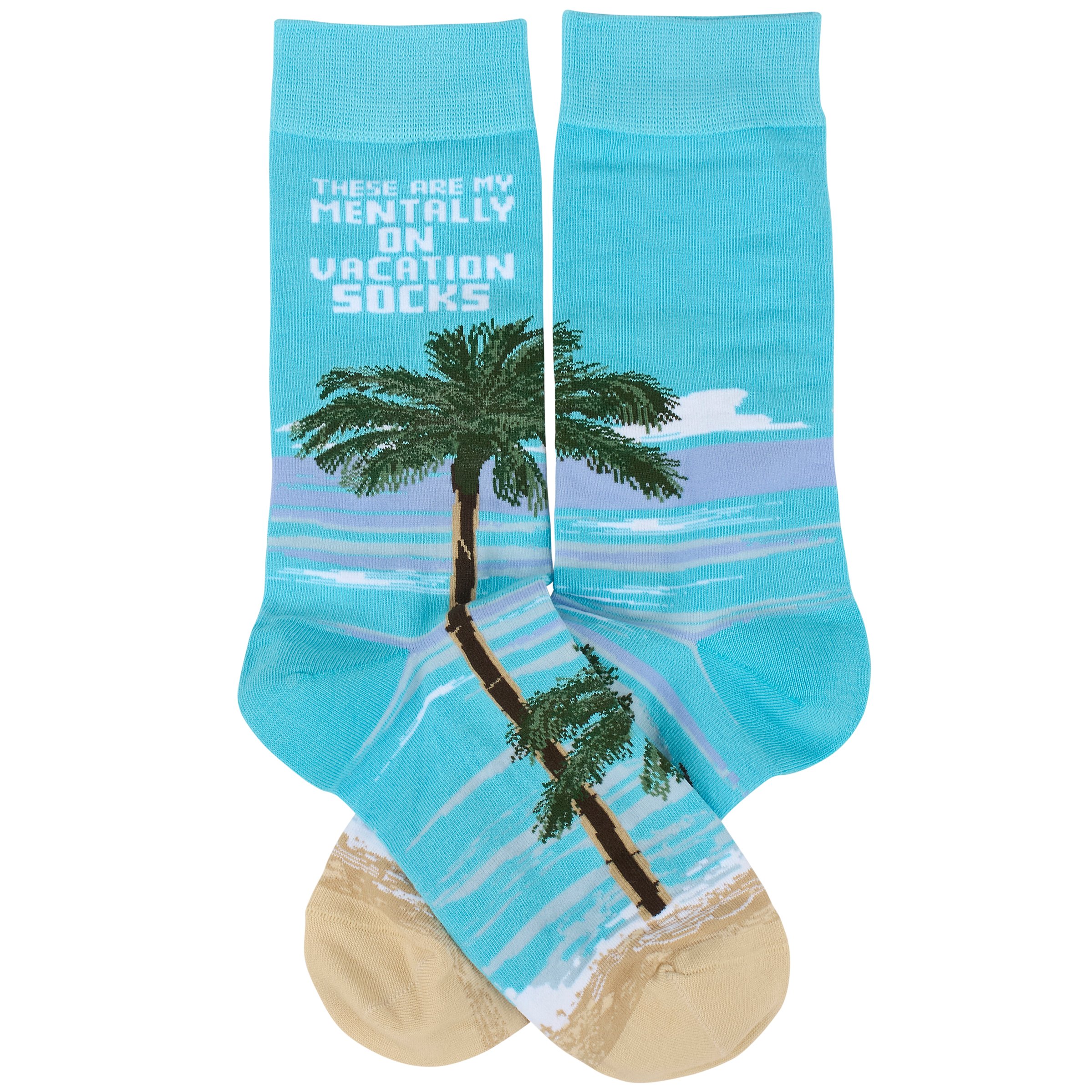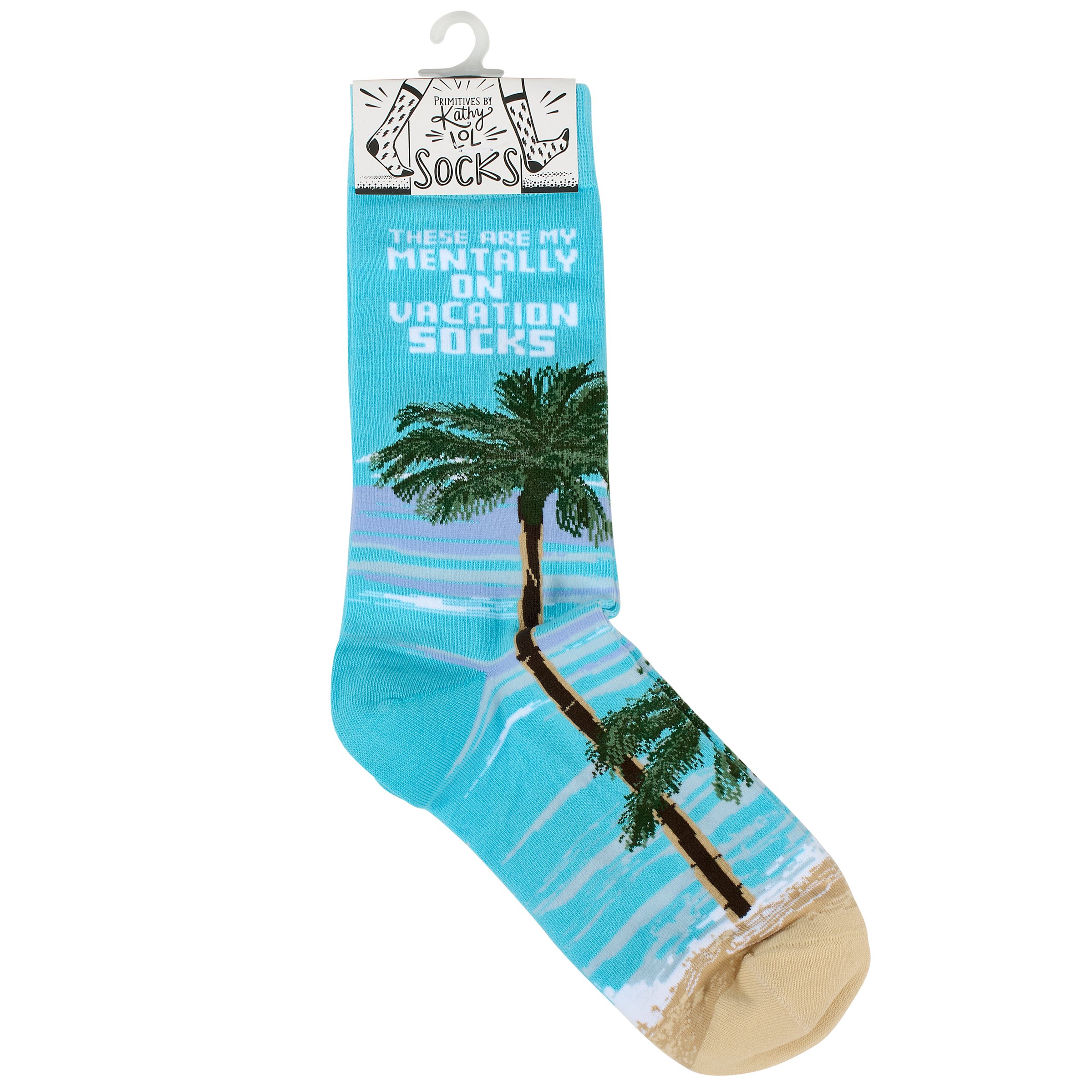A pair of colorful socks from our Beach Collection displaying a playful hand illustrated design of a beach scene with a fun beach inspired sentiment that reads "These Are My Mentally On Vacation Socks." These giftable socks are made with a cotton, nylon, and spandex blend for a one size fits most design. Our My Mentally On Vacation socks come with a decorative header card and a clear plastic hanger for easy rack display and gifting. A fun beach themed gift perfect for everyday self-expression.